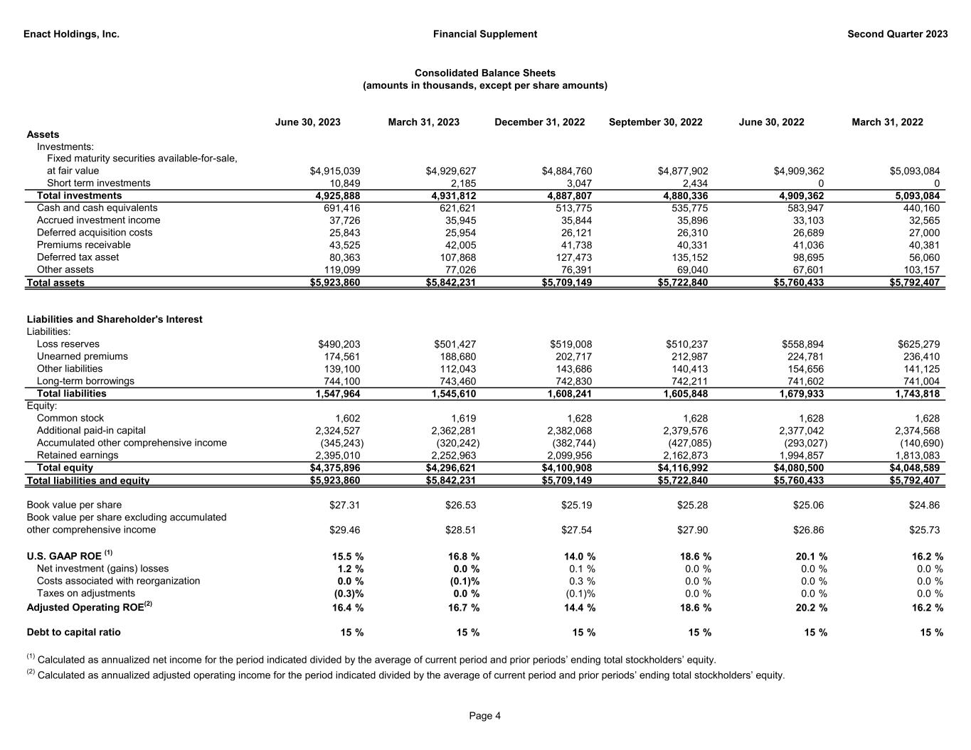 Enact Holdings, Inc. Financial Supplement Second Quarter 2023 June 30, 2023 March 31, 2023 December 31, 2022 September 30, 2022 June 30, 2022 March 31, 2022 Assets Investments: Fixed maturity securities available-for-sale, at fair value $4,915,039 $4,929,627 $4,884,760 $4,877,902 $4,909,362 $5,093,084 Short term investments 10,849 2,185 3,047 2,434 0 0 Total investments 4,925,888 4,931,812 4,887,807 4,880,336 4,909,362 5,093,084 Cash and cash equivalents 691,416 621,621 513,775 535,775 583,947 440,160 Accrued investment income 37,726 35,945 35,844 35,896 33,103 32,565 Deferred acquisition costs 25,843 25,954 26,121 26,310 26,689 27,000 Premiums receivable 43,525 42,005 41,738 40,331 41,036 40,381 Deferred tax asset 80,363 107,868 127,473 135,152 98,695 56,060 Other assets 119,099 77,026 76,391 69,040 67,601 103,157 Total assets $5,923,860 $5,842,231 $5,709,149 $5,722,840 $5,760,433 $5,792,407 Liabilities and Shareholder's Interest Liabilities: Loss reserves $490,203 $501,427 $519,008 $510,237 $558,894 $625,279 Unearned premiums 174,561 188,680 202,717 212,987 224,781 236,410 Other liabilities 139,100 112,043 143,686 140,413 154,656 141,125 Long-term borrowings 744,100 743,460 742,830 742,211 741,602 741,004 Total liabilities 1,547,964 1,545,610 1,608,241 1,605,848 1,679,933 1,743,818 Equity: Common stock 1,602 1,619 1,628 1,628 1,628 1,628 Additional paid-in capital 2,324,527 2,362,281 2,382,068 2,379,576 2,377,042 2,374,568 Accumulated other comprehensive income (345,243) (320,242) (382,744) (427,085) (293,027) (140,690) Retained earnings 2,395,010 2,252,963 2,099,956 2,162,873 1,994,857 1,813,083 Total equity $4,375,896 $4,296,621 $4,100,908 $4,116,992 $4,080,500 $4,048,589 Total liabilities and equity $5,923,860 $5,842,231 $5,709,149 $5,722,840 $5,760,433 $5,792,407 Book value per share $27.31 $26.53 $25.19 $25.28 $25.06 $24.86 Book value per share excluding accumulated other comprehensive income $29.46 $28.51 $27.54 $27.90 $26.86 $25.73 U.S. GAAP ROE (1) 15.5 % 16.8 % 14.0 % 18.6 % 20.1 % 16.2 % Net investment (gains) losses 1.2 % 0.0 % 0.1 % 0.0 % 0.0 % 0.0 % Costs associated with reorganization 0.0 % (0.1)% 0.3 % 0.0 % 0.0 % 0.0 % Taxes on adjustments (0.3)% 0.0 % (0.1)% 0.0 % 0.0 % 0.0 % Adjusted Operating ROE(2) 16.4 % 16.7 % 14.4 % 18.6 % 20.2 % 16.2 % Debt to capital ratio 15 % 15 % 15 % 15 % 15 % 15 % (2) Calculated as annualized adjusted operating income for the period indicated divided by the average of current period and prior periods’ ending total stockholders’ equity. (1) Calculated as annualized net income for the period indicated divided by the average of current period and prior periods’ ending total stockholders’ equity. Consolidated Balance Sheets (amounts in thousands, except per share amounts) Page 4