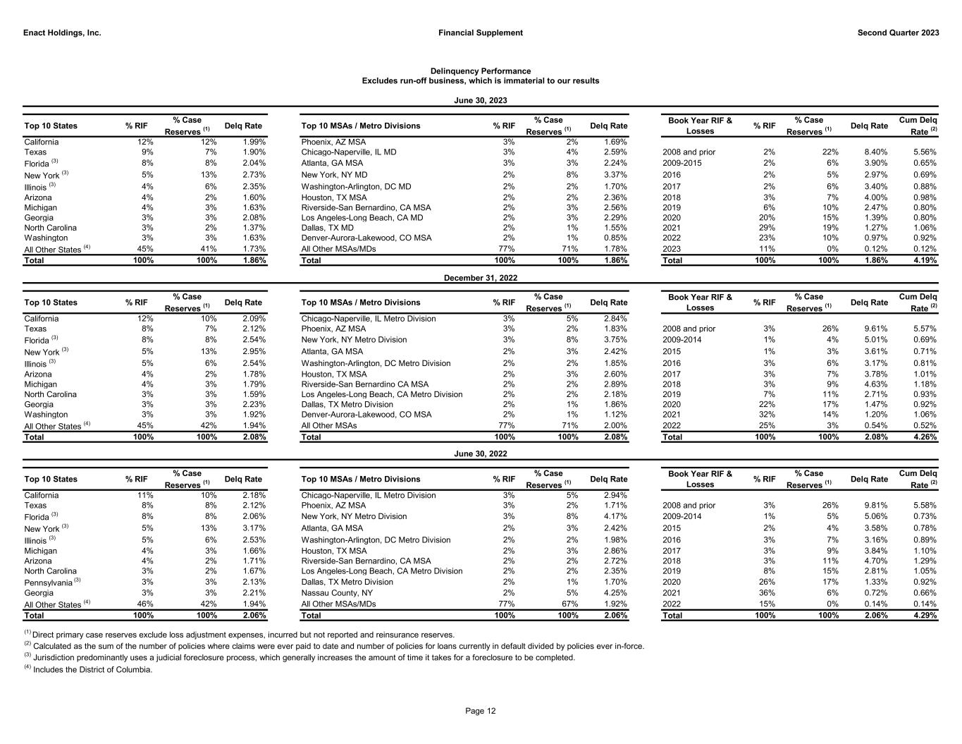 Enact Holdings, Inc. Financial Supplement Second Quarter 2023 Top 10 States % RIF % Case Reserves (1) Delq Rate Top 10 MSAs / Metro Divisions % RIF % Case Reserves (1) Delq Rate Book Year RIF & Losses % RIF % Case Reserves (1) Delq Rate Cum Delq Rate (2) California 12% 12% 1.99% Phoenix, AZ MSA 3% 2% 1.69% Texas 9% 7% 1.90% Chicago-Naperville, IL MD 3% 4% 2.59% 2008 and prior 2% 22% 8.40% 5.56% Florida (3) 8% 8% 2.04% Atlanta, GA MSA 3% 3% 2.24% 2009-2015 2% 6% 3.90% 0.65% New York (3) 5% 13% 2.73% New York, NY MD 2% 8% 3.37% 2016 2% 5% 2.97% 0.69% Illinois (3) 4% 6% 2.35% Washington-Arlington, DC MD 2% 2% 1.70% 2017 2% 6% 3.40% 0.88% Arizona 4% 2% 1.60% Houston, TX MSA 2% 2% 2.36% 2018 3% 7% 4.00% 0.98% Michigan 4% 3% 1.63% Riverside-San Bernardino, CA MSA 2% 3% 2.56% 2019 6% 10% 2.47% 0.80% Georgia 3% 3% 2.08% Los Angeles-Long Beach, CA MD 2% 3% 2.29% 2020 20% 15% 1.39% 0.80% North Carolina 3% 2% 1.37% Dallas, TX MD 2% 1% 1.55% 2021 29% 19% 1.27% 1.06% Washington 3% 3% 1.63% Denver-Aurora-Lakewood, CO MSA 2% 1% 0.85% 2022 23% 10% 0.97% 0.92% All Other States (4) 45% 41% 1.73% All Other MSAs/MDs 77% 71% 1.78% 2023 11% 0% 0.12% 0.12% Total 100% 100% 1.86% Total 100% 100% 1.86% Total 100% 100% 1.86% 4.19% Top 10 States % RIF % Case Reserves (1) Delq Rate Top 10 MSAs / Metro Divisions % RIF % Case Reserves (1) Delq Rate Book Year RIF & Losses % RIF % Case Reserves (1) Delq Rate Cum Delq Rate (2) California 12% 10% 2.09% Chicago-Naperville, IL Metro Division 3% 5% 2.84% Texas 8% 7% 2.12% Phoenix, AZ MSA 3% 2% 1.83% 2008 and prior 3% 26% 9.61% 5.57% Florida (3) 8% 8% 2.54% New York, NY Metro Division 3% 8% 3.75% 2009-2014 1% 4% 5.01% 0.69% New York (3) 5% 13% 2.95% Atlanta, GA MSA 2% 3% 2.42% 2015 1% 3% 3.61% 0.71% Illinois (3) 5% 6% 2.54% Washington-Arlington, DC Metro Division 2% 2% 1.85% 2016 3% 6% 3.17% 0.81% Arizona 4% 2% 1.78% Houston, TX MSA 2% 3% 2.60% 2017 3% 7% 3.78% 1.01% Michigan 4% 3% 1.79% Riverside-San Bernardino CA MSA 2% 2% 2.89% 2018 3% 9% 4.63% 1.18% North Carolina 3% 3% 1.59% Los Angeles-Long Beach, CA Metro Division 2% 2% 2.18% 2019 7% 11% 2.71% 0.93% Georgia 3% 3% 2.23% Dallas, TX Metro Division 2% 1% 1.86% 2020 22% 17% 1.47% 0.92% Washington 3% 3% 1.92% Denver-Aurora-Lakewood, CO MSA 2% 1% 1.12% 2021 32% 14% 1.20% 1.06% All Other States (4) 45% 42% 1.94% All Other MSAs 77% 71% 2.00% 2022 25% 3% 0.54% 0.52% Total 100% 100% 2.08% Total 100% 100% 2.08% Total 100% 100% 2.08% 4.26% Top 10 States % RIF % Case Reserves (1) Delq Rate Top 10 MSAs / Metro Divisions % RIF % Case Reserves (1) Delq Rate Book Year RIF & Losses % RIF % Case Reserves (1) Delq Rate Cum Delq Rate (2) California 11% 10% 2.18% Chicago-Naperville, IL Metro Division 3% 5% 2.94% Texas 8% 8% 2.12% Phoenix, AZ MSA 3% 2% 1.71% 2008 and prior 3% 26% 9.81% 5.58% Florida (3) 8% 8% 2.06% New York, NY Metro Division 3% 8% 4.17% 2009-2014 1% 5% 5.06% 0.73% New York (3) 5% 13% 3.17% Atlanta, GA MSA 2% 3% 2.42% 2015 2% 4% 3.58% 0.78% Illinois (3) 5% 6% 2.53% Washington-Arlington, DC Metro Division 2% 2% 1.98% 2016 3% 7% 3.16% 0.89% Michigan 4% 3% 1.66% Houston, TX MSA 2% 3% 2.86% 2017 3% 9% 3.84% 1.10% Arizona 4% 2% 1.71% Riverside-San Bernardino, CA MSA 2% 2% 2.72% 2018 3% 11% 4.70% 1.29% North Carolina 3% 2% 1.67% Los Angeles-Long Beach, CA Metro Division 2% 2% 2.35% 2019 8% 15% 2.81% 1.05% Pennsylvania (3) 3% 3% 2.13% Dallas, TX Metro Division 2% 1% 1.70% 2020 26% 17% 1.33% 0.92% Georgia 3% 3% 2.21% Nassau County, NY 2% 5% 4.25% 2021 36% 6% 0.72% 0.66% All Other States (4) 46% 42% 1.94% All Other MSAs/MDs 77% 67% 1.92% 2022 15% 0% 0.14% 0.14% Total 100% 100% 2.06% Total 100% 100% 2.06% Total 100% 100% 2.06% 4.29% (4) Includes the District of Columbia. Delinquency Performance Excludes run-off business, which is immaterial to our results June 30, 2023 December 31, 2022 June 30, 2022 (1) Direct primary case reserves exclude loss adjustment expenses, incurred but not reported and reinsurance reserves. (2) Calculated as the sum of the number of policies where claims were ever paid to date and number of policies for loans currently in default divided by policies ever in-force. (3) Jurisdiction predominantly uses a judicial foreclosure process, which generally increases the amount of time it takes for a foreclosure to be completed. Page 12