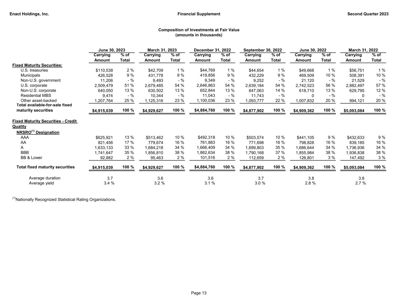 Enact Holdings, Inc. Financial Supplement Second Quarter 2023 Carrying Amount % of Total Carrying Amount % of Total Carrying Amount % of Total Carrying Amount % of Total Carrying Amount % of Total Carrying Amount % of Total Fixed Maturity Securities: U.S. treasuries $110,538 2 % $42,709 1 % $44,769 1 % $44,654 1 % $49,668 1 % $56,751 1 % Municipals 426,528 9 % 431,778 9 % 419,856 9 % 432,229 9 % 469,509 10 % 508,391 10 % Non-U.S. government 11,206 - % 9,493 - % 9,349 - % 9,252 - % 21,120 - % 21,529 - % U.S. corporate 2,509,479 51 % 2,679,485 54 % 2,646,863 54 % 2,639,184 54 % 2,742,523 56 % 2,882,497 57 % Non-U.S. corporate 640,050 13 % 630,502 13 % 652,844 13 % 647,063 14 % 618,710 13 % 629,795 12 % Residential MBS 9,474 - % 10,344 - % 11,043 - % 11,743 - % 0 - % 0 - % Other asset-backed 1,207,764 25 % 1,125,316 23 % 1,100,036 23 % 1,093,777 22 % 1,007,832 20 % 994,121 20 % Total available-for-sale fixed maturity securities $4,915,039 100 % $4,929,627 100 % $4,884,760 100 % $4,877,902 100 % $4,909,362 100 % $5,093,084 100 % Fixed Maturity Securities - Credit Quality NRSRO(1) Designation AAA $625,921 13 % $513,462 10 % $492,318 10 % $503,574 10 % $441,105 9 % $432,633 9 % AA 821,456 17 % 779,674 16 % 761,883 16 % 771,698 16 % 798,828 16 % 839,185 16 % A 1,633,133 33 % 1,684,218 34 % 1,666,409 34 % 1,699,803 35 % 1,686,644 34 % 1,736,936 34 % BBB 1,741,647 35 % 1,856,810 38 % 1,862,634 38 % 1,790,168 37 % 1,855,984 38 % 1,936,838 38 % BB & Lower 92,882 2 % 95,463 2 % 101,516 2 % 112,659 2 % 126,801 3 % 147,492 3 % Total fixed maturity securities $4,915,039 100 % $4,929,627 100 % $4,884,760 100 % $4,877,902 100 % $4,909,362 100 % $5,093,084 100 % Average duration 3.7 3.6 3.6 3.7 3.8 3.8 Average yield 3.4 % 3.2 % 3.1 % 3.0 % 2.8 % 2.7 % (1)Nationally Recognized Statistical Rating Organizations. December 31, 2022 September 30, 2022 Composition of Investments at Fair Value (amounts in thousands) March 31, 2022June 30, 2022June 30, 2023 March 31, 2023 Page 13