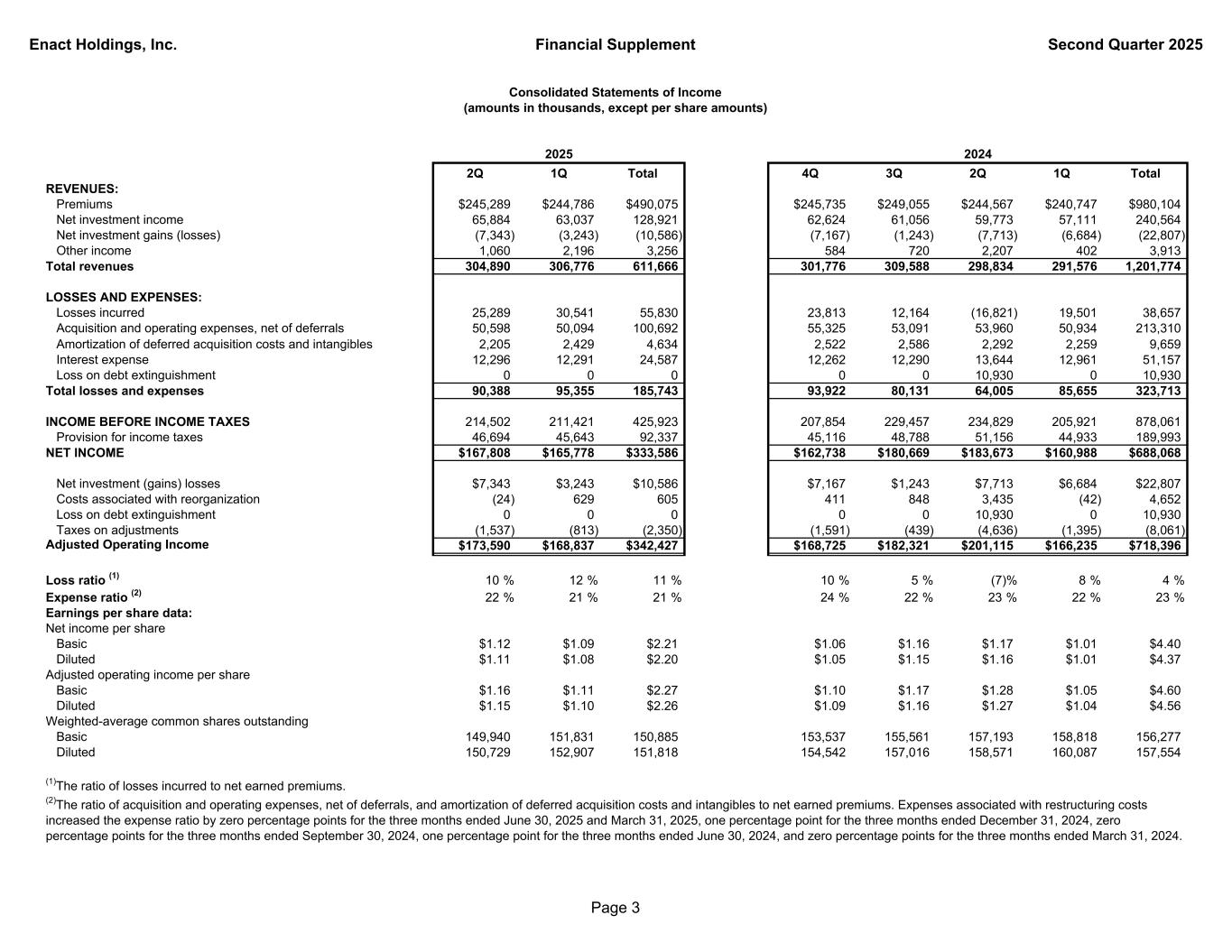 Enact Holdings, Inc. Financial Supplement Second Quarter 2025 2Q 1Q Total 4Q 3Q 2Q 1Q Total REVENUES: Premiums $245,289 $244,786 $490,075 $245,735 $249,055 $244,567 $240,747 $980,104 Net investment income 65,884 63,037 128,921 62,624 61,056 59,773 57,111 240,564 Net investment gains (losses) (7,343) (3,243) (10,586) (7,167) (1,243) (7,713) (6,684) (22,807) Other income 1,060 2,196 3,256 584 720 2,207 402 3,913 Total revenues 304,890 306,776 611,666 301,776 309,588 298,834 291,576 1,201,774 LOSSES AND EXPENSES: Losses incurred 25,289 30,541 55,830 23,813 12,164 (16,821) 19,501 38,657 Acquisition and operating expenses, net of deferrals 50,598 50,094 100,692 55,325 53,091 53,960 50,934 213,310 Amortization of deferred acquisition costs and intangibles 2,205 2,429 4,634 2,522 2,586 2,292 2,259 9,659 Interest expense 12,296 12,291 24,587 12,262 12,290 13,644 12,961 51,157 Loss on debt extinguishment 0 0 0 0 0 10,930 0 10,930 Total losses and expenses 90,388 95,355 185,743 93,922 80,131 64,005 85,655 323,713 INCOME BEFORE INCOME TAXES 214,502 211,421 425,923 207,854 229,457 234,829 205,921 878,061 Provision for income taxes 46,694 45,643 92,337 45,116 48,788 51,156 44,933 189,993 NET INCOME $167,808 $165,778 $333,586 $162,738 $180,669 $183,673 $160,988 $688,068 Net investment (gains) losses $7,343 $3,243 $10,586 $7,167 $1,243 $7,713 $6,684 $22,807 Costs associated with reorganization (24) 629 605 411 848 3,435 (42) 4,652 Loss on debt extinguishment 0 0 0 0 0 10,930 0 10,930 Taxes on adjustments (1,537) (813) (2,350) (1,591) (439) (4,636) (1,395) (8,061) Adjusted Operating Income $173,590 $168,837 $342,427 $168,725 $182,321 $201,115 $166,235 $718,396 Loss ratio (1) 10 % 12 % 11 % 10 % 5 % (7)% 8 % 4 % Expense ratio (2) 22 % 21 % 21 % 24 % 22 % 23 % 22 % 23 % Earnings per share data: Net income per share Basic $1.12 $1.09 $2.21 $1.06 $1.16 $1.17 $1.01 $4.40 Diluted $1.11 $1.08 $2.20 $1.05 $1.15 $1.16 $1.01 $4.37 Adjusted operating income per share Basic $1.16 $1.11 $2.27 $1.10 $1.17 $1.28 $1.05 $4.60 Diluted $1.15 $1.10 $2.26 $1.09 $1.16 $1.27 $1.04 $4.56 Weighted-average common shares outstanding Basic 149,940 151,831 150,885 153,537 155,561 157,193 158,818 156,277 Diluted 150,729 152,907 151,818 154,542 157,016 158,571 160,087 157,554 (2)The ratio of acquisition and operating expenses, net of deferrals, and amortization of deferred acquisition costs and intangibles to net earned premiums. Expenses associated with restructuring costs increased the expense ratio by zero percentage points for the three months ended June 30, 2025 and March 31, 2025, one percentage point for the three months ended December 31, 2024, zero percentage points for the three months ended September 30, 2024, one percentage point for the three months ended June 30, 2024, and zero percentage points for the three months ended March 31, 2024. 2024 (1)The ratio of losses incurred to net earned premiums. Consolidated Statements of Income (amounts in thousands, except per share amounts) 2025 Page 3