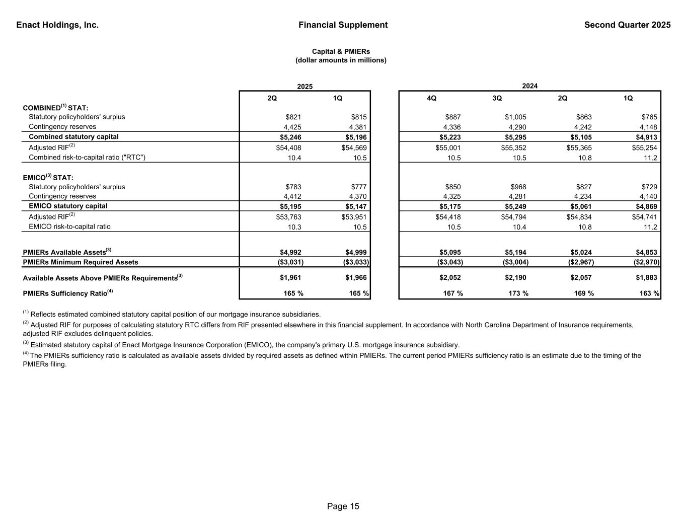 Enact Holdings, Inc. Financial Supplement Second Quarter 2025 2Q 1Q 4Q 3Q 2Q 1Q COMBINED(1) STAT: Statutory policyholders' surplus $821 $815 $887 $1,005 $863 $765 Contingency reserves 4,425 4,381 4,336 4,290 4,242 4,148 Combined statutory capital $5,246 $5,196 $5,223 $5,295 $5,105 $4,913 Adjusted RIF(2) $54,408 $54,569 $55,001 $55,352 $55,365 $55,254 Combined risk-to-capital ratio ("RTC") 10.4 10.5 10.5 10.5 10.8 11.2 EMICO(3) STAT: Statutory policyholders' surplus $783 $777 $850 $968 $827 $729 Contingency reserves 4,412 4,370 4,325 4,281 4,234 4,140 EMICO statutory capital $5,195 $5,147 $5,175 $5,249 $5,061 $4,869 Adjusted RIF(2) $53,763 $53,951 $54,418 $54,794 $54,834 $54,741 EMICO risk-to-capital ratio 10.3 10.5 10.5 10.4 10.8 11.2 PMIERs Available Assets(3) $4,992 $4,999 $5,095 $5,194 $5,024 $4,853 PMIERs Minimum Required Assets ($3,031) ($3,033) ($3,043) ($3,004) ($2,967) ($2,970) Available Assets Above PMIERs Requirements(3) $1,961 $1,966 $2,052 $2,190 $2,057 $1,883 PMIERs Sufficiency Ratio(4) 165 % 165 % 167 % 173 % 169 % 163 % (4) The PMIERs sufficiency ratio is calculated as available assets divided by required assets as defined within PMIERs. The current period PMIERs sufficiency ratio is an estimate due to the timing of the PMIERs filing. 2024 Capital & PMIERs (dollar amounts in millions) (3) Estimated statutory capital of Enact Mortgage Insurance Corporation (EMICO), the company's primary U.S. mortgage insurance subsidiary. (1) Reflects estimated combined statutory capital position of our mortgage insurance subsidiaries. (2) Adjusted RIF for purposes of calculating statutory RTC differs from RIF presented elsewhere in this financial supplement. In accordance with North Carolina Department of Insurance requirements, adjusted RIF excludes delinquent policies. 2025 Page 15