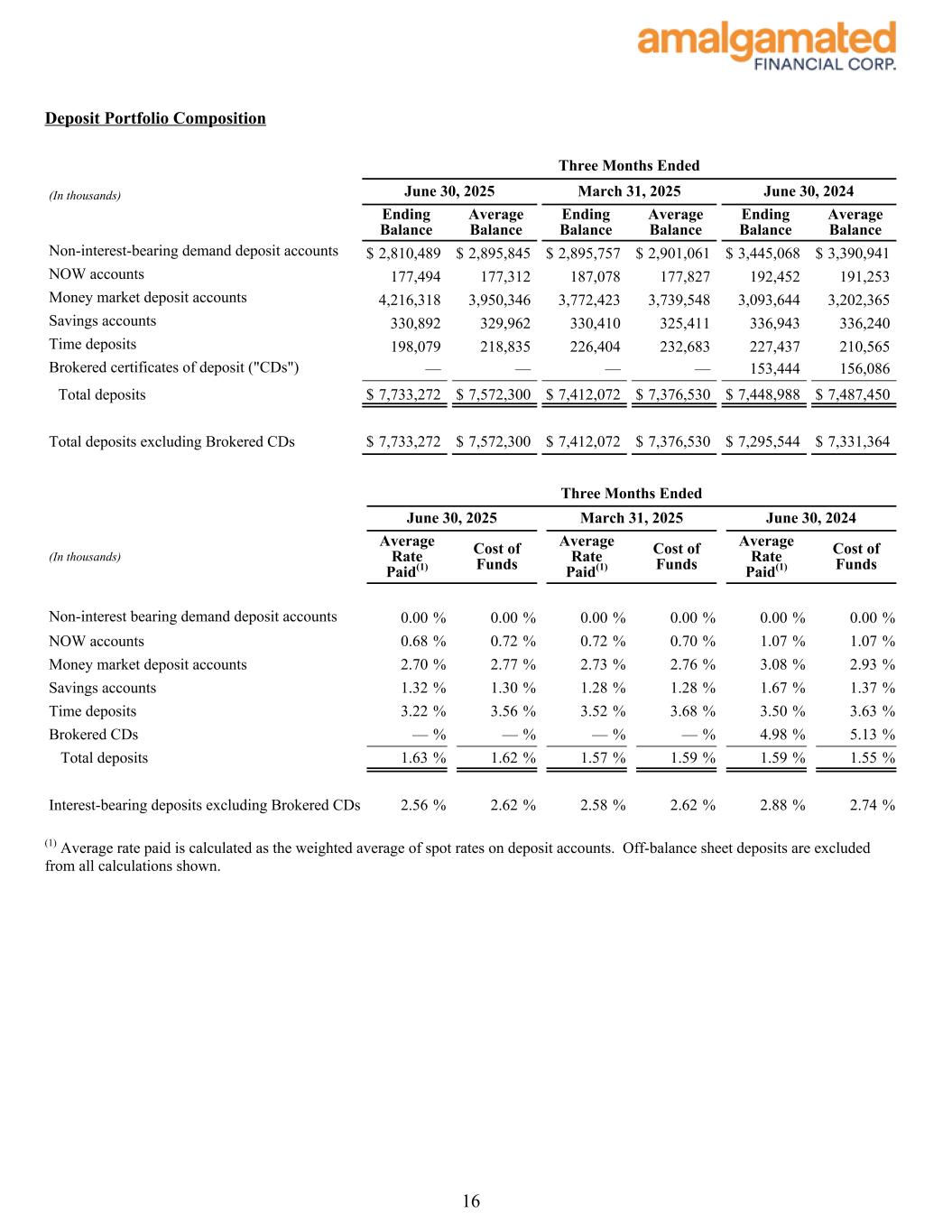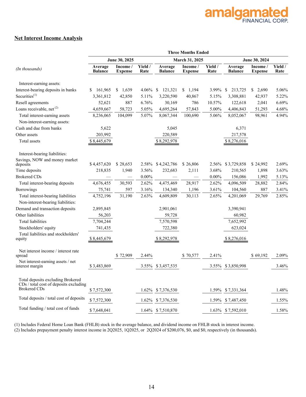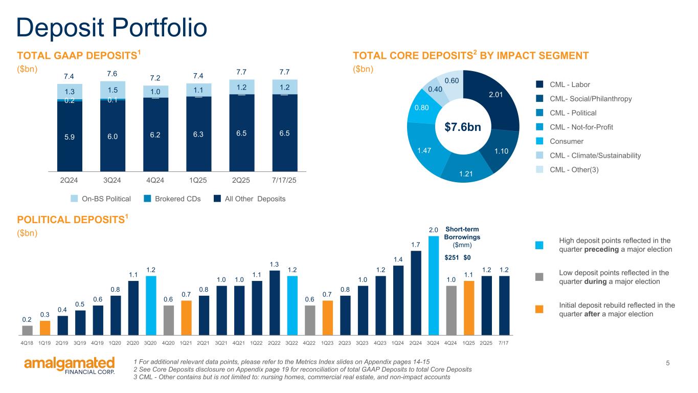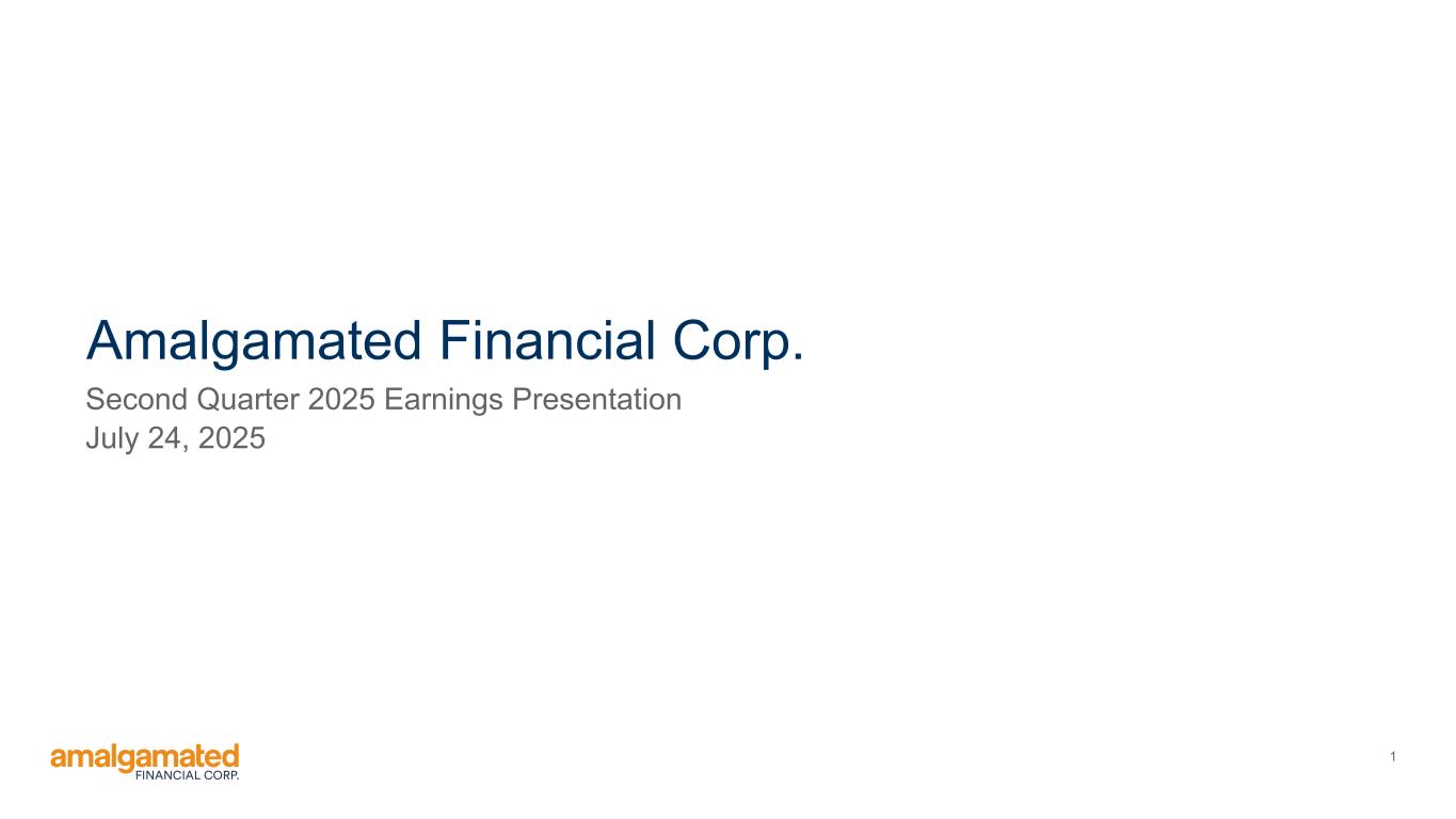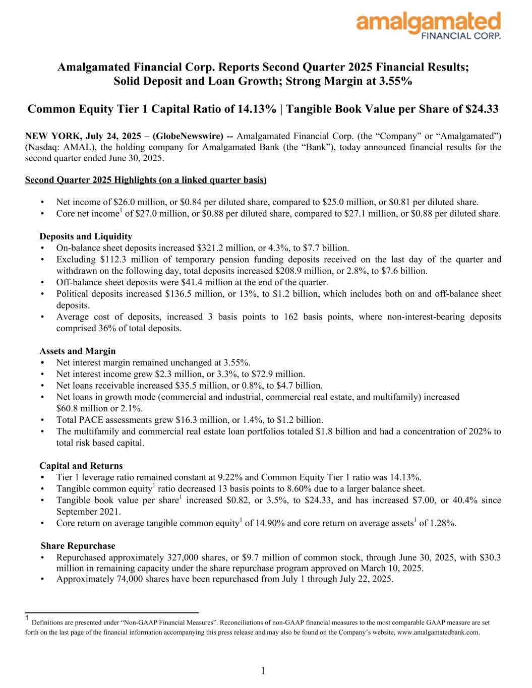 Amalgamated Financial Corp. Reports Second Quarter 2025 Financial Results; Solid Deposit and Loan Growth; Strong Margin at 3.55% Common Equity Tier 1 Capital Ratio of 14.13% | Tangible Book Value per Share of $24.33 NEW YORK, July 24, 2025 – (GlobeNewswire) -- Amalgamated Financial Corp. (the “Company” or “Amalgamated”) (Nasdaq: AMAL), the holding company for Amalgamated Bank (the “Bank”), today announced financial results for the second quarter ended June 30, 2025. Second Quarter 2025 Highlights (on a linked quarter basis) • Net income of $26.0 million, or $0.84 per diluted share, compared to $25.0 million, or $0.81 per diluted share. • Core net income1 of $27.0 million, or $0.88 per diluted share, compared to $27.1 million, or $0.88 per diluted share. Deposits and Liquidity • On-balance sheet deposits increased $321.2 million, or 4.3%, to $7.7 billion. • Excluding $112.3 million of temporary pension funding deposits received on the last day of the quarter and withdrawn on the following day, total deposits increased $208.9 million, or 2.8%, to $7.6 billion. • Off-balance sheet deposits were $41.4 million at the end of the quarter. • Political deposits increased $136.5 million, or 13%, to $1.2 billion, which includes both on and off-balance sheet deposits. • Average cost of deposits, increased 3 basis points to 162 basis points, where non-interest-bearing deposits comprised 36% of total deposits. Assets and Margin • Net interest margin remained unchanged at 3.55%. • Net interest income grew $2.3 million, or 3.3%, to $72.9 million. • Net loans receivable increased $35.5 million, or 0.8%, to $4.7 billion. • Net loans in growth mode (commercial and industrial, commercial real estate, and multifamily) increased $60.8 million or 2.1%. • Total PACE assessments grew $16.3 million, or 1.4%, to $1.2 billion. • The multifamily and commercial real estate loan portfolios totaled $1.8 billion and had a concentration of 202% to total risk based capital. Capital and Returns • Tier 1 leverage ratio remained constant at 9.22% and Common Equity Tier 1 ratio was 14.13%. • Tangible common equity1 ratio decreased 13 basis points to 8.60% due to a larger balance sheet. • Tangible book value per share1 increased $0.82, or 3.5%, to $24.33, and has increased $7.00, or 40.4% since September 2021. • Core return on average tangible common equity1 of 14.90% and core return on average assets1 of 1.28%. Share Repurchase • Repurchased approximately 327,000 shares, or $9.7 million of common stock, through June 30, 2025, with $30.3 million in remaining capacity under the share repurchase program approved on March 10, 2025. • Approximately 74,000 shares have been repurchased from July 1 through July 22, 2025. 1 1 Definitions are presented under “Non-GAAP Financial Measures”. Reconciliations of non-GAAP financial measures to the most comparable GAAP measure are set forth on the last page of the financial information accompanying this press release and may also be found on the Company’s website, www.amalgamatedbank.com.