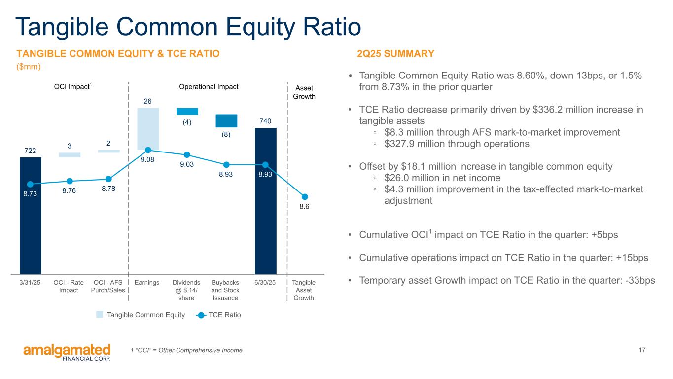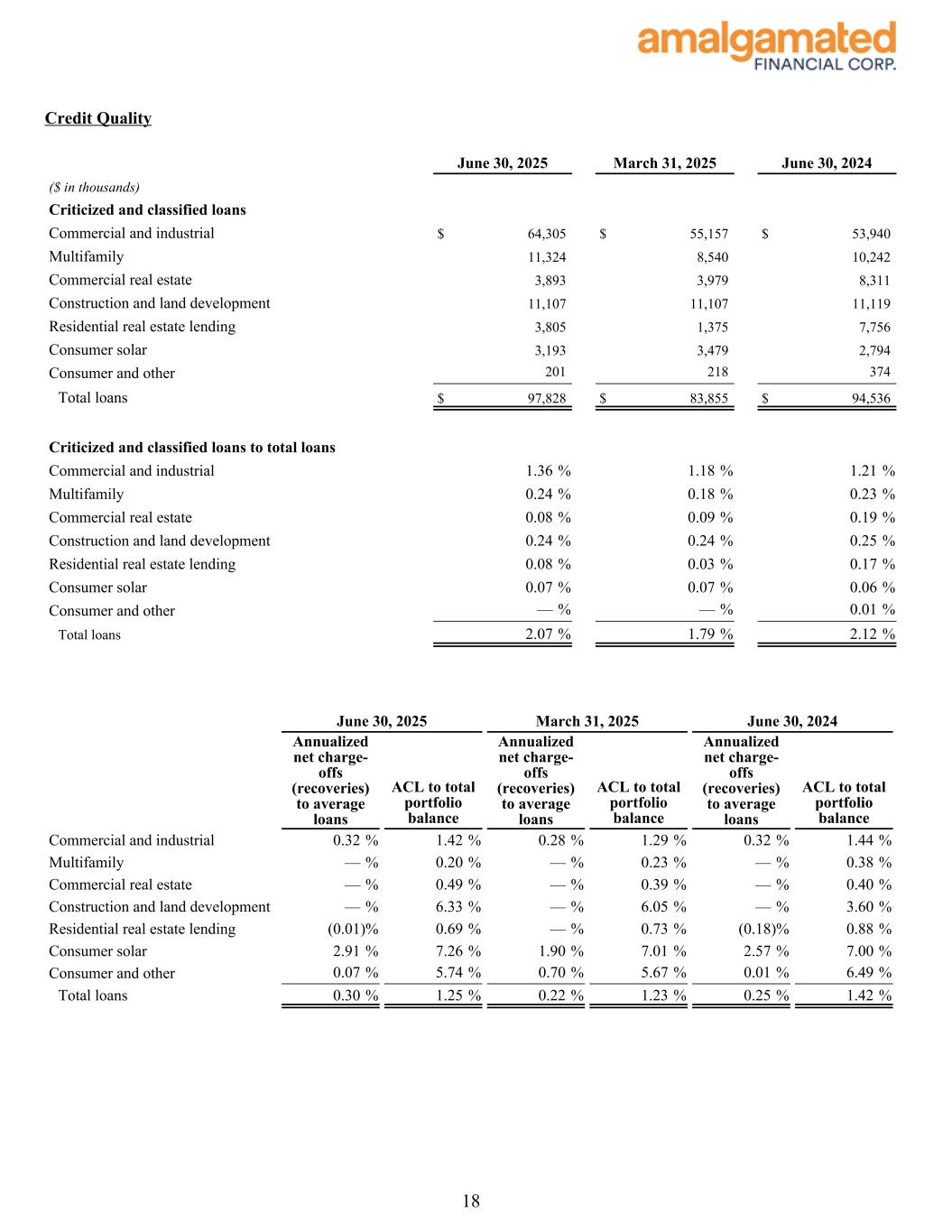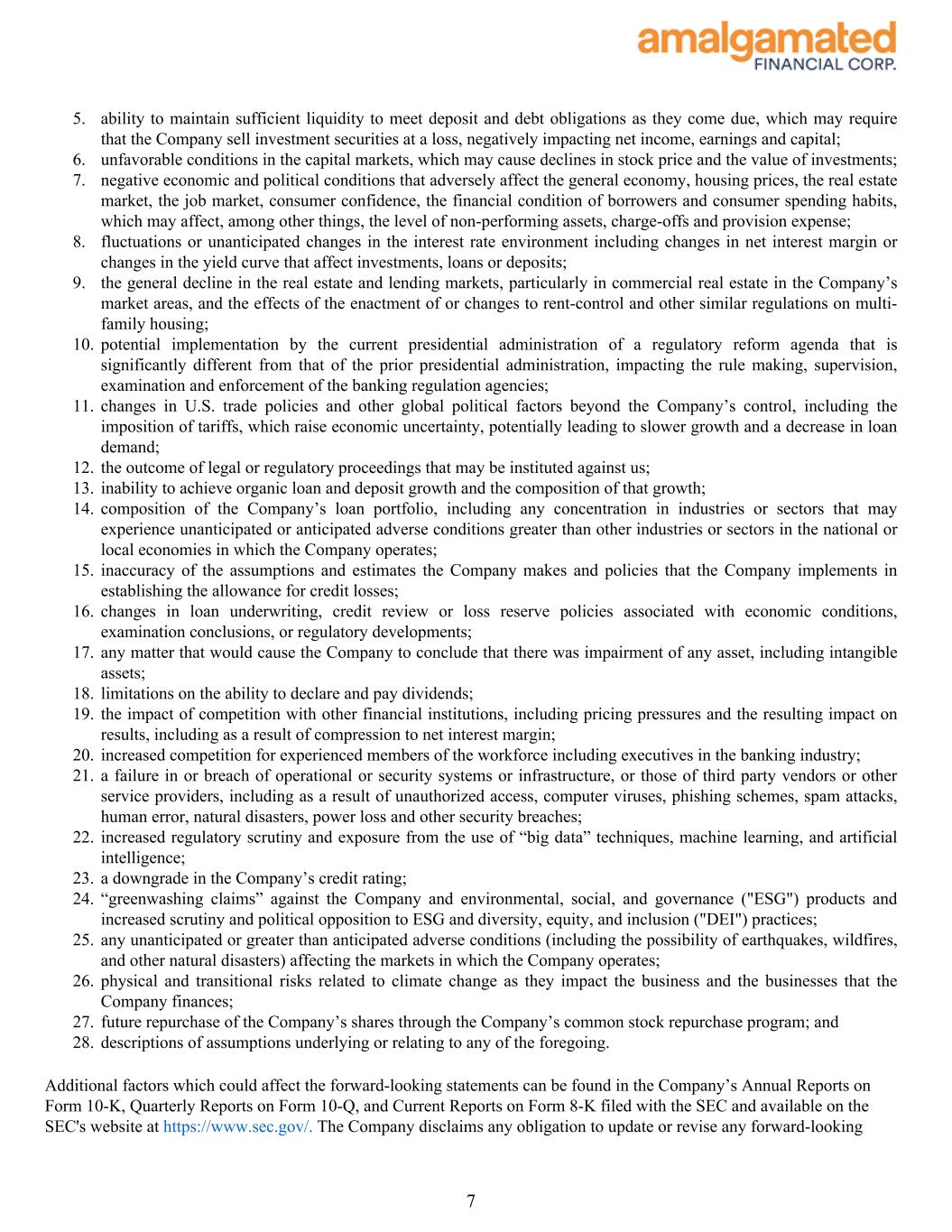 During the quarter, the allowance for credit losses on loans increased $1.3 million to $59.0 million. The ratio of allowance to total loans was 1.25%, an increase of 2 basis points from 1.23% in the first quarter of 2025. This is primarily due to an increase of $2.3 million in reserves for one commercial and industrial loan, along with increases in provision related to the macroeconomic forecasts used in the CECL model. The loan associated with the increased reserve is a commercial and industrial business loan to an originator of consumer loans for renewable energy efficiency improvements. During the quarter, $2.5 million of debtor-in-possession (“DIP”) financing was put in place, a portion of which was advanced and increased our outstanding exposure from $8.3 million to $9.3 million as of June 30, 2025. Additionally, during the third quarter, the remainder of the DIP financing was advanced bringing the total exposure to $10.8 million as of the date of this earnings release. While there remains collateral value, the situation with this loan is fluid and could result in further reserves as the workout progresses. Capital Quarterly Summary As of June 30, 2025, the Common Equity Tier 1 Capital ratio was 14.13%, the Total Risk-Based Capital ratio was 16.43%, and the Tier 1 Leverage Capital ratio was 9.22%, compared to 14.27%, 16.61% and 9.22%, respectively, as of March 31, 2025. Stockholders’ equity at June 30, 2025 was $754.0 million, an increase of $18.0 million during the quarter. The increase in stockholders’ equity was primarily driven by $26.0 million of net income for the quarter and a $4.3 million improvement in accumulated other comprehensive loss due to the tax-effected mark-to-market on available for sale securities, offset by $9.7 million in share buybacks and $4.4 million in dividends paid at $0.14 per outstanding share. Tangible book value per share1 was $24.33 as of June 30, 2025 compared to $23.51 as of March 31, 2025. Tangible common equity1 improved to 8.60% of tangible assets, compared to 8.73% as of March 31, 2025. Conference Call As previously announced, Amalgamated Financial Corp. will host a conference call to discuss its second quarter 2025 results today, July 24, 2025 at 11:00am (Eastern Time). The conference call can be accessed by dialing 1-877-407-9716 (domestic) or 1-201-493-6779 (international) and asking for the Amalgamated Financial Corp. Second Quarter 2025 Earnings Call. A telephonic replay will be available approximately two hours after the call and can be accessed by dialing 1-844-512-2921, or for international callers 1-412-317-6671 and providing the access code 13754662. The telephonic replay will be available until July 31, 2025. Interested investors and other parties may also listen to a simultaneous webcast of the conference call by logging onto the investor relations section of the Company’s website at https://ir.amalgamatedbank.com/. The online replay will remain available for a limited time beginning immediately following the call. The presentation materials for the call can be accessed on the investor relations section of the Company’s website at https:// ir.amalgamatedbank.com/. 4