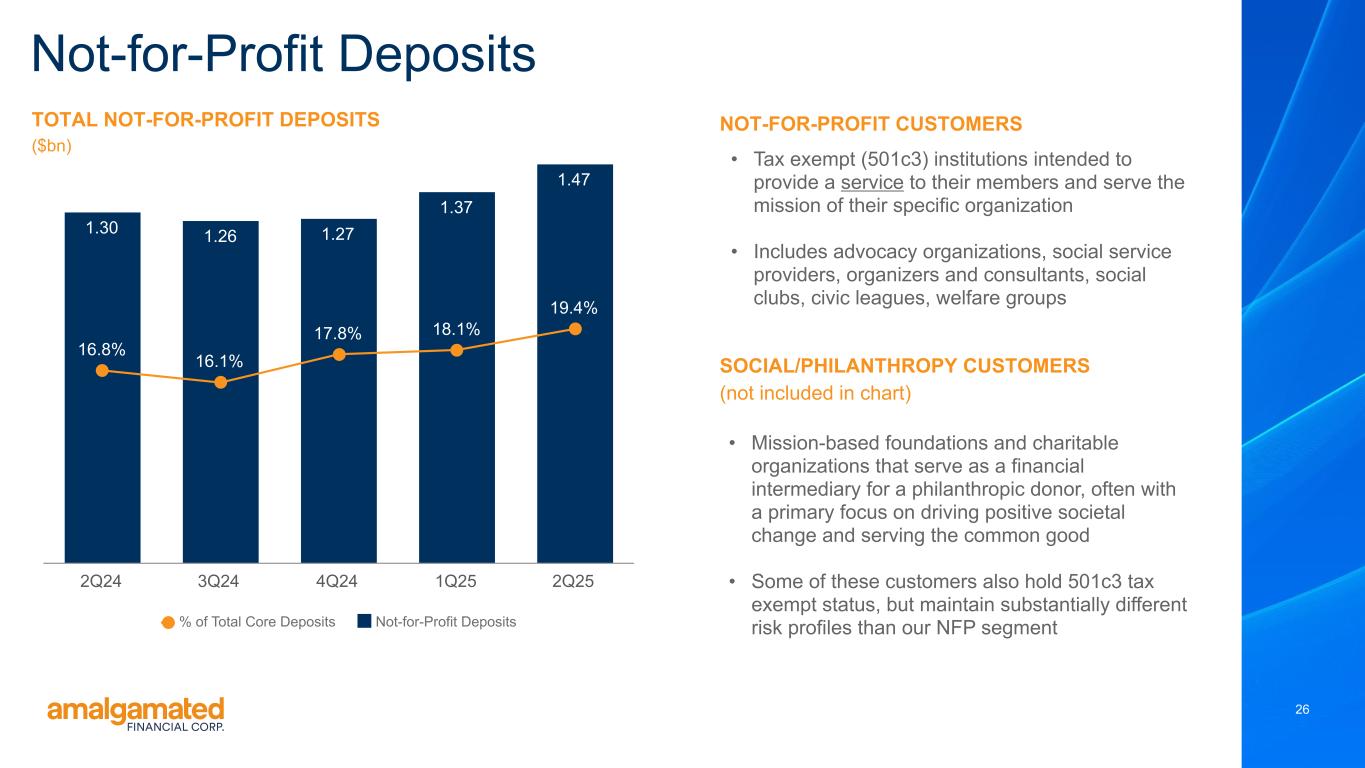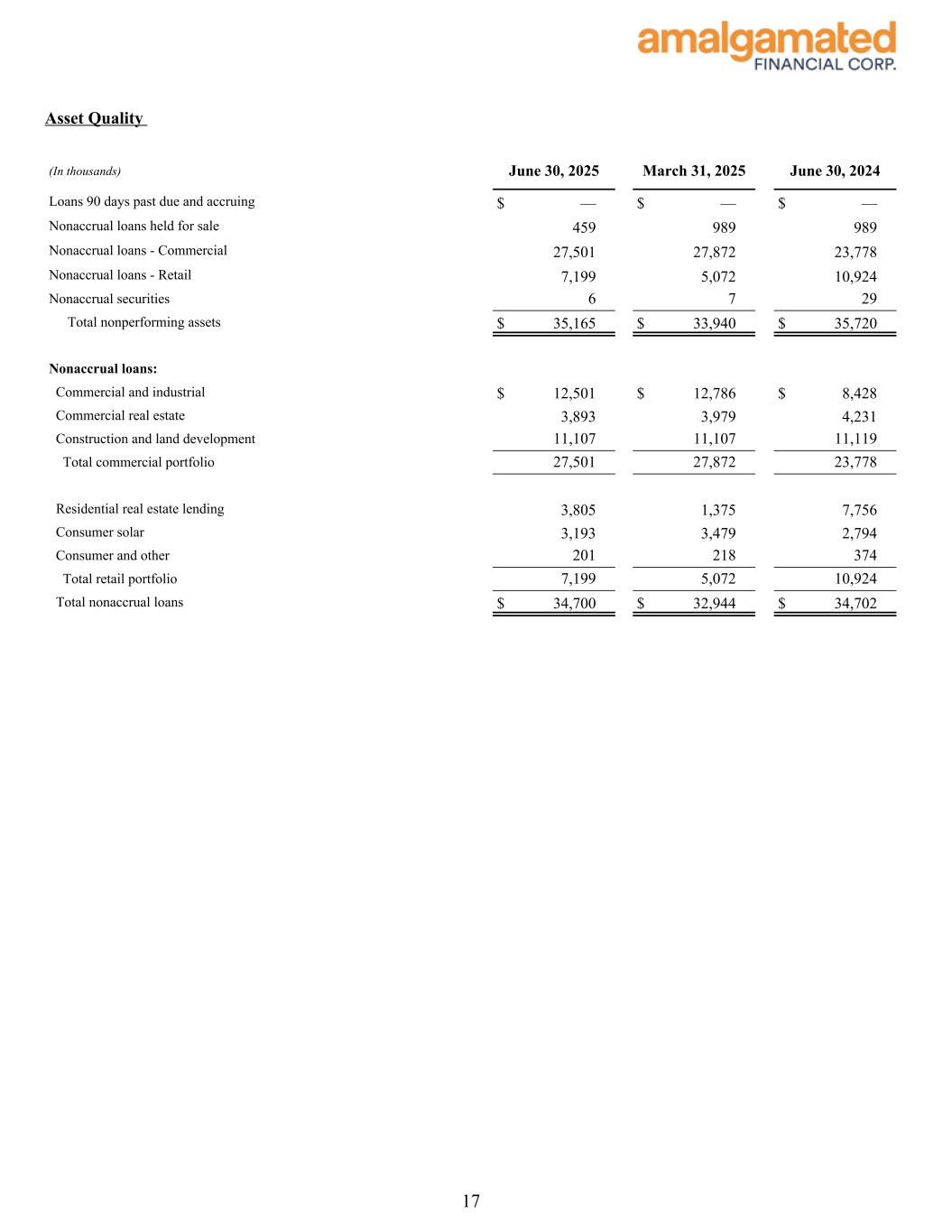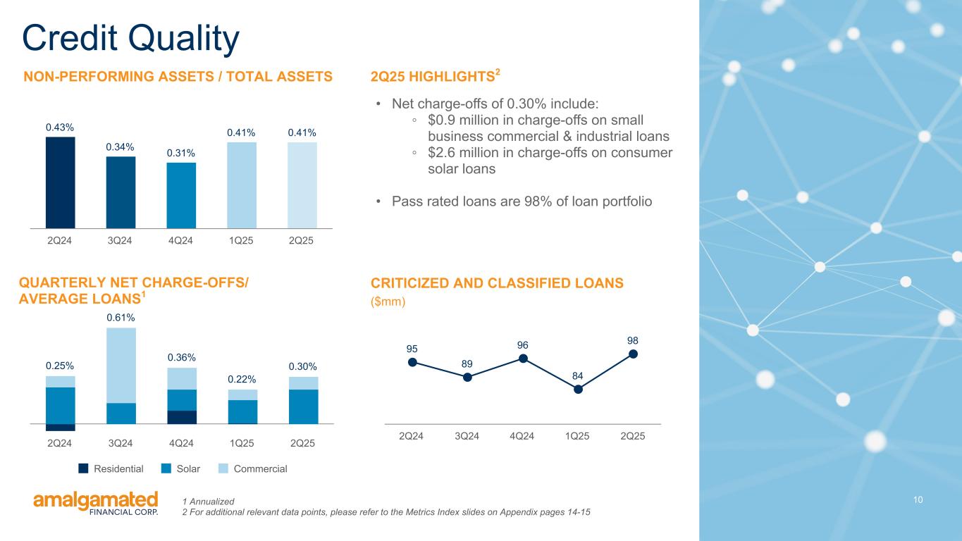 During the quarter, the allowance for credit losses on loans increased $1.3 million to $59.0 million. The ratio of allowance to total loans was 1.25%, an increase of 2 basis points from 1.23% in the first quarter of 2025. This is primarily due to an increase of $2.3 million in reserves for one commercial and industrial loan, along with increases in provision related to the macroeconomic forecasts used in the CECL model. The loan associated with the increased reserve is a commercial and industrial business loan to an originator of consumer loans for renewable energy efficiency improvements. During the quarter, $2.5 million of debtor-in-possession (“DIP”) financing was put in place, a portion of which was advanced and increased our outstanding exposure from $8.3 million to $9.3 million as of June 30, 2025. Additionally, during the third quarter, the remainder of the DIP financing was advanced bringing the total exposure to $10.8 million as of the date of this earnings release. While there remains collateral value, the situation with this loan is fluid and could result in further reserves as the workout progresses. Capital Quarterly Summary As of June 30, 2025, the Common Equity Tier 1 Capital ratio was 14.13%, the Total Risk-Based Capital ratio was 16.43%, and the Tier 1 Leverage Capital ratio was 9.22%, compared to 14.27%, 16.61% and 9.22%, respectively, as of March 31, 2025. Stockholders’ equity at June 30, 2025 was $754.0 million, an increase of $18.0 million during the quarter. The increase in stockholders’ equity was primarily driven by $26.0 million of net income for the quarter and a $4.3 million improvement in accumulated other comprehensive loss due to the tax-effected mark-to-market on available for sale securities, offset by $9.7 million in share buybacks and $4.4 million in dividends paid at $0.14 per outstanding share. Tangible book value per share1 was $24.33 as of June 30, 2025 compared to $23.51 as of March 31, 2025. Tangible common equity1 improved to 8.60% of tangible assets, compared to 8.73% as of March 31, 2025. Conference Call As previously announced, Amalgamated Financial Corp. will host a conference call to discuss its second quarter 2025 results today, July 24, 2025 at 11:00am (Eastern Time). The conference call can be accessed by dialing 1-877-407-9716 (domestic) or 1-201-493-6779 (international) and asking for the Amalgamated Financial Corp. Second Quarter 2025 Earnings Call. A telephonic replay will be available approximately two hours after the call and can be accessed by dialing 1-844-512-2921, or for international callers 1-412-317-6671 and providing the access code 13754662. The telephonic replay will be available until July 31, 2025. Interested investors and other parties may also listen to a simultaneous webcast of the conference call by logging onto the investor relations section of the Company’s website at https://ir.amalgamatedbank.com/. The online replay will remain available for a limited time beginning immediately following the call. The presentation materials for the call can be accessed on the investor relations section of the Company’s website at https:// ir.amalgamatedbank.com/. 4