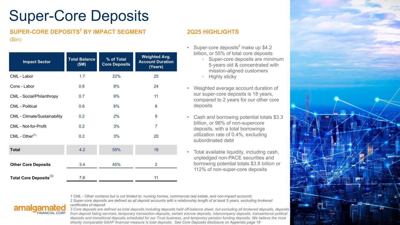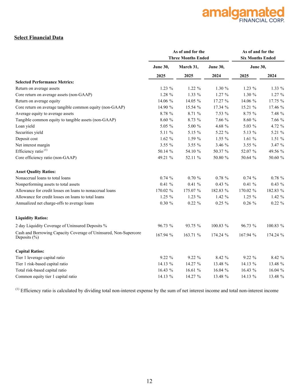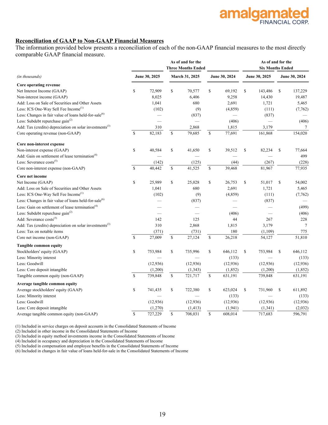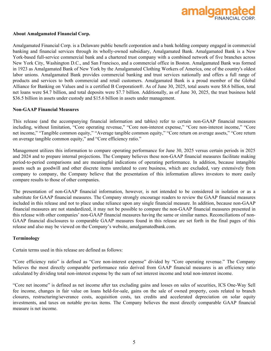 About Amalgamated Financial Corp. Amalgamated Financial Corp. is a Delaware public benefit corporation and a bank holding company engaged in commercial banking and financial services through its wholly-owned subsidiary, Amalgamated Bank. Amalgamated Bank is a New York-based full-service commercial bank and a chartered trust company with a combined network of five branches across New York City, Washington D.C., and San Francisco, and a commercial office in Boston. Amalgamated Bank was formed in 1923 as Amalgamated Bank of New York by the Amalgamated Clothing Workers of America, one of the country's oldest labor unions. Amalgamated Bank provides commercial banking and trust services nationally and offers a full range of products and services to both commercial and retail customers. Amalgamated Bank is a proud member of the Global Alliance for Banking on Values and is a certified B Corporation®. As of June 30, 2025, total assets were $8.6 billion, total net loans were $4.7 billion, and total deposits were $7.7 billion. Additionally, as of June 30, 2025, the trust business held $36.5 billion in assets under custody and $15.6 billion in assets under management. Non-GAAP Financial Measures This release (and the accompanying financial information and tables) refer to certain non-GAAP financial measures including, without limitation, “Core operating revenue,” “Core non-interest expense,” “Core non-interest income,” “Core net income,” “Tangible common equity,” “Average tangible common equity,” “Core return on average assets,” “Core return on average tangible common equity,” and “Core efficiency ratio.” Management utilizes this information to compare operating performance for June 30, 2025 versus certain periods in 2025 and 2024 and to prepare internal projections. The Company believes these non-GAAP financial measures facilitate making period-to-period comparisons and are meaningful indications of operating performance. In addition, because intangible assets such as goodwill and other discrete items unrelated to core business, which are excluded, vary extensively from company to company, the Company believe that the presentation of this information allows investors to more easily compare results to those of other companies. The presentation of non-GAAP financial information, however, is not intended to be considered in isolation or as a substitute for GAAP financial measures. The Company strongly encourage readers to review the GAAP financial measures included in this release and not to place undue reliance upon any single financial measure. In addition, because non-GAAP financial measures are not standardized, it may not be possible to compare the non-GAAP financial measures presented in this release with other companies’ non-GAAP financial measures having the same or similar names. Reconciliations of non- GAAP financial disclosures to comparable GAAP measures found in this release are set forth in the final pages of this release and also may be viewed on the Company’s website, amalgamatedbank.com. Terminology Certain terms used in this release are defined as follows: “Core efficiency ratio” is defined as “Core non-interest expense” divided by “Core operating revenue.” The Company believes the most directly comparable performance ratio derived from GAAP financial measures is an efficiency ratio calculated by dividing total non-interest expense by the sum of net interest income and total non-interest income. “Core net income” is defined as net income after tax excluding gains and losses on sales of securities, ICS One-Way Sell fee income, changes in fair value on loans held-for-sale, gains on the sale of owned property, costs related to branch closures, restructuring/severance costs, acquisition costs, tax credits and accelerated depreciation on solar equity investments, and taxes on notable pre-tax items. The Company believes the most directly comparable GAAP financial measure is net income. 5