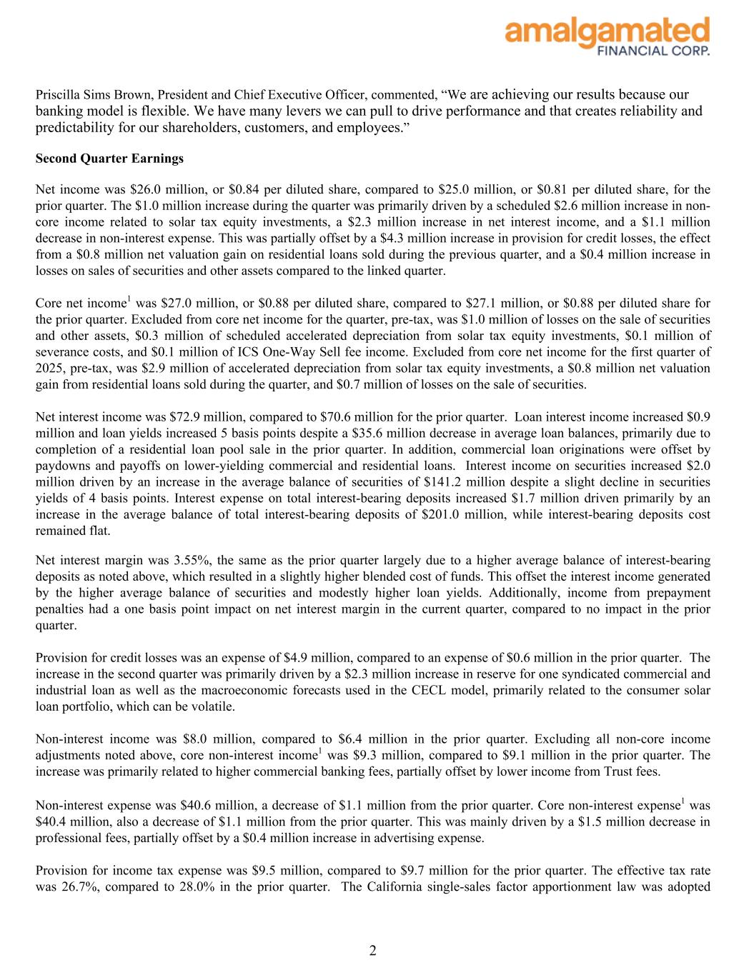 Priscilla Sims Brown, President and Chief Executive Officer, commented, “We are achieving our results because our banking model is flexible. We have many levers we can pull to drive performance and that creates reliability and predictability for our shareholders, customers, and employees.” Second Quarter Earnings Net income was $26.0 million, or $0.84 per diluted share, compared to $25.0 million, or $0.81 per diluted share, for the prior quarter. The $1.0 million increase during the quarter was primarily driven by a scheduled $2.6 million increase in non- core income related to solar tax equity investments, a $2.3 million increase in net interest income, and a $1.1 million decrease in non-interest expense. This was partially offset by a $4.3 million increase in provision for credit losses, the effect from a $0.8 million net valuation gain on residential loans sold during the previous quarter, and a $0.4 million increase in losses on sales of securities and other assets compared to the linked quarter. Core net income1 was $27.0 million, or $0.88 per diluted share, compared to $27.1 million, or $0.88 per diluted share for the prior quarter. Excluded from core net income for the quarter, pre-tax, was $1.0 million of losses on the sale of securities and other assets, $0.3 million of scheduled accelerated depreciation from solar tax equity investments, $0.1 million of severance costs, and $0.1 million of ICS One-Way Sell fee income. Excluded from core net income for the first quarter of 2025, pre-tax, was $2.9 million of accelerated depreciation from solar tax equity investments, a $0.8 million net valuation gain from residential loans sold during the quarter, and $0.7 million of losses on the sale of securities. Net interest income was $72.9 million, compared to $70.6 million for the prior quarter. Loan interest income increased $0.9 million and loan yields increased 5 basis points despite a $35.6 million decrease in average loan balances, primarily due to completion of a residential loan pool sale in the prior quarter. In addition, commercial loan originations were offset by paydowns and payoffs on lower-yielding commercial and residential loans. Interest income on securities increased $2.0 million driven by an increase in the average balance of securities of $141.2 million despite a slight decline in securities yields of 4 basis points. Interest expense on total interest-bearing deposits increased $1.7 million driven primarily by an increase in the average balance of total interest-bearing deposits of $201.0 million, while interest-bearing deposits cost remained flat. Net interest margin was 3.55%, the same as the prior quarter largely due to a higher average balance of interest-bearing deposits as noted above, which resulted in a slightly higher blended cost of funds. This offset the interest income generated by the higher average balance of securities and modestly higher loan yields. Additionally, income from prepayment penalties had a one basis point impact on net interest margin in the current quarter, compared to no impact in the prior quarter. Provision for credit losses was an expense of $4.9 million, compared to an expense of $0.6 million in the prior quarter. The increase in the second quarter was primarily driven by a $2.3 million increase in reserve for one syndicated commercial and industrial loan as well as the macroeconomic forecasts used in the CECL model, primarily related to the consumer solar loan portfolio, which can be volatile. Non-interest income was $8.0 million, compared to $6.4 million in the prior quarter. Excluding all non-core income adjustments noted above, core non-interest income1 was $9.3 million, compared to $9.1 million in the prior quarter. The increase was primarily related to higher commercial banking fees, partially offset by lower income from Trust fees. Non-interest expense was $40.6 million, a decrease of $1.1 million from the prior quarter. Core non-interest expense1 was $40.4 million, also a decrease of $1.1 million from the prior quarter. This was mainly driven by a $1.5 million decrease in professional fees, partially offset by a $0.4 million increase in advertising expense. Provision for income tax expense was $9.5 million, compared to $9.7 million for the prior quarter. The effective tax rate was 26.7%, compared to 28.0% in the prior quarter. The California single-sales factor apportionment law was adopted 2