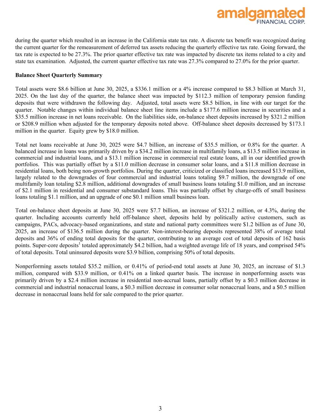 during the quarter which resulted in an increase in the California state tax rate. A discrete tax benefit was recognized during the current quarter for the remeasurement of deferred tax assets reducing the quarterly effective tax rate. Going forward, the tax rate is expected to be 27.3%. The prior quarter effective tax rate was impacted by discrete tax items related to a city and state tax examination. Adjusted, the current quarter effective tax rate was 27.3% compared to 27.0% for the prior quarter. Balance Sheet Quarterly Summary Total assets were $8.6 billion at June 30, 2025, a $336.1 million or a 4% increase compared to $8.3 billion at March 31, 2025. On the last day of the quarter, the balance sheet was impacted by $112.3 million of temporary pension funding deposits that were withdrawn the following day. Adjusted, total assets were $8.5 billion, in line with our target for the quarter. Notable changes within individual balance sheet line items include a $177.6 million increase in securities and a $35.5 million increase in net loans receivable. On the liabilities side, on-balance sheet deposits increased by $321.2 million or $208.9 million when adjusted for the temporary deposits noted above. Off-balance sheet deposits decreased by $173.1 million in the quarter. Equity grew by $18.0 million. Total net loans receivable at June 30, 2025 were $4.7 billion, an increase of $35.5 million, or 0.8% for the quarter. A balanced increase in loans was primarily driven by a $34.2 million increase in multifamily loans, a $13.5 million increase in commercial and industrial loans, and a $13.1 million increase in commercial real estate loans, all in our identified growth portfolios. This was partially offset by a $11.0 million decrease in consumer solar loans, and a $11.8 million decrease in residential loans, both being non-growth portfolios. During the quarter, criticized or classified loans increased $13.9 million, largely related to the downgrades of four commercial and industrial loans totaling $9.7 million, the downgrade of one multifamily loan totaling $2.8 million, additional downgrades of small business loans totaling $1.0 million, and an increase of $2.1 million in residential and consumer substandard loans. This was partially offset by charge-offs of small business loans totaling $1.1 million, and an upgrade of one $0.1 million small business loan. Total on-balance sheet deposits at June 30, 2025 were $7.7 billion, an increase of $321.2 million, or 4.3%, during the quarter. Including accounts currently held off-balance sheet, deposits held by politically active customers, such as campaigns, PACs, advocacy-based organizations, and state and national party committees were $1.2 billion as of June 30, 2025, an increase of $136.5 million during the quarter. Non-interest-bearing deposits represented 38% of average total deposits and 36% of ending total deposits for the quarter, contributing to an average cost of total deposits of 162 basis points. Super-core deposits1 totaled approximately $4.2 billion, had a weighted average life of 18 years, and comprised 54% of total deposits. Total uninsured deposits were $3.9 billion, comprising 50% of total deposits. Nonperforming assets totaled $35.2 million, or 0.41% of period-end total assets at June 30, 2025, an increase of $1.3 million, compared with $33.9 million, or 0.41% on a linked quarter basis. The increase in nonperforming assets was primarily driven by a $2.4 million increase in residential non-accrual loans, partially offset by a $0.3 million decrease in commercial and industrial nonaccrual loans, a $0.3 million decrease in consumer solar nonaccrual loans, and a $0.5 million decrease in nonaccrual loans held for sale compared to the prior quarter. 3