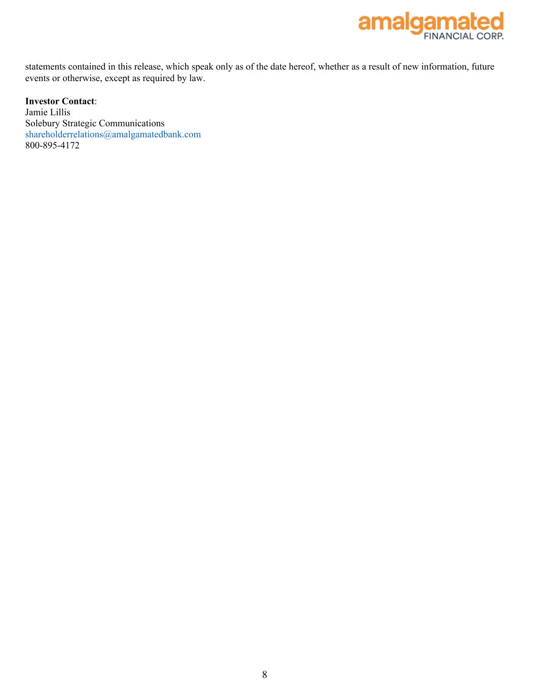 statements contained in this release, which speak only as of the date hereof, whether as a result of new information, future events or otherwise, except as required by law. Investor Contact: Jamie Lillis Solebury Strategic Communications shareholderrelations@amalgamatedbank.com 800-895-4172 8