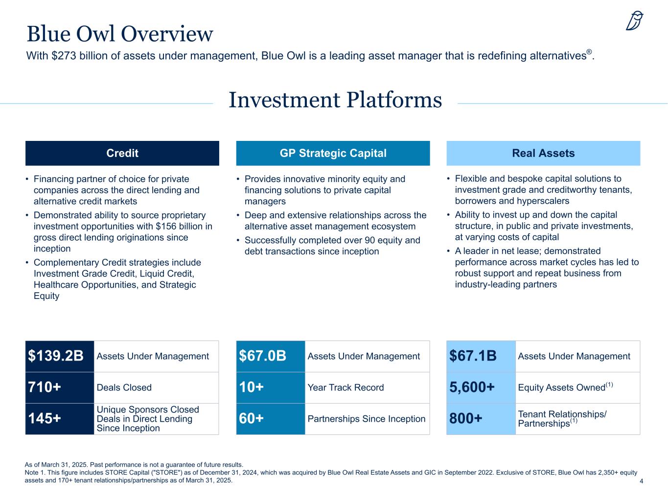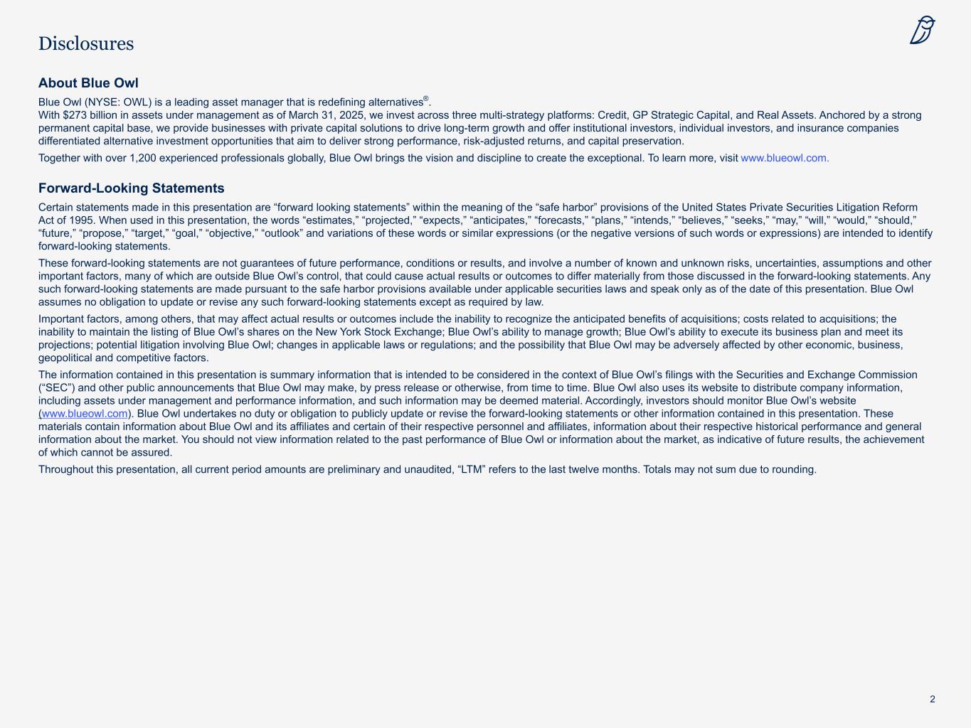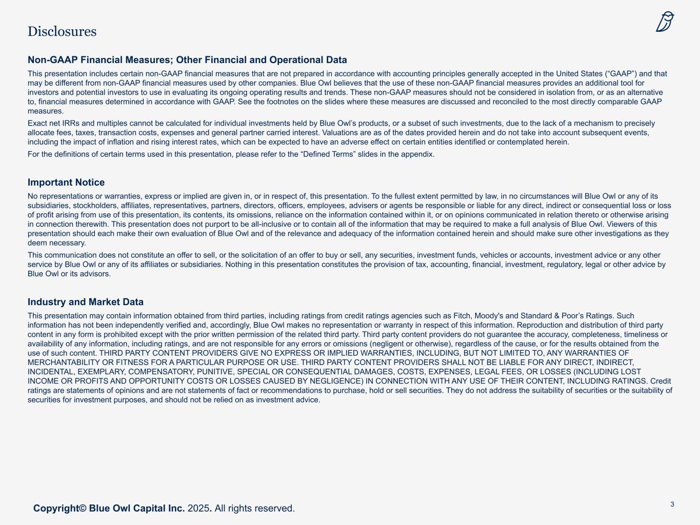 2 About Blue Owl Blue Owl (NYSE: OWL) is a leading asset manager that is redefining alternatives®. With $273 billion in assets under management as of March 31, 2025, we invest across three multi-strategy platforms: Credit, GP Strategic Capital, and Real Assets. Anchored by a strong permanent capital base, we provide businesses with private capital solutions to drive long-term growth and offer institutional investors, individual investors, and insurance companies differentiated alternative investment opportunities that aim to deliver strong performance, risk-adjusted returns, and capital preservation. Together with over 1,200 experienced professionals globally, Blue Owl brings the vision and discipline to create the exceptional. To learn more, visit www.blueowl.com. Forward-Looking Statements Certain statements made in this presentation are “forward looking statements” within the meaning of the “safe harbor” provisions of the United States Private Securities Litigation Reform Act of 1995. When used in this presentation, the words “estimates,” “projected,” “expects,” “anticipates,” “forecasts,” “plans,” “intends,” “believes,” “seeks,” “may,” “will,” “would,” “should,” “future,” “propose,” “target,” “goal,” “objective,” “outlook” and variations of these words or similar expressions (or the negative versions of such words or expressions) are intended to identify forward-looking statements. These forward-looking statements are not guarantees of future performance, conditions or results, and involve a number of known and unknown risks, uncertainties, assumptions and other important factors, many of which are outside Blue Owl’s control, that could cause actual results or outcomes to differ materially from those discussed in the forward-looking statements. Any such forward-looking statements are made pursuant to the safe harbor provisions available under applicable securities laws and speak only as of the date of this presentation. Blue Owl assumes no obligation to update or revise any such forward-looking statements except as required by law. Important factors, among others, that may affect actual results or outcomes include the inability to recognize the anticipated benefits of acquisitions; costs related to acquisitions; the inability to maintain the listing of Blue Owl’s shares on the New York Stock Exchange; Blue Owl’s ability to manage growth; Blue Owl’s ability to execute its business plan and meet its projections; potential litigation involving Blue Owl; changes in applicable laws or regulations; and the possibility that Blue Owl may be adversely affected by other economic, business, geopolitical and competitive factors. The information contained in this presentation is summary information that is intended to be considered in the context of Blue Owl’s filings with the Securities and Exchange Commission (“SEC”) and other public announcements that Blue Owl may make, by press release or otherwise, from time to time. Blue Owl also uses its website to distribute company information, including assets under management and performance information, and such information may be deemed material. Accordingly, investors should monitor Blue Owl’s website (www.blueowl.com). Blue Owl undertakes no duty or obligation to publicly update or revise the forward-looking statements or other information contained in this presentation. These materials contain information about Blue Owl and its affiliates and certain of their respective personnel and affiliates, information about their respective historical performance and general information about the market. You should not view information related to the past performance of Blue Owl or information about the market, as indicative of future results, the achievement of which cannot be assured. Throughout this presentation, all current period amounts are preliminary and unaudited, “LTM” refers to the last twelve months. Totals may not sum due to rounding. Disclosures