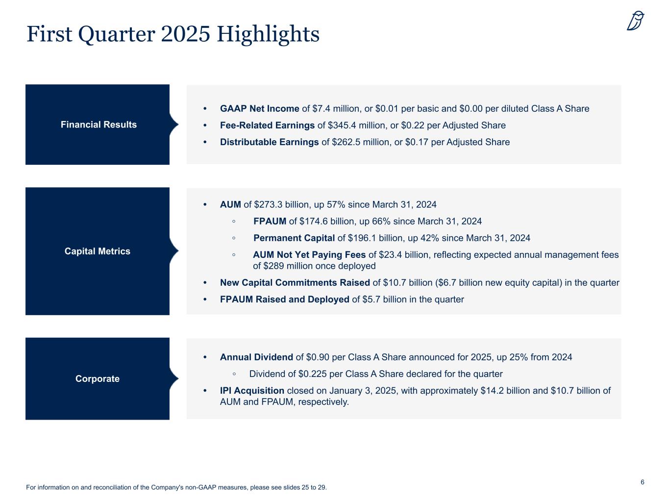 6 First Quarter 2025 Highlights Financial Results • GAAP Net Income of $7.4 million, or $0.01 per basic and $0.00 per diluted Class A Share • Fee-Related Earnings of $345.4 million, or $0.22 per Adjusted Share • Distributable Earnings of $262.5 million, or $0.17 per Adjusted Share Capital Metrics • AUM of $273.3 billion, up 57% since March 31, 2024 ◦ FPAUM of $174.6 billion, up 66% since March 31, 2024 ◦ Permanent Capital of $196.1 billion, up 42% since March 31, 2024 ◦ AUM Not Yet Paying Fees of $23.4 billion, reflecting expected annual management fees of $289 million once deployed • New Capital Commitments Raised of $10.7 billion ($6.7 billion new equity capital) in the quarter • FPAUM Raised and Deployed of $5.7 billion in the quarter Corporate For information on and reconciliation of the Company's non-GAAP measures, please see slides 25 to 29. • Annual Dividend of $0.90 per Class A Share announced for 2025, up 25% from 2024 ◦ Dividend of $0.225 per Class A Share declared for the quarter • IPI Acquisition closed on January 3, 2025, with approximately $14.2 billion and $10.7 billion of AUM and FPAUM, respectively.