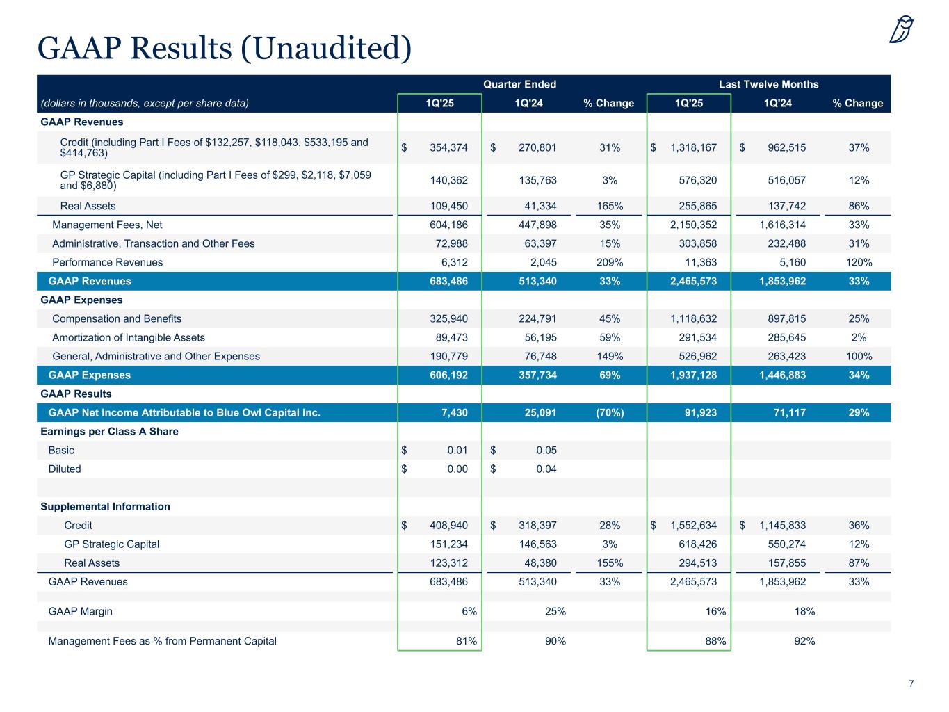 23 Quarter Ended (dollars in thousands, except per share data) 1Q'25 4Q'24 3Q'24 2Q'24 1Q'24 GAAP Revenues Management Fees, Net $ 604,186 $ 557,103 $ 523,309 $ 465,754 $ 447,898 Administrative, Transaction and Other Fees 72,988 69,675 77,289 83,906 63,397 Performance Revenues 6,312 4,583 280 188 2,045 GAAP Revenues 683,486 631,361 600,878 549,848 513,340 GAAP Expenses Compensation and Benefits 325,940 294,482 271,107 227,103 224,791 Amortization of Intangible Assets 89,473 76,653 68,674 56,734 56,195 General, Administrative and Other Expenses 190,779 121,396 121,329 93,458 76,748 GAAP Expenses 606,192 492,531 461,110 377,295 357,734 GAAP Results GAAP Net Income Attributable to Blue Owl Capital Inc. 7,430 20,743 29,805 33,945 25,091 Earnings per Class A Share Basic $ 0.01 $ 0.03 $ 0.05 $ 0.06 $ 0.05 Diluted $ 0.00 $ 0.03 $ 0.04 $ 0.06 $ 0.04 GAAP Results Summary (Unaudited)