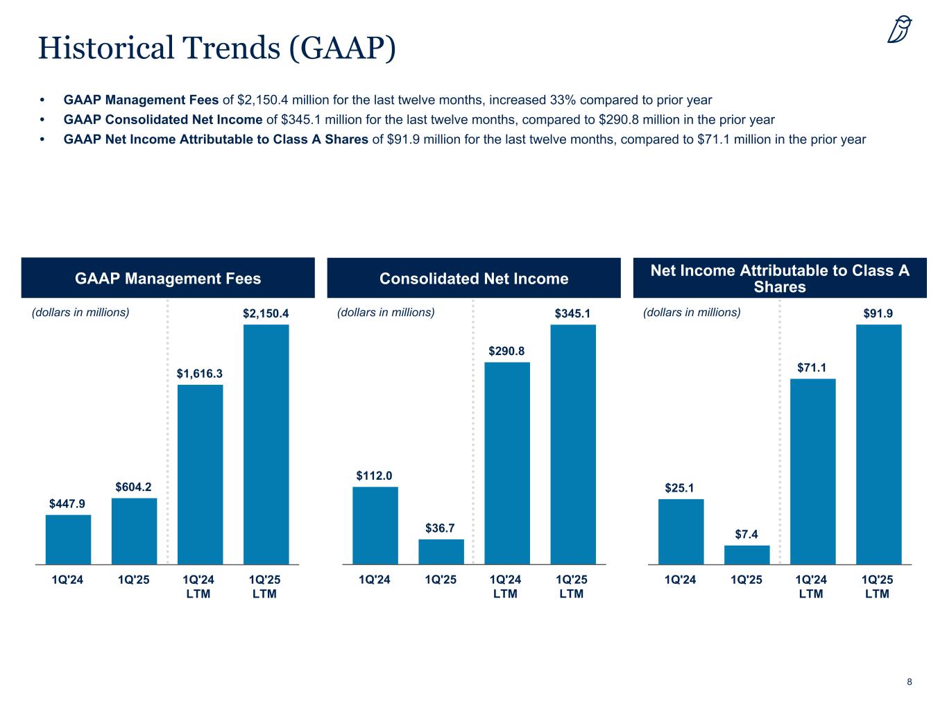 8 Historical Trends (GAAP) • GAAP Management Fees of $2,150.4 million for the last twelve months, increased 33% compared to prior year • GAAP Consolidated Net Income of $345.1 million for the last twelve months, compared to $290.8 million in the prior year • GAAP Net Income Attributable to Class A Shares of $91.9 million for the last twelve months, compared to $71.1 million in the prior year GAAP Management Fees Net Income Attributable to Class A SharesConsolidated Net Income (dollars in millions) (dollars in millions) (dollars in millions) $447.9 $604.2 $1,616.3 $2,150.4 1Q'24 1Q'25 1Q'24 LTM 1Q'25 LTM $25.1 $7.4 $71.1 $91.9 1Q'24 1Q'25 1Q'24 LTM 1Q'25 LTM $112.0 $36.7 $290.8 $345.1 1Q'24 1Q'25 1Q'24 LTM 1Q'25 LTM