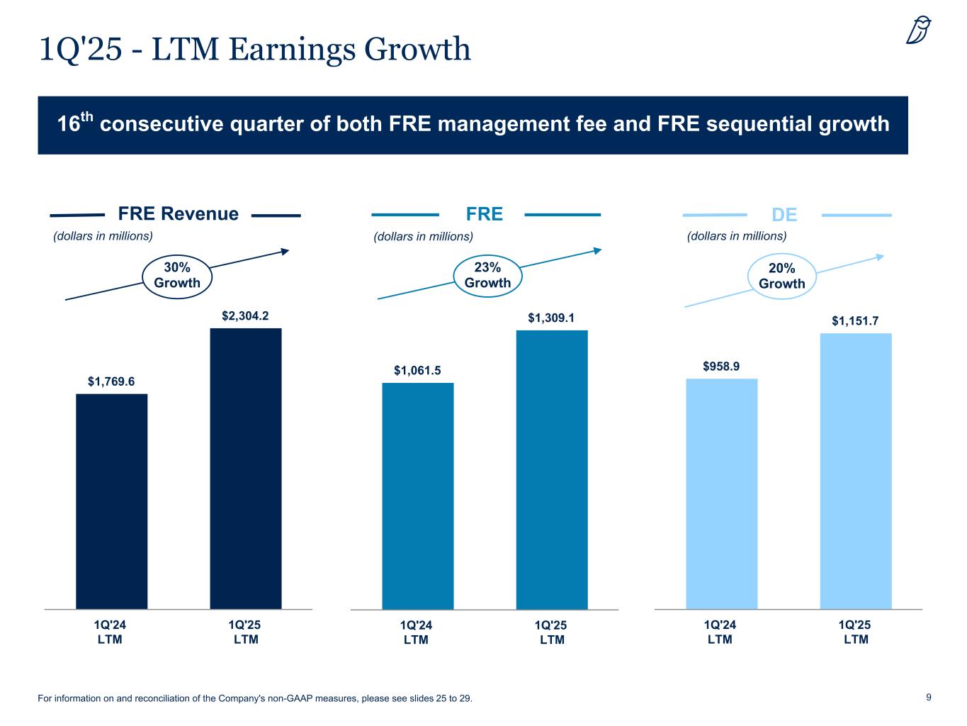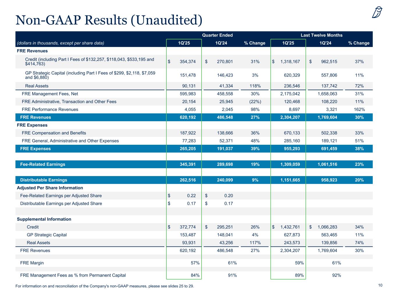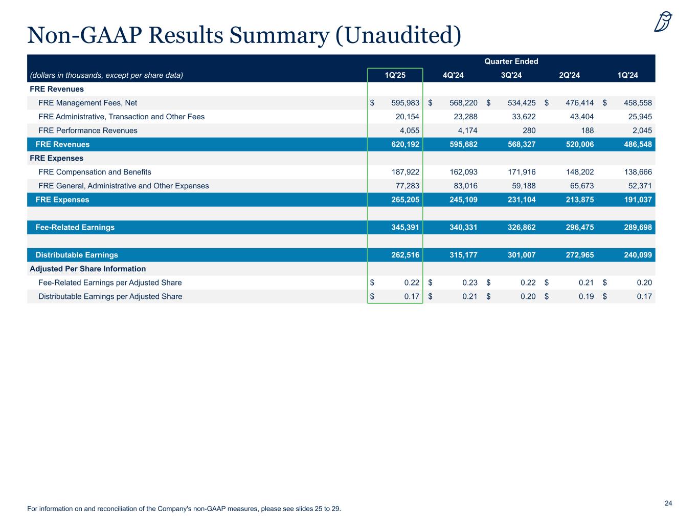 24 Quarter Ended (dollars in thousands, except per share data) 1Q'25 4Q'24 3Q'24 2Q'24 1Q'24 FRE Revenues FRE Management Fees, Net $ 595,983 $ 568,220 $ 534,425 $ 476,414 $ 458,558 FRE Administrative, Transaction and Other Fees 20,154 23,288 33,622 43,404 25,945 FRE Performance Revenues 4,055 4,174 280 188 2,045 FRE Revenues 620,192 595,682 568,327 520,006 486,548 FRE Expenses FRE Compensation and Benefits 187,922 162,093 171,916 148,202 138,666 FRE General, Administrative and Other Expenses 77,283 83,016 59,188 65,673 52,371 FRE Expenses 265,205 245,109 231,104 213,875 191,037 Fee-Related Earnings 345,391 340,331 326,862 296,475 289,698 Distributable Earnings 262,516 315,177 301,007 272,965 240,099 Adjusted Per Share Information Fee-Related Earnings per Adjusted Share $ 0.22 $ 0.23 $ 0.22 $ 0.21 $ 0.20 Distributable Earnings per Adjusted Share $ 0.17 $ 0.21 $ 0.20 $ 0.19 $ 0.17 Non-GAAP Results Summary (Unaudited) For information on and reconciliation of the Company's non-GAAP measures, please see slides 25 to 29.