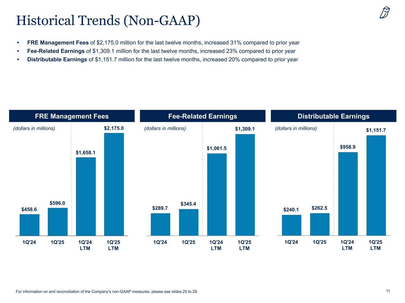 10 Non-GAAP Results (Unaudited) For information on and reconciliation of the Company's non-GAAP measures, please see slides 25 to 29. Quarter Ended Last Twelve Months (dollars in thousands, except per share data) 1Q'25 1Q'24 % Change 1Q'25 1Q'24 % Change FRE Revenues Credit (including Part I Fees of $132,257, $118,043, $533,195 and $414,763) $ 354,374 $ 270,801 31% $ 1,318,167 $ 962,515 37% GP Strategic Capital (including Part I Fees of $299, $2,118, $7,059 and $6,880) 151,478 146,423 3% 620,329 557,806 11% Real Assets 90,131 41,334 118% 236,546 137,742 72% FRE Management Fees, Net 595,983 458,558 30% 2,175,042 1,658,063 31% FRE Administrative, Transaction and Other Fees 20,154 25,945 (22%) 120,468 108,220 11% FRE Performance Revenues 4,055 2,045 98% 8,697 3,321 162% FRE Revenues 620,192 486,548 27% 2,304,207 1,769,604 30% FRE Expenses FRE Compensation and Benefits 187,922 138,666 36% 670,133 502,338 33% FRE General, Administrative and Other Expenses 77,283 52,371 48% 285,160 189,121 51% FRE Expenses 265,205 191,037 39% 955,293 691,459 38% Fee-Related Earnings 345,391 289,698 19% 1,309,059 1,061,516 23% Distributable Earnings 262,516 240,099 9% 1,151,665 958,923 20% Adjusted Per Share Information Fee-Related Earnings per Adjusted Share $ 0.22 $ 0.20 Distributable Earnings per Adjusted Share $ 0.17 $ 0.17 Supplemental Information Credit $ 372,774 $ 295,251 26% $ 1,432,761 $ 1,066,283 34% GP Strategic Capital 153,487 148,041 4% 627,873 563,465 11% Real Assets 93,931 43,256 117% 243,573 139,856 74% FRE Revenues 620,192 486,548 27% 2,304,207 1,769,604 30% FRE Margin 57% 61% 59% 61% FRE Management Fees as % from Permanent Capital 84% 91% 89% 92%