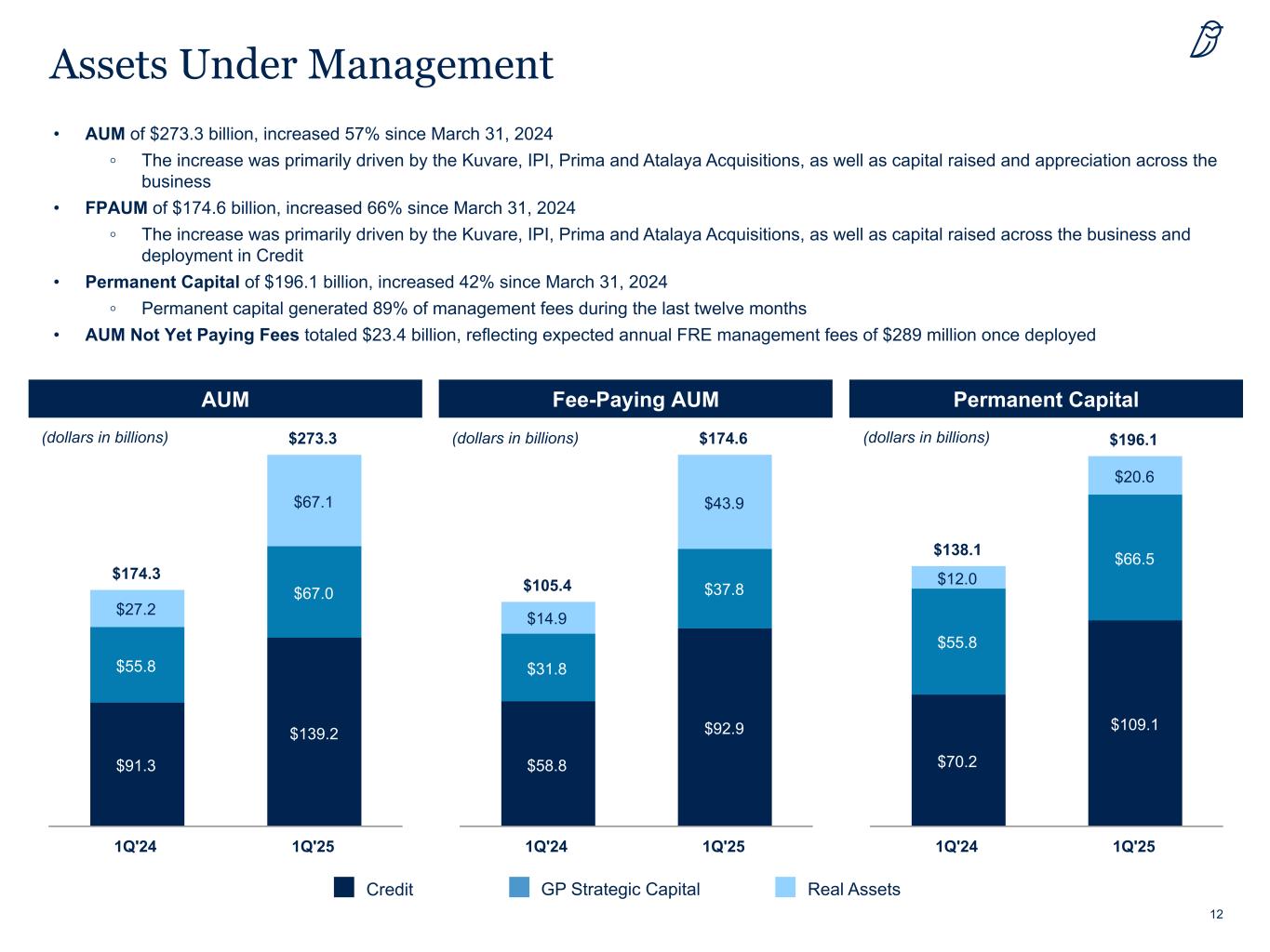 11 Historical Trends (Non-GAAP) • FRE Management Fees of $2,175.0 million for the last twelve months, increased 31% compared to prior year • Fee-Related Earnings of $1,309.1 million for the last twelve months, increased 23% compared to prior year • Distributable Earnings of $1,151.7 million for the last twelve months, increased 20% compared to prior year FRE Management Fees Distributable EarningsFee-Related Earnings (dollars in millions) (dollars in millions) (dollars in millions) $240.1 $262.5 $958.9 $1,151.7 1Q'24 1Q'25 1Q'24 LTM 1Q'25 LTM $289.7 $345.4 $1,061.5 $1,309.1 1Q'24 1Q'25 1Q'24 LTM 1Q'25 LTM $458.6 $596.0 $1,658.1 $2,175.0 1Q'24 1Q'25 1Q'24 LTM 1Q'25 LTM For information on and reconciliation of the Company's non-GAAP measures, please see slides 25 to 29.
