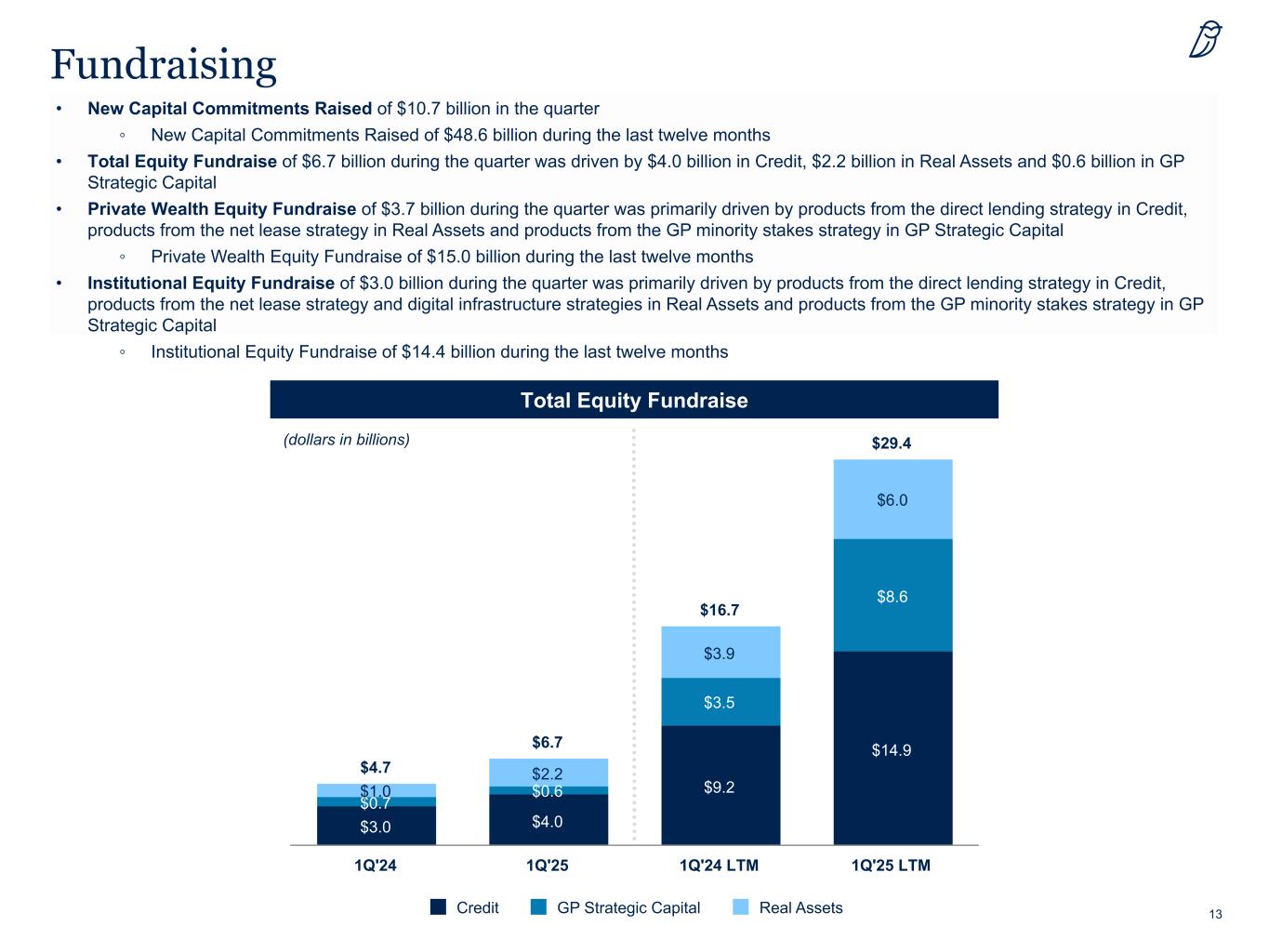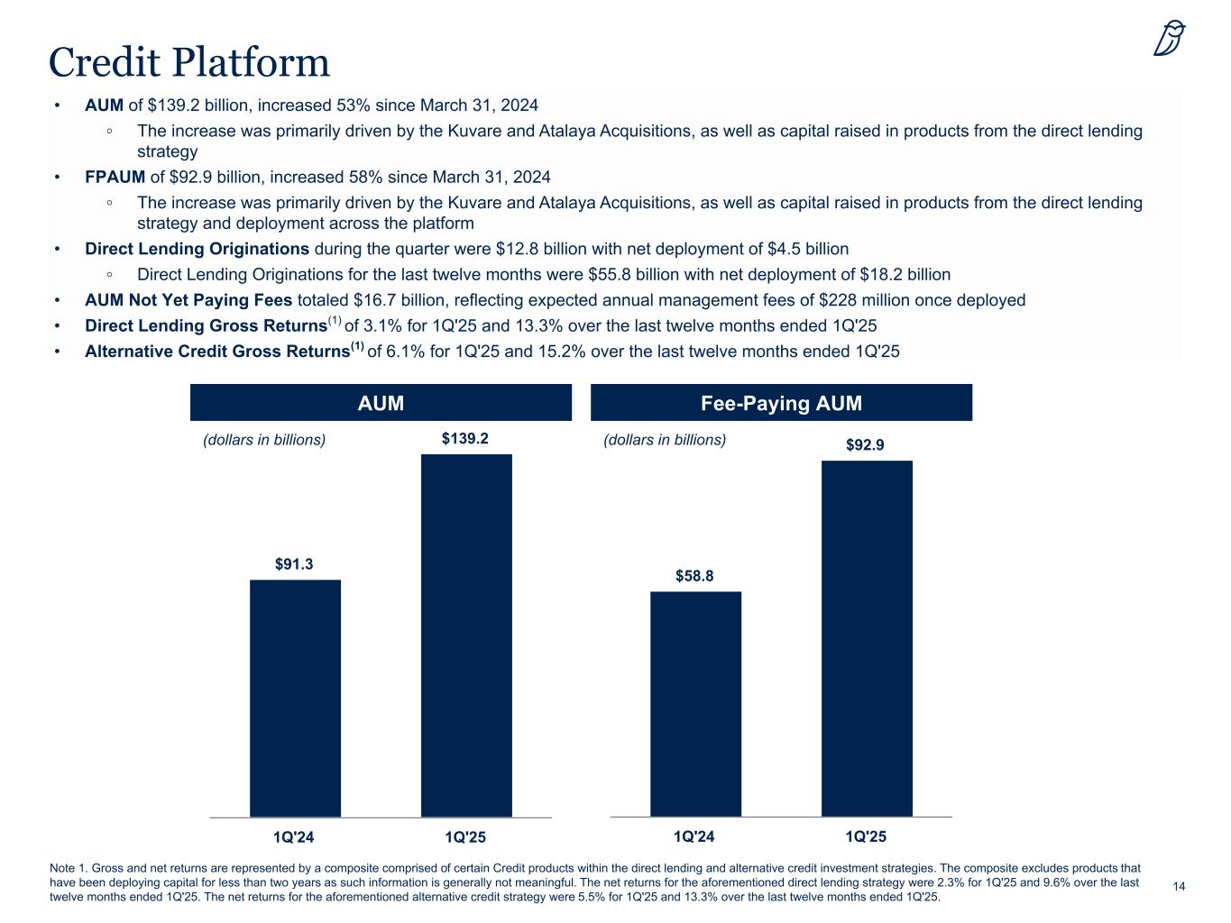 13 Fundraising • New Capital Commitments Raised of $10.7 billion in the quarter ◦ New Capital Commitments Raised of $48.6 billion during the last twelve months • Total Equity Fundraise of $6.7 billion during the quarter was driven by $4.0 billion in Credit, $2.2 billion in Real Assets and $0.6 billion in GP Strategic Capital • Private Wealth Equity Fundraise of $3.7 billion during the quarter was primarily driven by products from the direct lending strategy in Credit, products from the net lease strategy in Real Assets and products from the GP minority stakes strategy in GP Strategic Capital ◦ Private Wealth Equity Fundraise of $15.0 billion during the last twelve months • Institutional Equity Fundraise of $3.0 billion during the quarter was primarily driven by products from the direct lending strategy in Credit, products from the net lease strategy and digital infrastructure strategies in Real Assets and products from the GP minority stakes strategy in GP Strategic Capital ◦ Institutional Equity Fundraise of $14.4 billion during the last twelve months Total Equity Fundraise (dollars in billions) $4.7 $6.7 $16.7 $29.4 $3.0 $4.0 $9.2 $14.9 $0.7 $0.6 $3.5 $8.6 $1.0 $2.2 $3.9 $6.0 Credit GP Strategic Capital Real Assets 1Q'24 1Q'25 1Q'24 LTM 1Q'25 LTM