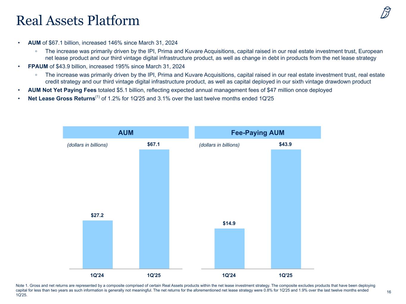 16 Note 1. Gross and net returns are represented by a composite comprised of certain Real Assets products within the net lease investment strategy. The composite excludes products that have been deploying capital for less than two years as such information is generally not meaningful. The net returns for the aforementioned net lease strategy were 0.8% for 1Q'25 and 1.9% over the last twelve months ended 1Q'25. Real Assets Platform • AUM of $67.1 billion, increased 146% since March 31, 2024 ◦ The increase was primarily driven by the IPI, Prima and Kuvare Acquisitions, capital raised in our real estate investment trust, European net lease product and our third vintage digital infrastructure product, as well as change in debt in products from the net lease strategy • FPAUM of $43.9 billion, increased 195% since March 31, 2024 ◦ The increase was primarily driven by the IPI, Prima and Kuvare Acquisitions, capital raised in our real estate investment trust, real estate credit strategy and our third vintage digital infrastructure product, as well as capital deployed in our sixth vintage drawdown product • AUM Not Yet Paying Fees totaled $5.1 billion, reflecting expected annual management fees of $47 million once deployed • Net Lease Gross Returns(1) of 1.2% for 1Q'25 and 3.1% over the last twelve months ended 1Q'25 AUM Fee-Paying AUM $27.2 $67.1 1Q'24 1Q'25 $14.9 $43.9 1Q'24 1Q'25 (dollars in billions)(dollars in billions)
