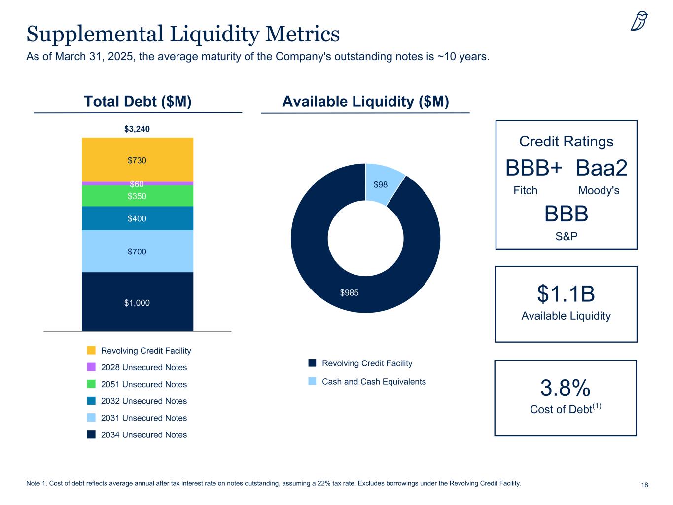 18 As of March 31, 2025, the average maturity of the Company's outstanding notes is ~10 years. Note 1. Cost of debt reflects average annual after tax interest rate on notes outstanding, assuming a 22% tax rate. Excludes borrowings under the Revolving Credit Facility. Supplemental Liquidity Metrics Credit Ratings BBB+ Baa2 Fitch Moody's BBB S&P Total Debt ($M) Available Liquidity ($M) 3.8% Cost of Debt(1) $759 $98 $985 Revolving Credit Facility Cash and Cash Equivalents $3,240 $1,000 $700 $400 $350 $60 $730 Revolving Credit Facility 2028 Unsecured Notes 2051 Unsecured Notes 2032 Unsecured Notes 2031 Unsecured Notes 2034 Unsecured Notes $1.1B Available Liquidity