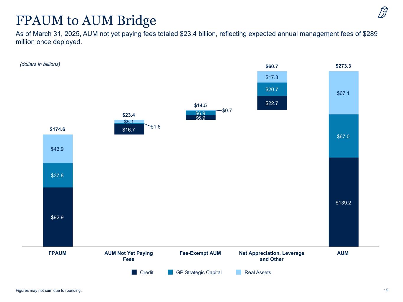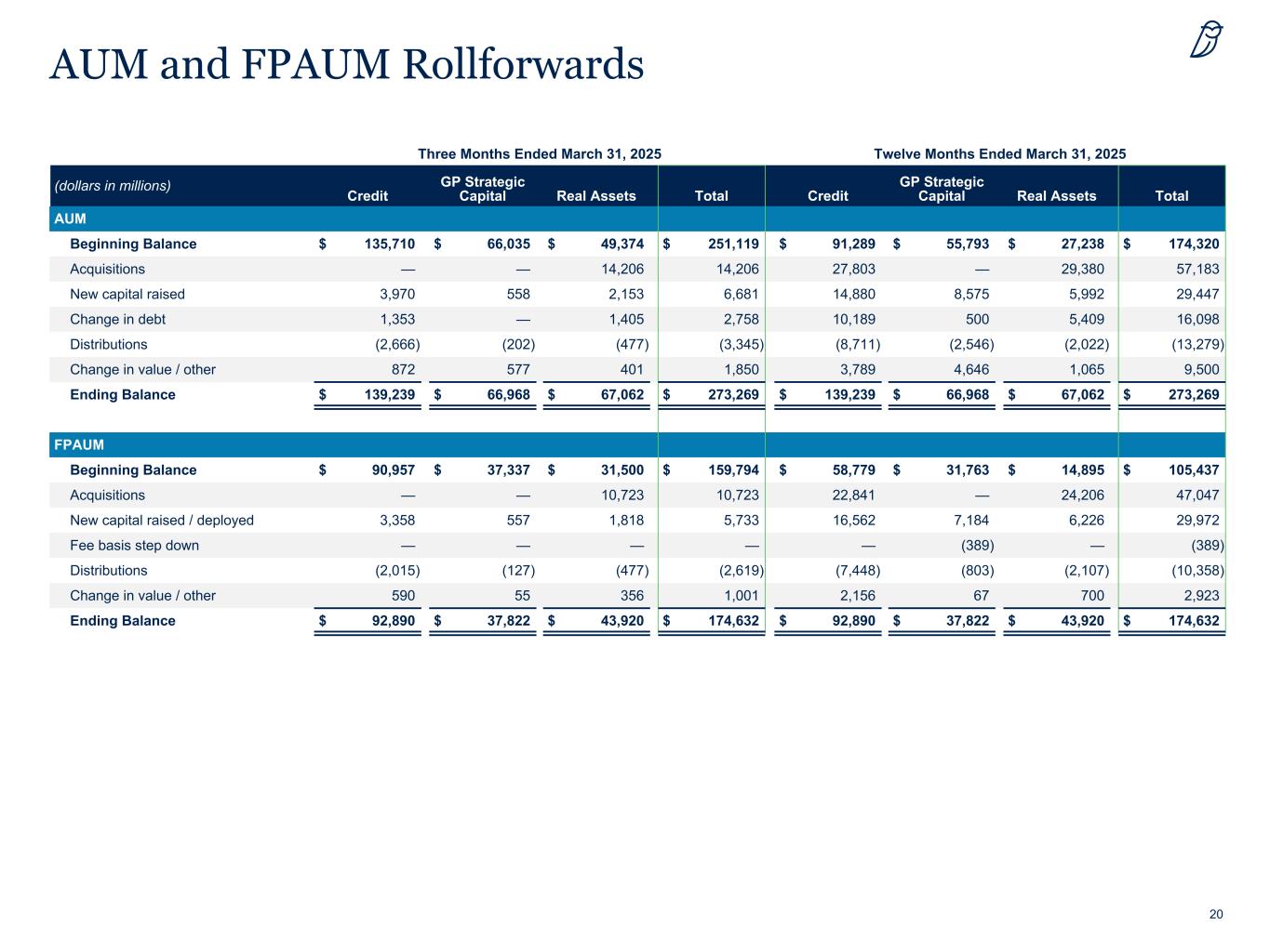 20 AUM and FPAUM Rollforwards Three Months Ended March 31, 2025 Twelve Months Ended March 31, 2025 (dollars in millions) Credit GP Strategic Capital Real Assets Total Credit GP Strategic Capital Real Assets Total AUM Beginning Balance $ 135,710 $ 66,035 $ 49,374 $ 251,119 $ 91,289 $ 55,793 $ 27,238 $ 174,320 Acquisitions — — 14,206 14,206 27,803 — 29,380 57,183 New capital raised 3,970 558 2,153 6,681 14,880 8,575 5,992 29,447 Change in debt 1,353 — 1,405 2,758 10,189 500 5,409 16,098 Distributions (2,666) (202) (477) (3,345) (8,711) (2,546) (2,022) (13,279) Change in value / other 872 577 401 1,850 3,789 4,646 1,065 9,500 Ending Balance $ 139,239 $ 66,968 $ 67,062 $ 273,269 $ 139,239 $ 66,968 $ 67,062 $ 273,269 FPAUM Beginning Balance $ 90,957 $ 37,337 $ 31,500 $ 159,794 $ 58,779 $ 31,763 $ 14,895 $ 105,437 Acquisitions — — 10,723 10,723 22,841 — 24,206 47,047 New capital raised / deployed 3,358 557 1,818 5,733 16,562 7,184 6,226 29,972 Fee basis step down — — — — — (389) — (389) Distributions (2,015) (127) (477) (2,619) (7,448) (803) (2,107) (10,358) Change in value / other 590 55 356 1,001 2,156 67 700 2,923 Ending Balance $ 92,890 $ 37,822 $ 43,920 $ 174,632 $ 92,890 $ 37,822 $ 43,920 $ 174,632