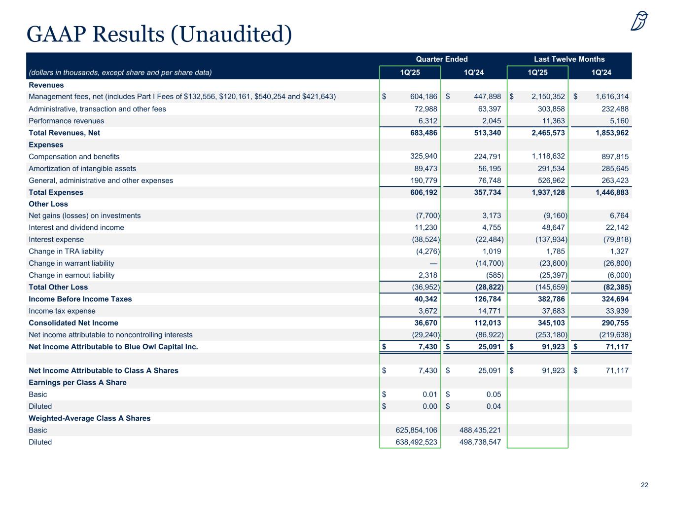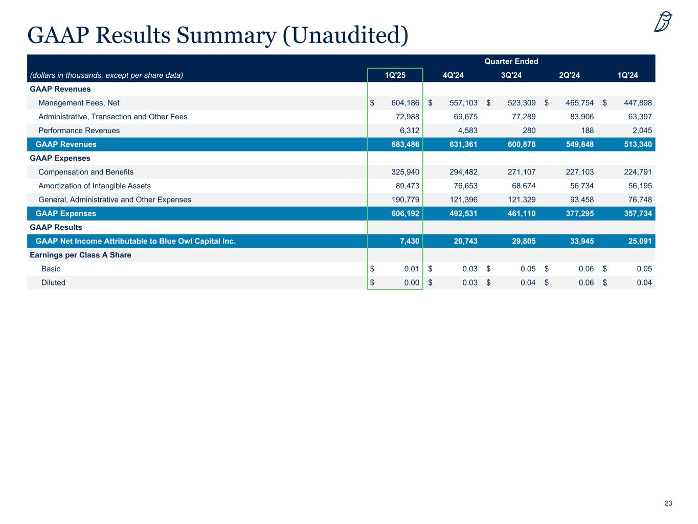 22 GAAP Results (Unaudited) Quarter Ended Last Twelve Months (dollars in thousands, except share and per share data) 1Q'25 1Q'24 1Q'25 1Q'24 Revenues Management fees, net (includes Part I Fees of $132,556, $120,161, $540,254 and $421,643) $ 604,186 $ 447,898 $ 2,150,352 $ 1,616,314 Administrative, transaction and other fees 72,988 63,397 303,858 232,488 Performance revenues 6,312 2,045 11,363 5,160 Total Revenues, Net 683,486 513,340 2,465,573 1,853,962 Expenses Compensation and benefits 325,940 224,791 1,118,632 897,815 Amortization of intangible assets 89,473 56,195 291,534 285,645 General, administrative and other expenses 190,779 76,748 526,962 263,423 Total Expenses 606,192 357,734 1,937,128 1,446,883 Other Loss Net gains (losses) on investments (7,700) 3,173 (9,160) 6,764 Interest and dividend income 11,230 4,755 48,647 22,142 Interest expense (38,524) (22,484) (137,934) (79,818) Change in TRA liability (4,276) 1,019 1,785 1,327 Change in warrant liability — (14,700) (23,600) (26,800) Change in earnout liability 2,318 (585) (25,397) (6,000) Total Other Loss (36,952) (28,822) (145,659) (82,385) Income Before Income Taxes 40,342 126,784 382,786 324,694 Income tax expense 3,672 14,771 37,683 33,939 Consolidated Net Income 36,670 112,013 345,103 290,755 Net income attributable to noncontrolling interests (29,240) (86,922) (253,180) (219,638) Net Income Attributable to Blue Owl Capital Inc. $ 7,430 $ 25,091 $ 91,923 $ 71,117 Net Income Attributable to Class A Shares $ 7,430 $ 25,091 $ 91,923 $ 71,117 Earnings per Class A Share Basic $ 0.01 $ 0.05 Diluted $ 0.00 $ 0.04 Weighted-Average Class A Shares Basic 625,854,106 488,435,221 Diluted 638,492,523 498,738,547