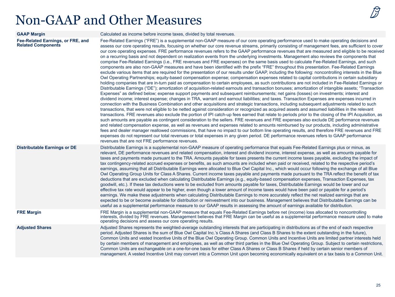 25 Non-GAAP and Other Measures GAAP Margin Calculated as income before income taxes, divided by total revenues. Fee-Related Earnings, or FRE, and Related Components Fee-Related Earnings (“FRE”) is a supplemental non-GAAP measure of our core operating performance used to make operating decisions and assess our core operating results, focusing on whether our core revenue streams, primarily consisting of management fees, are sufficient to cover our core operating expenses. FRE performance revenues refers to the GAAP performance revenues that are measured and eligible to be received on a recurring basis and not dependent on realization events from the underlying investments. Management also reviews the components that comprise Fee-Related Earnings (i.e., FRE revenues and FRE expenses) on the same basis used to calculate Fee-Related Earnings, and such components are also non-GAAP measures and have been identified with the prefix “FRE” throughout this presentation. Fee-Related Earnings exclude various items that are required for the presentation of our results under GAAP, including the following: noncontrolling interests in the Blue Owl Operating Partnerships; equity-based compensation expense; compensation expenses related to capital contributions in certain subsidiary holding companies that are in-turn paid as compensation to certain employees, as such contributions are not included in Fee-Related Earnings or Distributable Earnings (“DE”); amortization of acquisition-related earnouts and transaction bonuses; amortization of intangible assets; “Transaction Expenses” as defined below; expense support payments and subsequent reimbursements; net gains (losses) on investments; interest and dividend income; interest expense; changes in TRA, warrant and earnout liabilities; and taxes. Transaction Expenses are expenses incurred in connection with the Business Combination and other acquisitions and strategic transactions, including subsequent adjustments related to such transactions, that were not eligible to be netted against consideration or recognized as acquired assets and assumed liabilities in the relevant transactions. FRE revenues also exclude the portion of IPI catch-up fees earned that relate to periods prior to the closing of the IPI Acquisition, as such amounts are payable as contingent consideration to the sellers. FRE revenues and FRE expenses also exclude DE performance revenues and related compensation expense, as well as revenues and expenses related to amounts reimbursed by our products, including administrative fees and dealer manager reallowed commissions, that have no impact to our bottom line operating results, and therefore FRE revenues and FRE expenses do not represent our total revenues or total expenses in any given period. DE performance revenues refers to GAAP performance revenues that are not FRE performance revenues. Distributable Earnings or DE Distributable Earnings is a supplemental non-GAAP measure of operating performance that equals Fee-Related Earnings plus or minus, as relevant, DE performance revenues and related compensation, interest and dividend income, interest expense, as well as amounts payable for taxes and payments made pursuant to the TRA. Amounts payable for taxes presents the current income taxes payable, excluding the impact of tax contingency-related accrued expenses or benefits, as such amounts are included when paid or received, related to the respective period’s earnings, assuming that all Distributable Earnings were allocated to Blue Owl Capital Inc., which would occur following the exchange of all Blue Owl Operating Group Units for Class A Shares. Current income taxes payable and payments made pursuant to the TRA reflect the benefit of tax deductions that are excluded when calculating Distributable Earnings (e.g., equity-based compensation expenses, Transaction Expenses, tax goodwill, etc.). If these tax deductions were to be excluded from amounts payable for taxes, Distributable Earnings would be lower and our effective tax rate would appear to be higher, even though a lower amount of income taxes would have been paid or payable for a period’s earnings. We make these adjustments when calculating Distributable Earnings to more accurately reflect the net realized earnings that are expected to be or become available for distribution or reinvestment into our business. Management believes that Distributable Earnings can be useful as a supplemental performance measure to our GAAP results in assessing the amount of earnings available for distribution. FRE Margin FRE Margin is a supplemental non-GAAP measure that equals Fee-Related Earnings before net (income) loss allocated to noncontrolling interests, divided by FRE revenues. Management believes that FRE Margin can be useful as a supplemental performance measure used to make operating decisions and assess our core operating results. Adjusted Shares Adjusted Shares represents the weighted-average outstanding interests that are participating in distributions as of the end of each respective period. Adjusted Shares is the sum of Blue Owl Capital Inc.’s Class A Shares (and Class B Shares to the extent outstanding in the future), Common Units and vested Incentive Units of the Blue Owl Operating Group. Common Units and Incentive Units are limited partner interests held by certain members of management and employees, as well as other third parties in the Blue Owl Operating Group. Subject to certain restrictions, Common Units are exchangeable on a one-for-one basis for either Class A Shares or Class B Shares if held by certain senior members of management. A vested Incentive Unit may convert into a Common Unit upon becoming economically equivalent on a tax basis to a Common Unit.