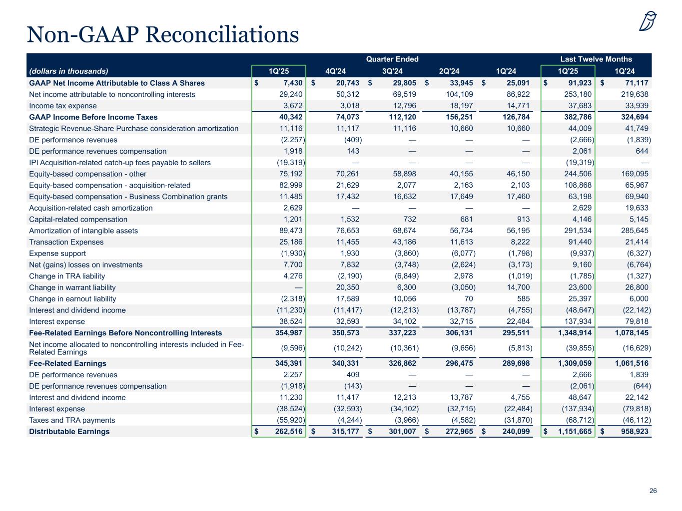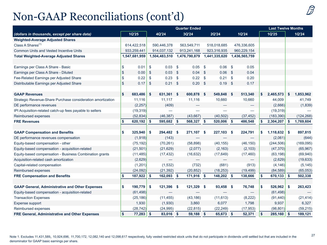 26 Non-GAAP Reconciliations Quarter Ended Last Twelve Months (dollars in thousands) 1Q'25 4Q'24 3Q'24 2Q'24 1Q'24 1Q'25 1Q'24 GAAP Net Income Attributable to Class A Shares $ 7,430 $ 20,743 $ 29,805 $ 33,945 $ 25,091 $ 91,923 $ 71,117 Net income attributable to noncontrolling interests 29,240 50,312 69,519 104,109 86,922 253,180 219,638 Income tax expense 3,672 3,018 12,796 18,197 14,771 37,683 33,939 GAAP Income Before Income Taxes 40,342 74,073 112,120 156,251 126,784 382,786 324,694 Strategic Revenue-Share Purchase consideration amortization 11,116 11,117 11,116 10,660 10,660 44,009 41,749 DE performance revenues (2,257) (409) — — — (2,666) (1,839) DE performance revenues compensation 1,918 143 — — — 2,061 644 IPI Acquisition-related catch-up fees payable to sellers (19,319) — — — — (19,319) — Equity-based compensation - other 75,192 70,261 58,898 40,155 46,150 244,506 169,095 Equity-based compensation - acquisition-related 82,999 21,629 2,077 2,163 2,103 108,868 65,967 Equity-based compensation - Business Combination grants 11,485 17,432 16,632 17,649 17,460 63,198 69,940 Acquisition-related cash amortization 2,629 — — — — 2,629 19,633 Capital-related compensation 1,201 1,532 732 681 913 4,146 5,145 Amortization of intangible assets 89,473 76,653 68,674 56,734 56,195 291,534 285,645 Transaction Expenses 25,186 11,455 43,186 11,613 8,222 91,440 21,414 Expense support (1,930) 1,930 (3,860) (6,077) (1,798) (9,937) (6,327) Net (gains) losses on investments 7,700 7,832 (3,748) (2,624) (3,173) 9,160 (6,764) Change in TRA liability 4,276 (2,190) (6,849) 2,978 (1,019) (1,785) (1,327) Change in warrant liability — 20,350 6,300 (3,050) 14,700 23,600 26,800 Change in earnout liability (2,318) 17,589 10,056 70 585 25,397 6,000 Interest and dividend income (11,230) (11,417) (12,213) (13,787) (4,755) (48,647) (22,142) Interest expense 38,524 32,593 34,102 32,715 22,484 137,934 79,818 Fee-Related Earnings Before Noncontrolling Interests 354,987 350,573 337,223 306,131 295,511 1,348,914 1,078,145 Net income allocated to noncontrolling interests included in Fee- Related Earnings (9,596) (10,242) (10,361) (9,656) (5,813) (39,855) (16,629) Fee-Related Earnings 345,391 340,331 326,862 296,475 289,698 1,309,059 1,061,516 DE performance revenues 2,257 409 — — — 2,666 1,839 DE performance revenues compensation (1,918) (143) — — — (2,061) (644) Interest and dividend income 11,230 11,417 12,213 13,787 4,755 48,647 22,142 Interest expense (38,524) (32,593) (34,102) (32,715) (22,484) (137,934) (79,818) Taxes and TRA payments (55,920) (4,244) (3,966) (4,582) (31,870) (68,712) (46,112) Distributable Earnings $ 262,516 $ 315,177 $ 301,007 $ 272,965 $ 240,099 $ 1,151,665 $ 958,923
