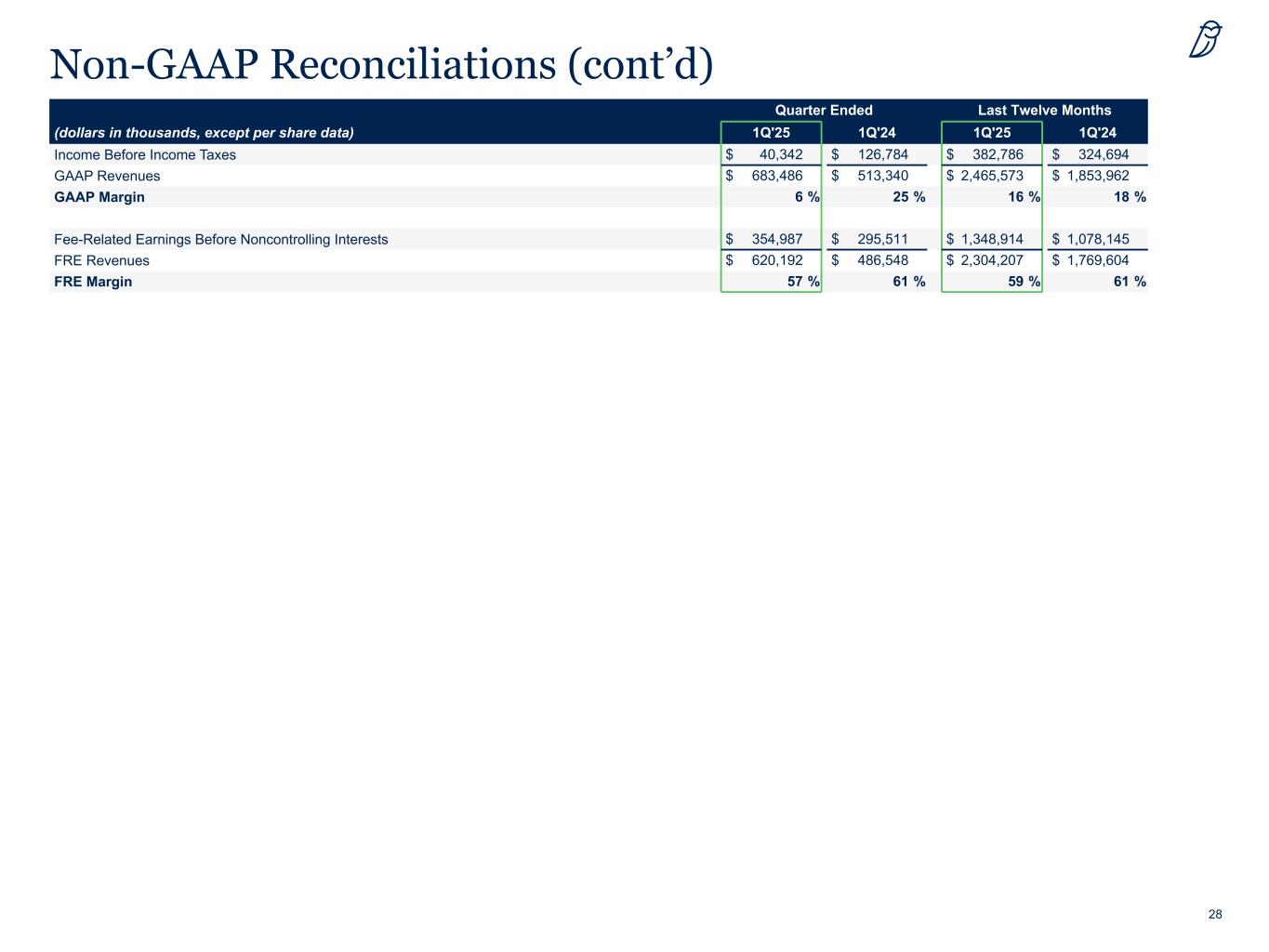 27 Non-GAAP Reconciliations (cont’d) Quarter Ended Last Twelve Months (dollars in thousands, except per share data) 1Q'25 4Q'24 3Q'24 2Q'24 1Q'24 1Q'25 1Q'24 Weighted-Average Adjusted Shares Class A Shares(1) 614,422,518 590,446,378 563,549,711 518,018,685 476,336,605 Common Units and Vested Incentive Units 933,259,441 914,037,132 913,241,168 923,316,935 960,229,154 Total Weighted-Average Adjusted Shares 1,547,681,959 1,504,483,510 1,476,790,879 1,441,335,620 1,436,565,759 Earnings per Class A Share - Basic $ 0.01 $ 0.03 $ 0.05 $ 0.06 $ 0.05 Earnings per Class A Share - Diluted $ 0.00 $ 0.03 $ 0.04 $ 0.06 $ 0.04 Fee-Related Earnings per Adjusted Share $ 0.22 $ 0.23 $ 0.22 $ 0.21 $ 0.20 Distributable Earnings per Adjusted Share $ 0.17 $ 0.21 $ 0.20 $ 0.19 $ 0.17 GAAP Revenues $ 683,486 $ 631,361 $ 600,878 $ 549,848 $ 513,340 $ 2,465,573 $ 1,853,962 Strategic Revenue-Share Purchase consideration amortization 11,116 11,117 11,116 10,660 10,660 44,009 41,749 DE performance revenues (2,257) (409) — — — (2,666) (1,839) IPI Acquisition-related catch-up fees payable to sellers (19,319) — — — — (19,319) — Reimbursed expenses (52,834) (46,387) (43,667) (40,502) (37,452) (183,390) (124,268) FRE Revenues $ 620,192 $ 595,682 $ 568,327 $ 520,006 $ 486,548 $ 2,304,207 $ 1,769,604 GAAP Compensation and Benefits $ 325,940 $ 294,482 $ 271,107 $ 227,103 $ 224,791 $ 1,118,632 $ 897,815 DE performance revenues compensation (1,918) (143) — — — (2,061) (644) Equity-based compensation - other (75,192) (70,261) (58,898) (40,155) (46,150) (244,506) (169,095) Equity-based compensation - acquisition-related (21,501) (21,629) (2,077) (2,163) (2,103) (47,370) (65,967) Equity-based compensation - Business Combination grants (11,485) (17,432) (16,632) (17,649) (17,460) (63,198) (69,940) Acquisition-related cash amortization (2,629) — — — — (2,629) (19,633) Capital-related compensation (1,201) (1,532) (732) (681) (913) (4,146) (5,145) Reimbursed expenses (24,092) (21,392) (20,852) (18,253) (19,499) (84,589) (65,053) FRE Compensation and Benefits $ 187,922 $ 162,093 $ 171,916 $ 148,202 $ 138,666 $ 670,133 $ 502,338 GAAP General, Administrative and Other Expenses $ 190,779 $ 121,396 $ 121,329 $ 93,458 $ 76,748 $ 526,962 $ 263,423 Equity-based compensation - acquisition-related (61,498) — — — — (61,498) — Transaction Expenses (25,186) (11,455) (43,186) (11,613) (8,222) (91,440) (21,414) Expense support 1,930 (1,930) 3,860 6,077 1,798 9,937 6,327 Reimbursed expenses (28,742) (24,995) (22,815) (22,249) (17,953) (98,801) (59,215) FRE General, Administrative and Other Expenses $ 77,283 $ 83,016 $ 59,188 $ 65,673 $ 52,371 $ 285,160 $ 189,121 Note 1. Excludes 11,431,589, 10,924,696, 11,700,172, 12,082,140 and 12,098,617 respectively, fully vested restricted stock units that do not participate in dividends until settled but that are included in the denominator for GAAP basic earnings per share.