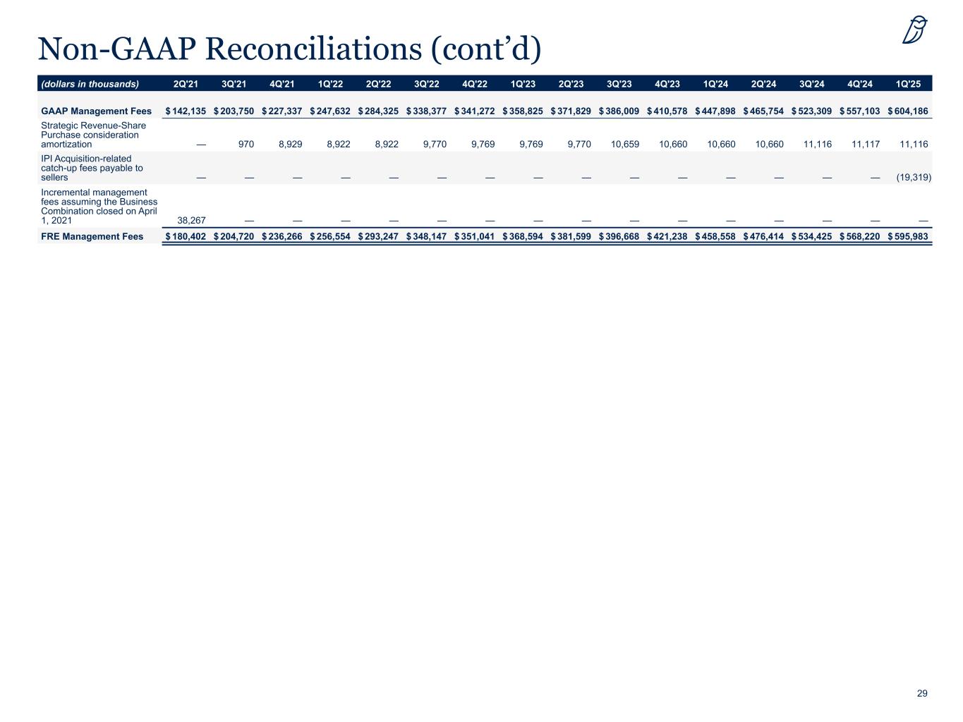 28 Non-GAAP Reconciliations (cont’d) Quarter Ended Last Twelve Months (dollars in thousands, except per share data) 1Q'25 1Q'24 1Q'25 1Q'24 Income Before Income Taxes $ 40,342 $ 126,784 $ 382,786 $ 324,694 GAAP Revenues $ 683,486 $ 513,340 $ 2,465,573 $ 1,853,962 GAAP Margin 6 % 25 % 16 % 18 % Fee-Related Earnings Before Noncontrolling Interests $ 354,987 $ 295,511 $ 1,348,914 $ 1,078,145 FRE Revenues $ 620,192 $ 486,548 $ 2,304,207 $ 1,769,604 FRE Margin 57 % 61 % 59 % 61 %