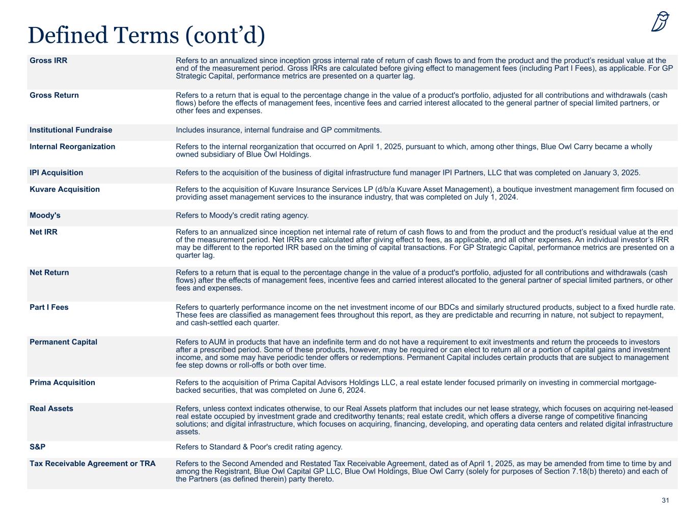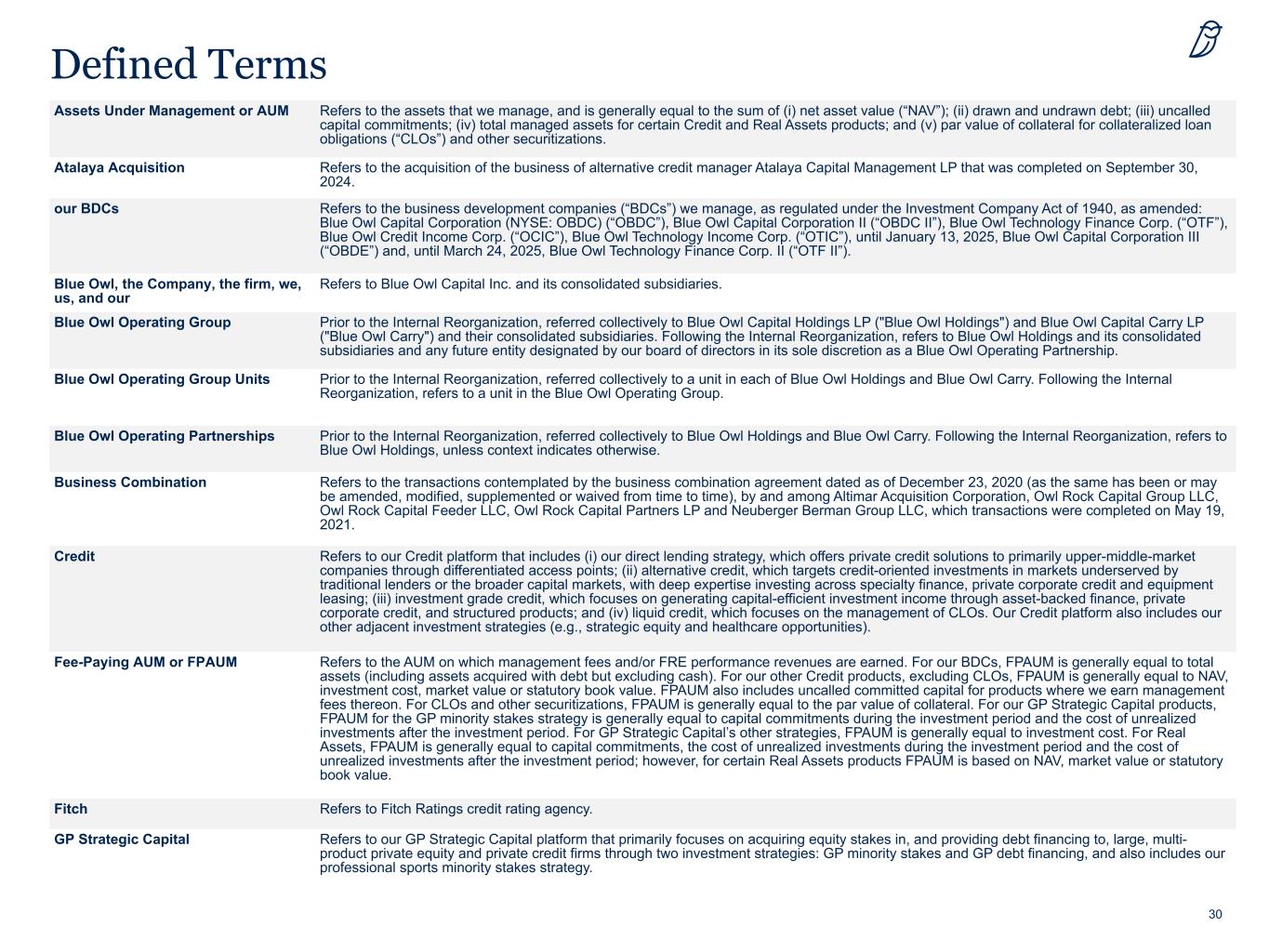 30 Defined Terms Assets Under Management or AUM Refers to the assets that we manage, and is generally equal to the sum of (i) net asset value (“NAV”); (ii) drawn and undrawn debt; (iii) uncalled capital commitments; (iv) total managed assets for certain Credit and Real Assets products; and (v) par value of collateral for collateralized loan obligations (“CLOs”) and other securitizations. Atalaya Acquisition Refers to the acquisition of the business of alternative credit manager Atalaya Capital Management LP that was completed on September 30, 2024. our BDCs Refers to the business development companies (“BDCs”) we manage, as regulated under the Investment Company Act of 1940, as amended: Blue Owl Capital Corporation (NYSE: OBDC) (“OBDC”), Blue Owl Capital Corporation II (“OBDC II”), Blue Owl Technology Finance Corp. (“OTF”), Blue Owl Credit Income Corp. (“OCIC”), Blue Owl Technology Income Corp. (“OTIC”), until January 13, 2025, Blue Owl Capital Corporation III (“OBDE”) and, until March 24, 2025, Blue Owl Technology Finance Corp. II (“OTF II”). Blue Owl, the Company, the firm, we, us, and our Refers to Blue Owl Capital Inc. and its consolidated subsidiaries. Blue Owl Operating Group Prior to the Internal Reorganization, referred collectively to Blue Owl Capital Holdings LP ("Blue Owl Holdings") and Blue Owl Capital Carry LP ("Blue Owl Carry") and their consolidated subsidiaries. Following the Internal Reorganization, refers to Blue Owl Holdings and its consolidated subsidiaries and any future entity designated by our board of directors in its sole discretion as a Blue Owl Operating Partnership. Blue Owl Operating Group Units Prior to the Internal Reorganization, referred collectively to a unit in each of Blue Owl Holdings and Blue Owl Carry. Following the Internal Reorganization, refers to a unit in the Blue Owl Operating Group. Blue Owl Operating Partnerships Prior to the Internal Reorganization, referred collectively to Blue Owl Holdings and Blue Owl Carry. Following the Internal Reorganization, refers to Blue Owl Holdings, unless context indicates otherwise. Business Combination Refers to the transactions contemplated by the business combination agreement dated as of December 23, 2020 (as the same has been or may be amended, modified, supplemented or waived from time to time), by and among Altimar Acquisition Corporation, Owl Rock Capital Group LLC, Owl Rock Capital Feeder LLC, Owl Rock Capital Partners LP and Neuberger Berman Group LLC, which transactions were completed on May 19, 2021. Credit Refers to our Credit platform that includes (i) our direct lending strategy, which offers private credit solutions to primarily upper-middle-market companies through differentiated access points; (ii) alternative credit, which targets credit-oriented investments in markets underserved by traditional lenders or the broader capital markets, with deep expertise investing across specialty finance, private corporate credit and equipment leasing; (iii) investment grade credit, which focuses on generating capital-efficient investment income through asset-backed finance, private corporate credit, and structured products; and (iv) liquid credit, which focuses on the management of CLOs. Our Credit platform also includes our other adjacent investment strategies (e.g., strategic equity and healthcare opportunities). Fee-Paying AUM or FPAUM Refers to the AUM on which management fees and/or FRE performance revenues are earned. For our BDCs, FPAUM is generally equal to total assets (including assets acquired with debt but excluding cash). For our other Credit products, excluding CLOs, FPAUM is generally equal to NAV, investment cost, market value or statutory book value. FPAUM also includes uncalled committed capital for products where we earn management fees thereon. For CLOs and other securitizations, FPAUM is generally equal to the par value of collateral. For our GP Strategic Capital products, FPAUM for the GP minority stakes strategy is generally equal to capital commitments during the investment period and the cost of unrealized investments after the investment period. For GP Strategic Capital’s other strategies, FPAUM is generally equal to investment cost. For Real Assets, FPAUM is generally equal to capital commitments, the cost of unrealized investments during the investment period and the cost of unrealized investments after the investment period; however, for certain Real Assets products FPAUM is based on NAV, market value or statutory book value. Fitch Refers to Fitch Ratings credit rating agency. GP Strategic Capital Refers to our GP Strategic Capital platform that primarily focuses on acquiring equity stakes in, and providing debt financing to, large, multi- product private equity and private credit firms through two investment strategies: GP minority stakes and GP debt financing, and also includes our professional sports minority stakes strategy.