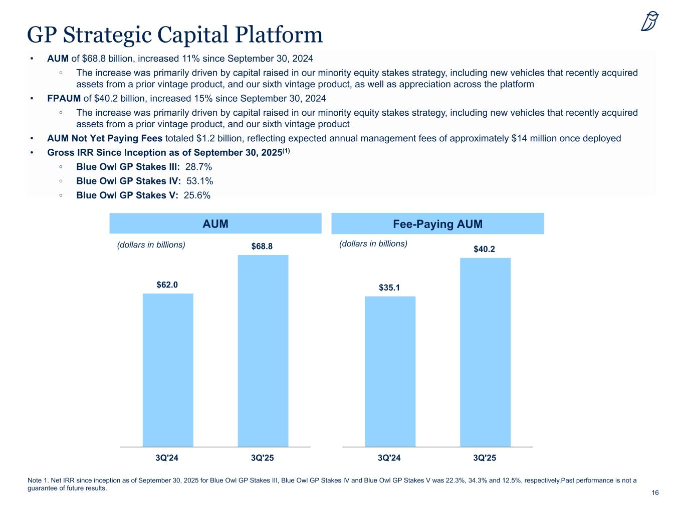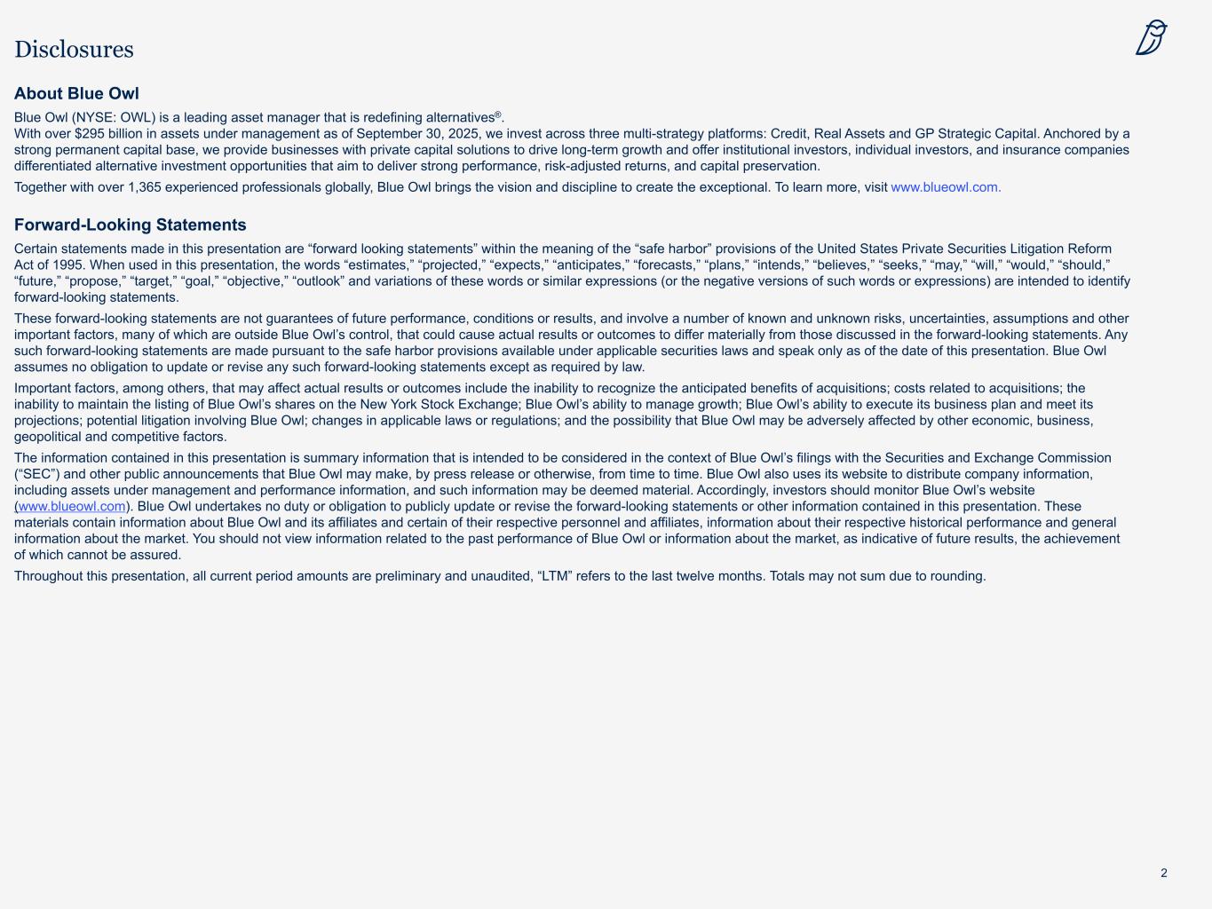 2 About Blue Owl Blue Owl (NYSE: OWL) is a leading asset manager that is redefining alternatives®. With over $295 billion in assets under management as of September 30, 2025, we invest across three multi-strategy platforms: Credit, Real Assets and GP Strategic Capital. Anchored by a strong permanent capital base, we provide businesses with private capital solutions to drive long-term growth and offer institutional investors, individual investors, and insurance companies differentiated alternative investment opportunities that aim to deliver strong performance, risk-adjusted returns, and capital preservation. Together with over 1,365 experienced professionals globally, Blue Owl brings the vision and discipline to create the exceptional. To learn more, visit www.blueowl.com. Forward-Looking Statements Certain statements made in this presentation are “forward looking statements” within the meaning of the “safe harbor” provisions of the United States Private Securities Litigation Reform Act of 1995. When used in this presentation, the words “estimates,” “projected,” “expects,” “anticipates,” “forecasts,” “plans,” “intends,” “believes,” “seeks,” “may,” “will,” “would,” “should,” “future,” “propose,” “target,” “goal,” “objective,” “outlook” and variations of these words or similar expressions (or the negative versions of such words or expressions) are intended to identify forward-looking statements. These forward-looking statements are not guarantees of future performance, conditions or results, and involve a number of known and unknown risks, uncertainties, assumptions and other important factors, many of which are outside Blue Owl’s control, that could cause actual results or outcomes to differ materially from those discussed in the forward-looking statements. Any such forward-looking statements are made pursuant to the safe harbor provisions available under applicable securities laws and speak only as of the date of this presentation. Blue Owl assumes no obligation to update or revise any such forward-looking statements except as required by law. Important factors, among others, that may affect actual results or outcomes include the inability to recognize the anticipated benefits of acquisitions; costs related to acquisitions; the inability to maintain the listing of Blue Owl’s shares on the New York Stock Exchange; Blue Owl’s ability to manage growth; Blue Owl’s ability to execute its business plan and meet its projections; potential litigation involving Blue Owl; changes in applicable laws or regulations; and the possibility that Blue Owl may be adversely affected by other economic, business, geopolitical and competitive factors. The information contained in this presentation is summary information that is intended to be considered in the context of Blue Owl’s filings with the Securities and Exchange Commission (“SEC”) and other public announcements that Blue Owl may make, by press release or otherwise, from time to time. Blue Owl also uses its website to distribute company information, including assets under management and performance information, and such information may be deemed material. Accordingly, investors should monitor Blue Owl’s website (www.blueowl.com). Blue Owl undertakes no duty or obligation to publicly update or revise the forward-looking statements or other information contained in this presentation. These materials contain information about Blue Owl and its affiliates and certain of their respective personnel and affiliates, information about their respective historical performance and general information about the market. You should not view information related to the past performance of Blue Owl or information about the market, as indicative of future results, the achievement of which cannot be assured. Throughout this presentation, all current period amounts are preliminary and unaudited, “LTM” refers to the last twelve months. Totals may not sum due to rounding. Disclosures