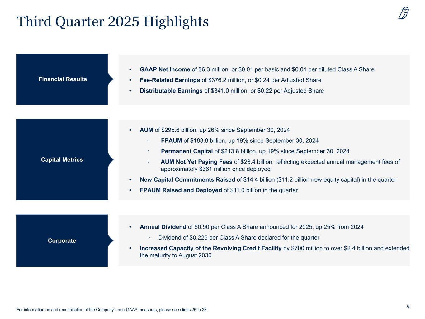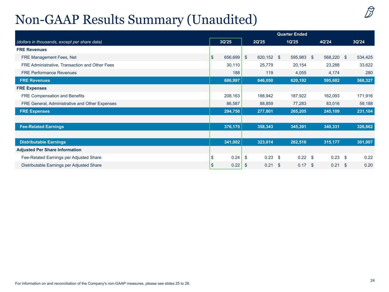 24 Quarter Ended (dollars in thousands, except per share data) 3Q'25 2Q'25 1Q'25 4Q'24 3Q'24 FRE Revenues FRE Management Fees, Net $ 656,699 $ 620,152 $ 595,983 $ 568,220 $ 534,425 FRE Administrative, Transaction and Other Fees 30,110 25,779 20,154 23,288 33,622 FRE Performance Revenues 188 119 4,055 4,174 280 FRE Revenues 686,997 646,050 620,192 595,682 568,327 FRE Expenses FRE Compensation and Benefits 208,163 188,942 187,922 162,093 171,916 FRE General, Administrative and Other Expenses 86,587 88,859 77,283 83,016 59,188 FRE Expenses 294,750 277,801 265,205 245,109 231,104 Fee-Related Earnings 376,175 358,343 345,391 340,331 326,862 Distributable Earnings 341,002 323,014 262,516 315,177 301,007 Adjusted Per Share Information Fee-Related Earnings per Adjusted Share $ 0.24 $ 0.23 $ 0.22 $ 0.23 $ 0.22 Distributable Earnings per Adjusted Share $ 0.22 $ 0.21 $ 0.17 $ 0.21 $ 0.20 Non-GAAP Results Summary (Unaudited) For information on and reconciliation of the Company's non-GAAP measures, please see slides 25 to 28.