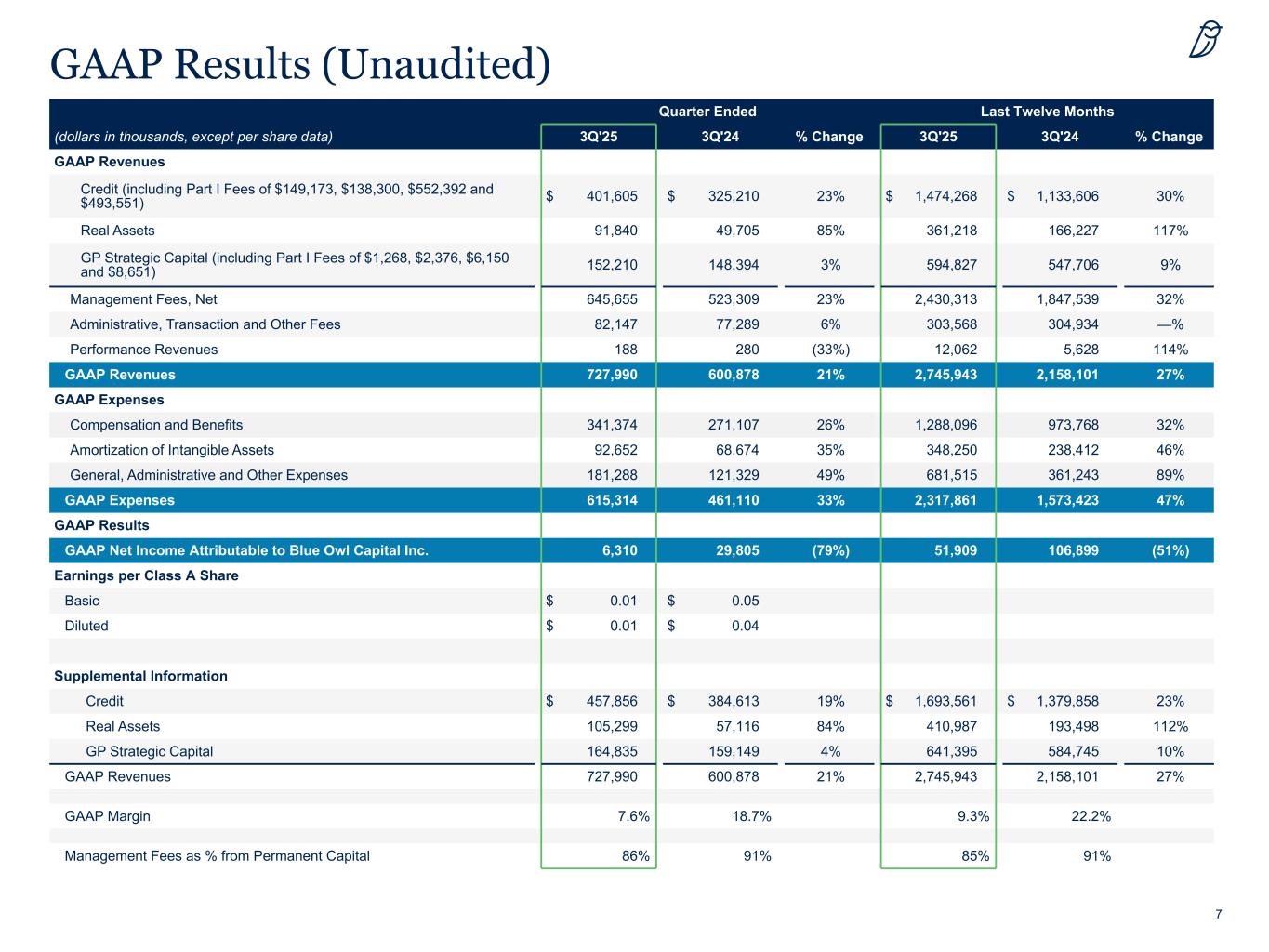 23 Quarter Ended (dollars in thousands, except per share data) 3Q'25 2Q'25 1Q'25 4Q'24 3Q'24 GAAP Revenues Management Fees, Net $ 645,655 $ 623,369 $ 604,186 $ 557,103 $ 523,309 Administrative, Transaction and Other Fees 82,147 78,758 72,988 69,675 77,289 Performance Revenues 188 979 6,312 4,583 280 GAAP Revenues 727,990 703,106 683,486 631,361 600,878 GAAP Expenses Compensation and Benefits 341,374 326,300 325,940 294,482 271,107 Amortization of Intangible Assets 92,652 89,472 89,473 76,653 68,674 General, Administrative and Other Expenses 181,288 188,052 190,779 121,396 121,329 GAAP Expenses 615,314 603,824 606,192 492,531 461,110 GAAP Results GAAP Net Income Attributable to Blue Owl Capital Inc. 6,310 17,426 7,430 20,743 29,805 Earnings per Class A Share Basic $ 0.01 $ 0.03 $ 0.01 $ 0.03 $ 0.05 Diluted $ 0.01 $ 0.02 $ 0.00 $ 0.03 $ 0.04 GAAP Results Summary (Unaudited)