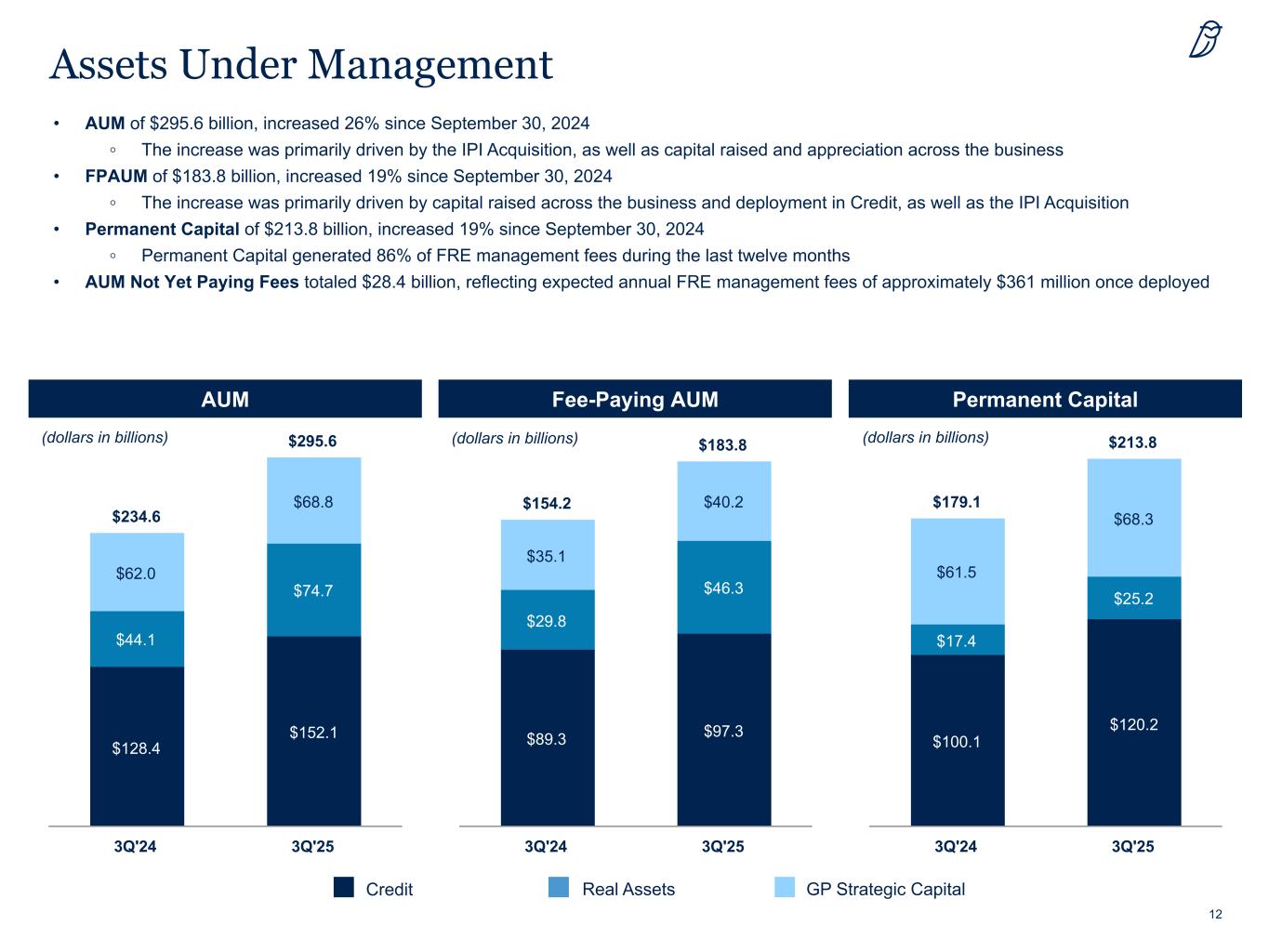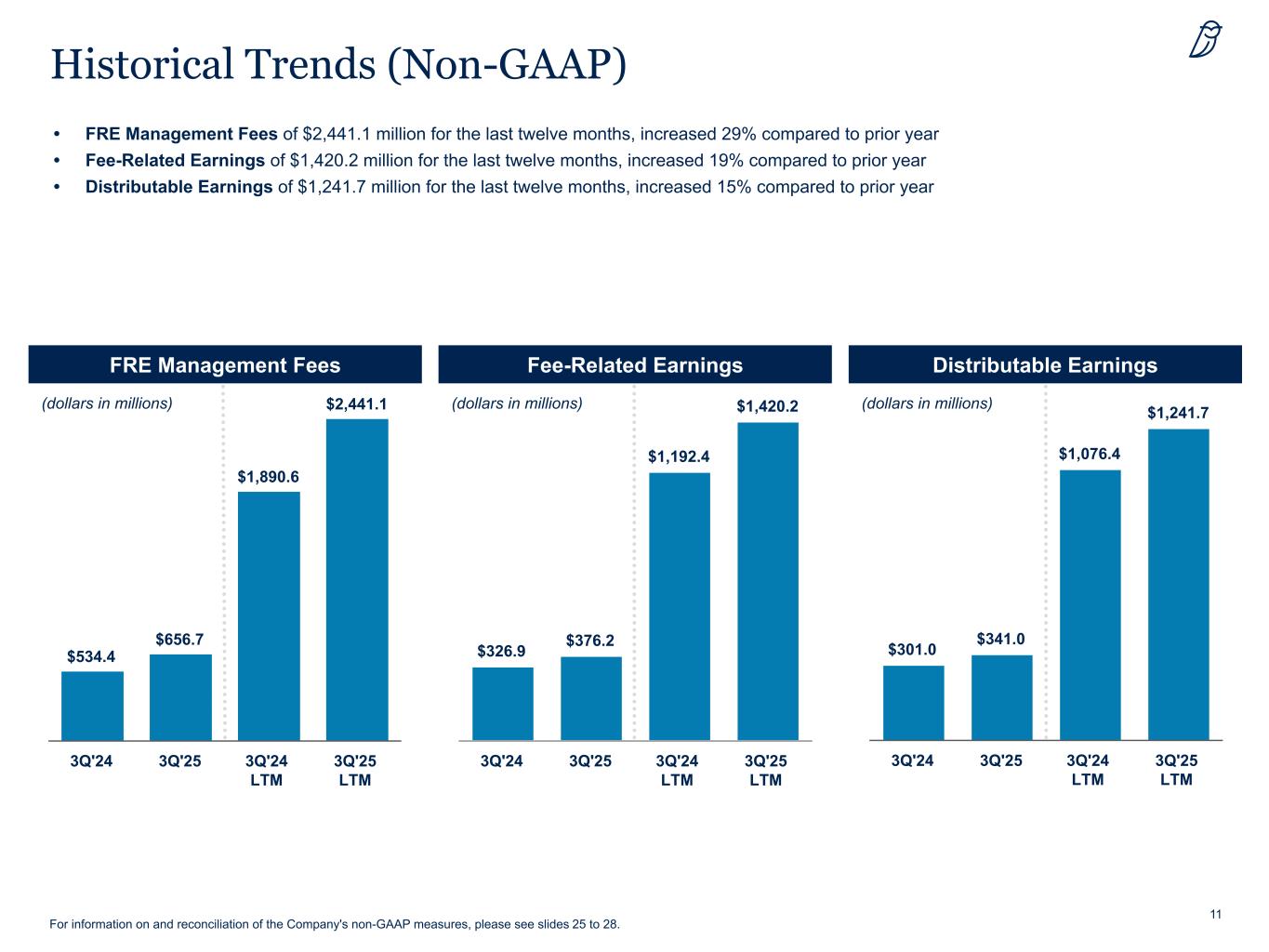 10 Non-GAAP Results (Unaudited) Quarter Ended Last Twelve Months (dollars in thousands, except per share data) 3Q'25 3Q'24 % Change 3Q'25 3Q'24 % Change FRE Revenues Credit (including Part I Fees of $149,173, $138,300, $552,392 and $493,551) $ 401,605 $ 325,210 23% $ 1,474,268 $ 1,133,606 30% Real Assets 91,840 49,705 85% 327,565 166,227 97% GP Strategic Capital (including Part I Fees of $1,268, $2,376, $6,150 and $8,651) 163,254 159,510 2% 639,221 590,802 8% FRE Management Fees, Net 656,699 534,425 23% 2,441,054 1,890,635 29% FRE Administrative, Transaction and Other Fees 30,110 33,622 (10%) 99,331 149,266 (33%) FRE Performance Revenues 188 280 (33%) 8,536 3,789 125% FRE Revenues 686,997 568,327 21% 2,548,921 2,043,690 25% FRE Expenses FRE Compensation and Benefits 208,163 171,916 21% 747,120 590,638 26% FRE General, Administrative and Other Expenses 86,587 59,188 46% 335,745 229,228 46% FRE Expenses 294,750 231,104 28% 1,082,865 819,866 32% Fee-Related Earnings 376,175 326,862 15% 1,420,240 1,192,427 19% Distributable Earnings 341,002 301,007 13% 1,241,709 1,076,356 15% Adjusted Per Share Information Fee-Related Earnings per Adjusted Share $ 0.24 $ 0.22 Distributable Earnings per Adjusted Share $ 0.22 $ 0.20 Supplemental Information Credit $ 429,464 $ 356,682 20% $ 1,566,419 $ 1,277,506 23% Real Assets 92,474 50,161 84% 335,328 168,744 99% GP Strategic Capital 165,059 161,484 2% 647,174 597,440 8% FRE Revenues 686,997 568,327 21% 2,548,921 2,043,690 25% FRE Margin 57.1% 59.3% 57.5% 59.9% FRE Management Fees as % from Permanent Capital 86% 91% 86% 91% For information on and reconciliation of the Company's non-GAAP measures, please see slides 25 to 28.