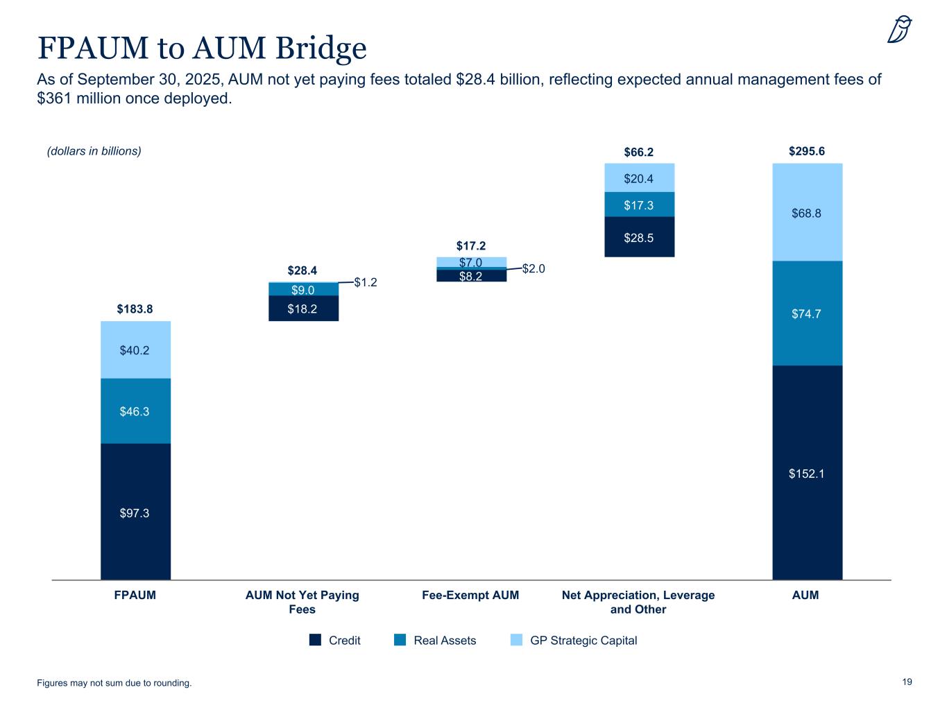 19 As of September 30, 2025, AUM not yet paying fees totaled $28.4 billion, reflecting expected annual management fees of $361 million once deployed. FPAUM to AUM Bridge $51.2 $71.6 $28.6 $183.8 $295.6 $97.3 $18.2 $8.2 $28.5 152.1 $46.3 $9.0 $17.3 $74.7 $40.2 $7.0 $20.4 $68.8 $28.4 $17.2 $66.2 Credit Real Assets GP Strategic Capital FPAUM AUM Not Yet Paying Fees Fee-Exempt AUM Net Appreciation, Leverage and Other AUM $2.0 $1.2 Figures may not sum due to rounding. (dollars in billions)