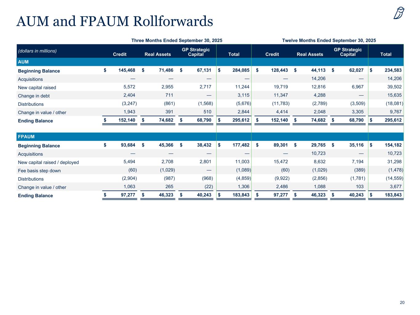 20 AUM and FPAUM Rollforwards Three Months Ended September 30, 2025 Twelve Months Ended September 30, 2025 (dollars in millions) Credit Real Assets GP Strategic Capital Total Credit Real Assets GP Strategic Capital Total AUM Beginning Balance $ 145,468 $ 71,486 $ 67,131 $ 284,085 $ 128,443 $ 44,113 $ 62,027 $ 234,583 Acquisitions — — — — — 14,206 — 14,206 New capital raised 5,572 2,955 2,717 11,244 19,719 12,816 6,967 39,502 Change in debt 2,404 711 — 3,115 11,347 4,288 — 15,635 Distributions (3,247) (861) (1,568) (5,676) (11,783) (2,789) (3,509) (18,081) Change in value / other 1,943 391 510 2,844 4,414 2,048 3,305 9,767 Ending Balance $ 152,140 $ 74,682 $ 68,790 $ 295,612 $ 152,140 $ 74,682 $ 68,790 $ 295,612 FPAUM Beginning Balance $ 93,684 $ 45,366 $ 38,432 $ 177,482 $ 89,301 $ 29,765 $ 35,116 $ 154,182 Acquisitions — — — — — 10,723 — 10,723 New capital raised / deployed 5,494 2,708 2,801 11,003 15,472 8,632 7,194 31,298 Fee basis step down (60) (1,029) — (1,089) (60) (1,029) (389) (1,478) Distributions (2,904) (987) (968) (4,859) (9,922) (2,856) (1,781) (14,559) Change in value / other 1,063 265 (22) 1,306 2,486 1,088 103 3,677 Ending Balance $ 97,277 $ 46,323 $ 40,243 $ 183,843 $ 97,277 $ 46,323 $ 40,243 $ 183,843