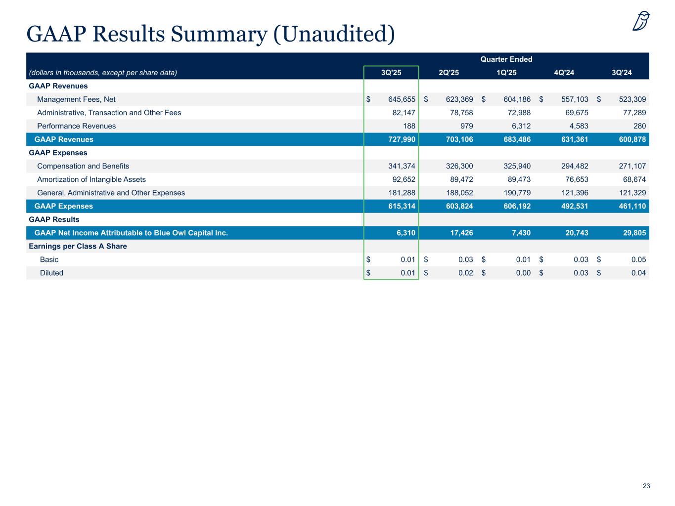 22 GAAP Results (Unaudited) Quarter Ended Last Twelve Months (dollars in thousands, except share and per share data) 3Q'25 3Q'24 3Q'25 3Q'24 Revenues Management fees, net (includes Part I Fees of $150,441, $140,676, $558,542 and $502,202) $ 645,655 $ 523,309 $ 2,430,313 $ 1,847,539 Administrative, transaction and other fees 82,147 77,289 303,568 304,934 Performance revenues 188 280 12,062 5,628 Total Revenues, Net 727,990 600,878 2,745,943 2,158,101 Expenses Compensation and benefits 341,374 271,107 1,288,096 973,768 Amortization of intangible assets 92,652 68,674 348,250 238,412 General, administrative and other expenses 181,288 121,329 681,515 361,243 Total Expenses 615,314 461,110 2,317,861 1,573,423 Other Loss Net gains (losses) on investments 9,736 3,748 (8,216) 11,333 Interest and dividend income 11,645 12,213 45,307 36,850 Interest expense (42,352) (34,102) (155,455) (107,789) Change in TRA liability (2,980) 6,849 (7,092) (4,953) Change in warrant liability — (6,300) (20,350) (28,450) Change in earnout liability (33,404) (10,056) (28,046) (12,208) Total Other Loss (57,355) (27,648) (173,852) (105,217) Income Before Income Taxes 55,321 112,120 254,230 479,461 Income tax expense 7,948 12,796 28,436 48,878 Consolidated Net Income 47,373 99,324 225,794 430,583 Net income attributable to noncontrolling interests (41,063) (69,519) (173,885) (323,684) Net Income Attributable to Blue Owl Capital Inc. $ 6,310 $ 29,805 $ 51,909 $ 106,899 Net Income Attributable to Class A Shares $ 6,310 $ 29,805 $ 51,909 $ 106,899 Earnings per Class A Share Basic $ 0.01 $ 0.05 Diluted $ 0.01 $ 0.04 Weighted-Average Class A Shares Basic 667,112,339 575,249,883 Diluted 673,928,845 1,491,724,950