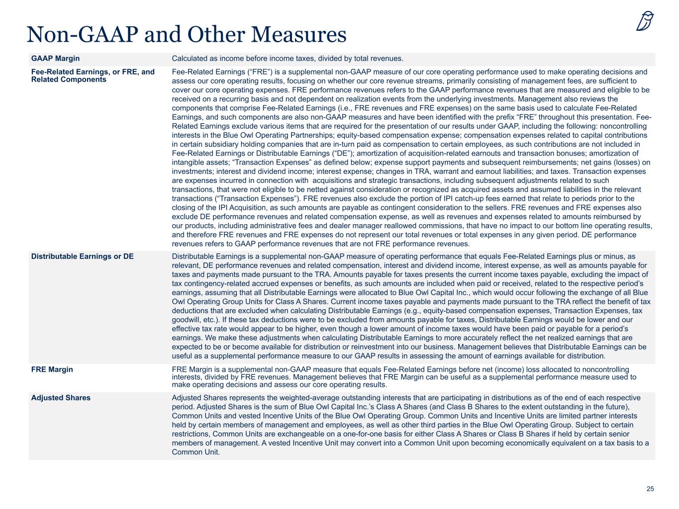 25 Non-GAAP and Other Measures GAAP Margin Calculated as income before income taxes, divided by total revenues. Fee-Related Earnings, or FRE, and Related Components Fee-Related Earnings (“FRE”) is a supplemental non-GAAP measure of our core operating performance used to make operating decisions and assess our core operating results, focusing on whether our core revenue streams, primarily consisting of management fees, are sufficient to cover our core operating expenses. FRE performance revenues refers to the GAAP performance revenues that are measured and eligible to be received on a recurring basis and not dependent on realization events from the underlying investments. Management also reviews the components that comprise Fee-Related Earnings (i.e., FRE revenues and FRE expenses) on the same basis used to calculate Fee-Related Earnings, and such components are also non-GAAP measures and have been identified with the prefix “FRE” throughout this presentation. Fee- Related Earnings exclude various items that are required for the presentation of our results under GAAP, including the following: noncontrolling interests in the Blue Owl Operating Partnerships; equity-based compensation expense; compensation expenses related to capital contributions in certain subsidiary holding companies that are in-turn paid as compensation to certain employees, as such contributions are not included in Fee-Related Earnings or Distributable Earnings (“DE”); amortization of acquisition-related earnouts and transaction bonuses; amortization of intangible assets; “Transaction Expenses” as defined below; expense support payments and subsequent reimbursements; net gains (losses) on investments; interest and dividend income; interest expense; changes in TRA, warrant and earnout liabilities; and taxes. Transaction expenses are expenses incurred in connection with acquisitions and strategic transactions, including subsequent adjustments related to such transactions, that were not eligible to be netted against consideration or recognized as acquired assets and assumed liabilities in the relevant transactions (“Transaction Expenses”). FRE revenues also exclude the portion of IPI catch-up fees earned that relate to periods prior to the closing of the IPI Acquisition, as such amounts are payable as contingent consideration to the sellers. FRE revenues and FRE expenses also exclude DE performance revenues and related compensation expense, as well as revenues and expenses related to amounts reimbursed by our products, including administrative fees and dealer manager reallowed commissions, that have no impact to our bottom line operating results, and therefore FRE revenues and FRE expenses do not represent our total revenues or total expenses in any given period. DE performance revenues refers to GAAP performance revenues that are not FRE performance revenues. Distributable Earnings or DE Distributable Earnings is a supplemental non-GAAP measure of operating performance that equals Fee-Related Earnings plus or minus, as relevant, DE performance revenues and related compensation, interest and dividend income, interest expense, as well as amounts payable for taxes and payments made pursuant to the TRA. Amounts payable for taxes presents the current income taxes payable, excluding the impact of tax contingency-related accrued expenses or benefits, as such amounts are included when paid or received, related to the respective period’s earnings, assuming that all Distributable Earnings were allocated to Blue Owl Capital Inc., which would occur following the exchange of all Blue Owl Operating Group Units for Class A Shares. Current income taxes payable and payments made pursuant to the TRA reflect the benefit of tax deductions that are excluded when calculating Distributable Earnings (e.g., equity-based compensation expenses, Transaction Expenses, tax goodwill, etc.). If these tax deductions were to be excluded from amounts payable for taxes, Distributable Earnings would be lower and our effective tax rate would appear to be higher, even though a lower amount of income taxes would have been paid or payable for a period’s earnings. We make these adjustments when calculating Distributable Earnings to more accurately reflect the net realized earnings that are expected to be or become available for distribution or reinvestment into our business. Management believes that Distributable Earnings can be useful as a supplemental performance measure to our GAAP results in assessing the amount of earnings available for distribution. FRE Margin FRE Margin is a supplemental non-GAAP measure that equals Fee-Related Earnings before net (income) loss allocated to noncontrolling interests, divided by FRE revenues. Management believes that FRE Margin can be useful as a supplemental performance measure used to make operating decisions and assess our core operating results. Adjusted Shares Adjusted Shares represents the weighted-average outstanding interests that are participating in distributions as of the end of each respective period. Adjusted Shares is the sum of Blue Owl Capital Inc.’s Class A Shares (and Class B Shares to the extent outstanding in the future), Common Units and vested Incentive Units of the Blue Owl Operating Group. Common Units and Incentive Units are limited partner interests held by certain members of management and employees, as well as other third parties in the Blue Owl Operating Group. Subject to certain restrictions, Common Units are exchangeable on a one-for-one basis for either Class A Shares or Class B Shares if held by certain senior members of management. A vested Incentive Unit may convert into a Common Unit upon becoming economically equivalent on a tax basis to a Common Unit.