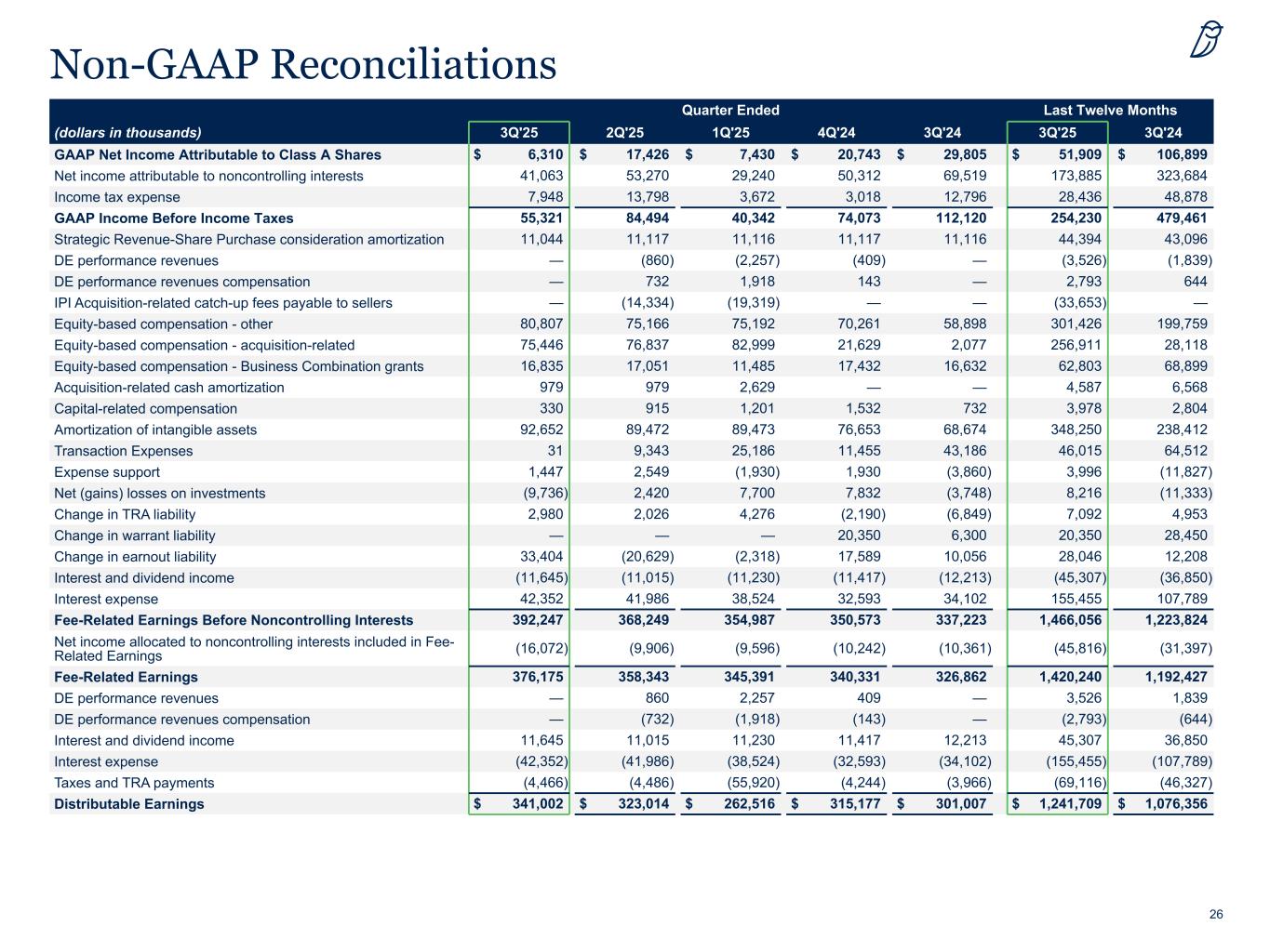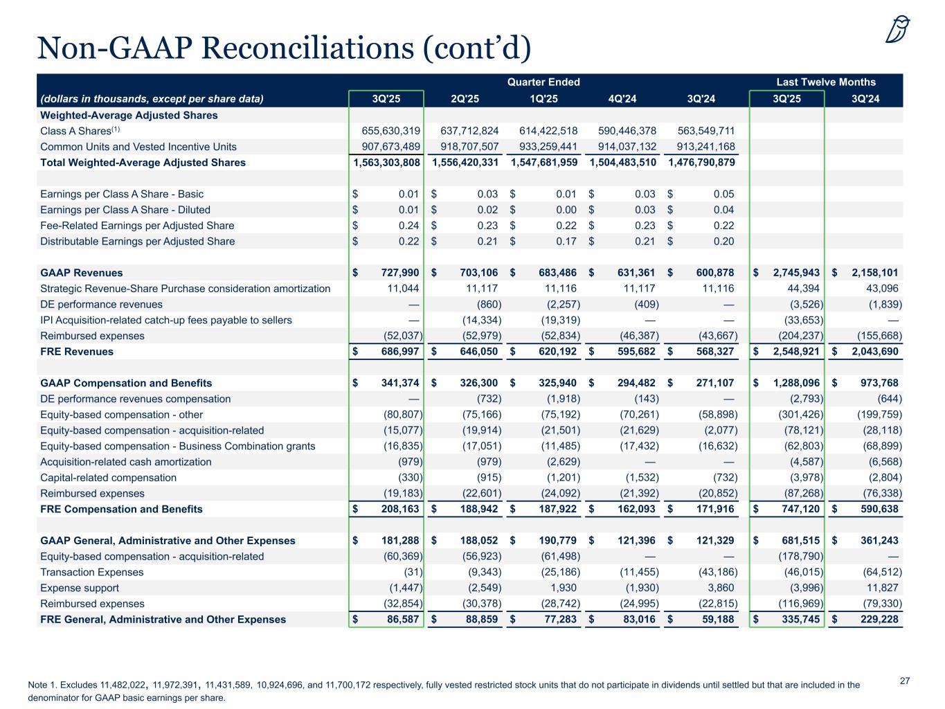 26 Non-GAAP Reconciliations Quarter Ended Last Twelve Months (dollars in thousands) 3Q'25 2Q'25 1Q'25 4Q'24 3Q'24 3Q'25 3Q'24 GAAP Net Income Attributable to Class A Shares $ 6,310 $ 17,426 $ 7,430 $ 20,743 $ 29,805 $ 51,909 $ 106,899 Net income attributable to noncontrolling interests 41,063 53,270 29,240 50,312 69,519 173,885 323,684 Income tax expense 7,948 13,798 3,672 3,018 12,796 28,436 48,878 GAAP Income Before Income Taxes 55,321 84,494 40,342 74,073 112,120 254,230 479,461 Strategic Revenue-Share Purchase consideration amortization 11,044 11,117 11,116 11,117 11,116 44,394 43,096 DE performance revenues — (860) (2,257) (409) — (3,526) (1,839) DE performance revenues compensation — 732 1,918 143 — 2,793 644 IPI Acquisition-related catch-up fees payable to sellers — (14,334) (19,319) — — (33,653) — Equity-based compensation - other 80,807 75,166 75,192 70,261 58,898 301,426 199,759 Equity-based compensation - acquisition-related 75,446 76,837 82,999 21,629 2,077 256,911 28,118 Equity-based compensation - Business Combination grants 16,835 17,051 11,485 17,432 16,632 62,803 68,899 Acquisition-related cash amortization 979 979 2,629 — — 4,587 6,568 Capital-related compensation 330 915 1,201 1,532 732 3,978 2,804 Amortization of intangible assets 92,652 89,472 89,473 76,653 68,674 348,250 238,412 Transaction Expenses 31 9,343 25,186 11,455 43,186 46,015 64,512 Expense support 1,447 2,549 (1,930) 1,930 (3,860) 3,996 (11,827) Net (gains) losses on investments (9,736) 2,420 7,700 7,832 (3,748) 8,216 (11,333) Change in TRA liability 2,980 2,026 4,276 (2,190) (6,849) 7,092 4,953 Change in warrant liability — — — 20,350 6,300 20,350 28,450 Change in earnout liability 33,404 (20,629) (2,318) 17,589 10,056 28,046 12,208 Interest and dividend income (11,645) (11,015) (11,230) (11,417) (12,213) (45,307) (36,850) Interest expense 42,352 41,986 38,524 32,593 34,102 155,455 107,789 Fee-Related Earnings Before Noncontrolling Interests 392,247 368,249 354,987 350,573 337,223 1,466,056 1,223,824 Net income allocated to noncontrolling interests included in Fee- Related Earnings (16,072) (9,906) (9,596) (10,242) (10,361) (45,816) (31,397) Fee-Related Earnings 376,175 358,343 345,391 340,331 326,862 1,420,240 1,192,427 DE performance revenues — 860 2,257 409 — 3,526 1,839 DE performance revenues compensation — (732) (1,918) (143) — (2,793) (644) Interest and dividend income 11,645 11,015 11,230 11,417 12,213 45,307 36,850 Interest expense (42,352) (41,986) (38,524) (32,593) (34,102) (155,455) (107,789) Taxes and TRA payments (4,466) (4,486) (55,920) (4,244) (3,966) (69,116) (46,327) Distributable Earnings $ 341,002 $ 323,014 $ 262,516 $ 315,177 $ 301,007 $ 1,241,709 $ 1,076,356