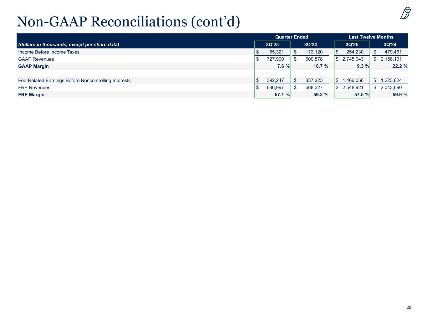 27 Non-GAAP Reconciliations (cont’d) Quarter Ended Last Twelve Months (dollars in thousands, except per share data) 3Q'25 2Q'25 1Q'25 4Q'24 3Q'24 3Q'25 3Q'24 Weighted-Average Adjusted Shares Class A Shares(1) 655,630,319 637,712,824 614,422,518 590,446,378 563,549,711 Common Units and Vested Incentive Units 907,673,489 918,707,507 933,259,441 914,037,132 913,241,168 Total Weighted-Average Adjusted Shares 1,563,303,808 1,556,420,331 1,547,681,959 1,504,483,510 1,476,790,879 Earnings per Class A Share - Basic $ 0.01 $ 0.03 $ 0.01 $ 0.03 $ 0.05 Earnings per Class A Share - Diluted $ 0.01 $ 0.02 $ 0.00 $ 0.03 $ 0.04 Fee-Related Earnings per Adjusted Share $ 0.24 $ 0.23 $ 0.22 $ 0.23 $ 0.22 Distributable Earnings per Adjusted Share $ 0.22 $ 0.21 $ 0.17 $ 0.21 $ 0.20 GAAP Revenues $ 727,990 $ 703,106 $ 683,486 $ 631,361 $ 600,878 $ 2,745,943 $ 2,158,101 Strategic Revenue-Share Purchase consideration amortization 11,044 11,117 11,116 11,117 11,116 44,394 43,096 DE performance revenues — (860) (2,257) (409) — (3,526) (1,839) IPI Acquisition-related catch-up fees payable to sellers — (14,334) (19,319) — — (33,653) — Reimbursed expenses (52,037) (52,979) (52,834) (46,387) (43,667) (204,237) (155,668) FRE Revenues $ 686,997 $ 646,050 $ 620,192 $ 595,682 $ 568,327 $ 2,548,921 $ 2,043,690 GAAP Compensation and Benefits $ 341,374 $ 326,300 $ 325,940 $ 294,482 $ 271,107 $ 1,288,096 $ 973,768 DE performance revenues compensation — (732) (1,918) (143) — (2,793) (644) Equity-based compensation - other (80,807) (75,166) (75,192) (70,261) (58,898) (301,426) (199,759) Equity-based compensation - acquisition-related (15,077) (19,914) (21,501) (21,629) (2,077) (78,121) (28,118) Equity-based compensation - Business Combination grants (16,835) (17,051) (11,485) (17,432) (16,632) (62,803) (68,899) Acquisition-related cash amortization (979) (979) (2,629) — — (4,587) (6,568) Capital-related compensation (330) (915) (1,201) (1,532) (732) (3,978) (2,804) Reimbursed expenses (19,183) (22,601) (24,092) (21,392) (20,852) (87,268) (76,338) FRE Compensation and Benefits $ 208,163 $ 188,942 $ 187,922 $ 162,093 $ 171,916 $ 747,120 $ 590,638 GAAP General, Administrative and Other Expenses $ 181,288 $ 188,052 $ 190,779 $ 121,396 $ 121,329 $ 681,515 $ 361,243 Equity-based compensation - acquisition-related (60,369) (56,923) (61,498) — — (178,790) — Transaction Expenses (31) (9,343) (25,186) (11,455) (43,186) (46,015) (64,512) Expense support (1,447) (2,549) 1,930 (1,930) 3,860 (3,996) 11,827 Reimbursed expenses (32,854) (30,378) (28,742) (24,995) (22,815) (116,969) (79,330) FRE General, Administrative and Other Expenses $ 86,587 $ 88,859 $ 77,283 $ 83,016 $ 59,188 $ 335,745 $ 229,228 Note 1. Excludes 11,482,022, 11,972,391, 11,431,589, 10,924,696, and 11,700,172 respectively, fully vested restricted stock units that do not participate in dividends until settled but that are included in the denominator for GAAP basic earnings per share.