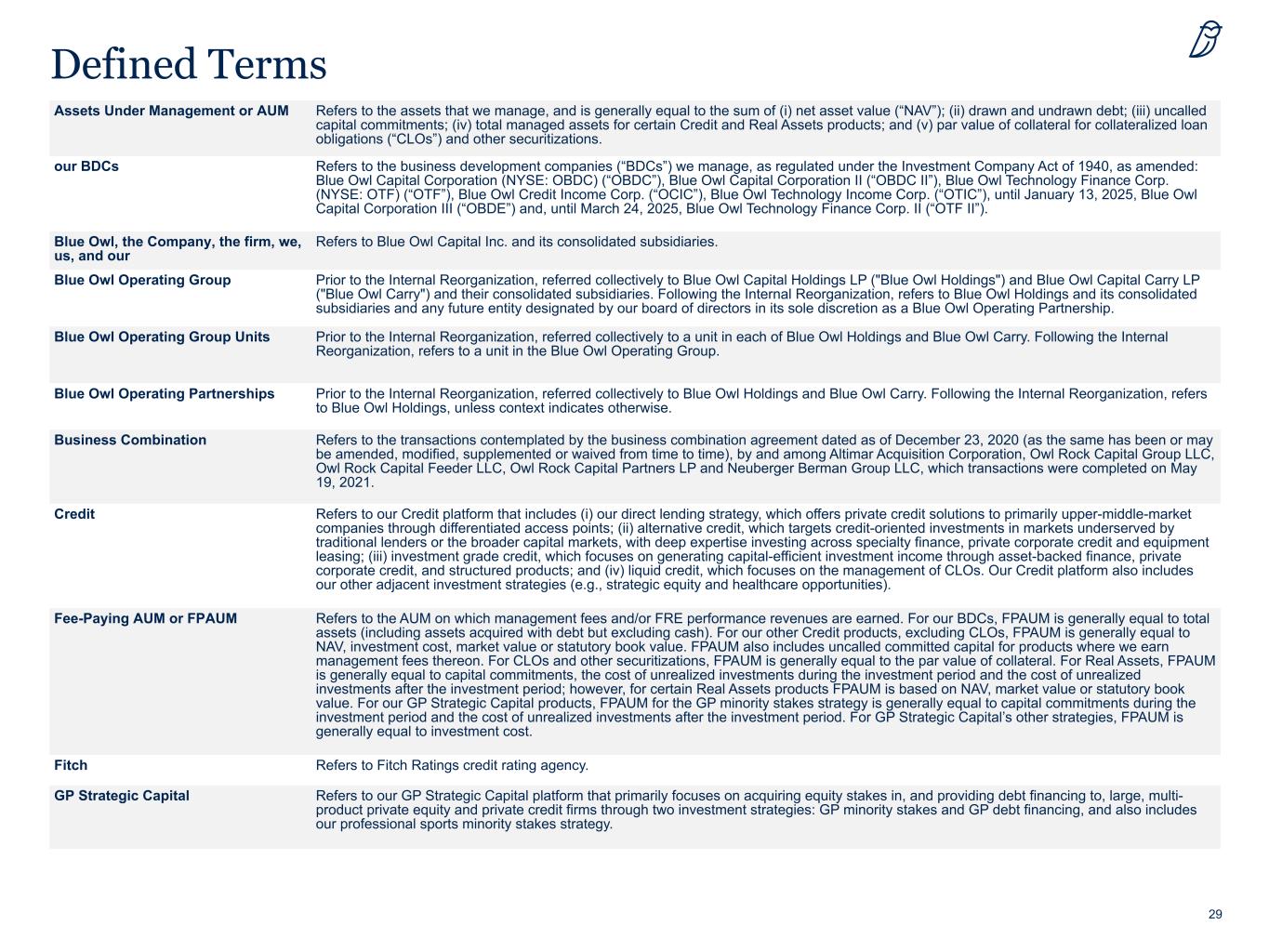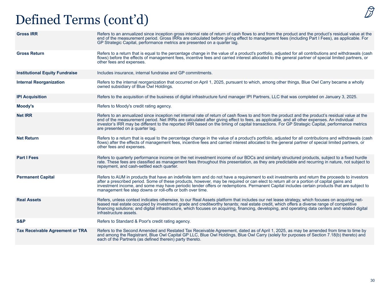 29 Defined Terms Assets Under Management or AUM Refers to the assets that we manage, and is generally equal to the sum of (i) net asset value (“NAV”); (ii) drawn and undrawn debt; (iii) uncalled capital commitments; (iv) total managed assets for certain Credit and Real Assets products; and (v) par value of collateral for collateralized loan obligations (“CLOs”) and other securitizations. our BDCs Refers to the business development companies (“BDCs”) we manage, as regulated under the Investment Company Act of 1940, as amended: Blue Owl Capital Corporation (NYSE: OBDC) (“OBDC”), Blue Owl Capital Corporation II (“OBDC II”), Blue Owl Technology Finance Corp. (NYSE: OTF) (“OTF”), Blue Owl Credit Income Corp. (“OCIC”), Blue Owl Technology Income Corp. (“OTIC”), until January 13, 2025, Blue Owl Capital Corporation III (“OBDE”) and, until March 24, 2025, Blue Owl Technology Finance Corp. II (“OTF II”). Blue Owl, the Company, the firm, we, us, and our Refers to Blue Owl Capital Inc. and its consolidated subsidiaries. Blue Owl Operating Group Prior to the Internal Reorganization, referred collectively to Blue Owl Capital Holdings LP ("Blue Owl Holdings") and Blue Owl Capital Carry LP ("Blue Owl Carry") and their consolidated subsidiaries. Following the Internal Reorganization, refers to Blue Owl Holdings and its consolidated subsidiaries and any future entity designated by our board of directors in its sole discretion as a Blue Owl Operating Partnership. Blue Owl Operating Group Units Prior to the Internal Reorganization, referred collectively to a unit in each of Blue Owl Holdings and Blue Owl Carry. Following the Internal Reorganization, refers to a unit in the Blue Owl Operating Group. Blue Owl Operating Partnerships Prior to the Internal Reorganization, referred collectively to Blue Owl Holdings and Blue Owl Carry. Following the Internal Reorganization, refers to Blue Owl Holdings, unless context indicates otherwise. Business Combination Refers to the transactions contemplated by the business combination agreement dated as of December 23, 2020 (as the same has been or may be amended, modified, supplemented or waived from time to time), by and among Altimar Acquisition Corporation, Owl Rock Capital Group LLC, Owl Rock Capital Feeder LLC, Owl Rock Capital Partners LP and Neuberger Berman Group LLC, which transactions were completed on May 19, 2021. Credit Refers to our Credit platform that includes (i) our direct lending strategy, which offers private credit solutions to primarily upper-middle-market companies through differentiated access points; (ii) alternative credit, which targets credit-oriented investments in markets underserved by traditional lenders or the broader capital markets, with deep expertise investing across specialty finance, private corporate credit and equipment leasing; (iii) investment grade credit, which focuses on generating capital-efficient investment income through asset-backed finance, private corporate credit, and structured products; and (iv) liquid credit, which focuses on the management of CLOs. Our Credit platform also includes our other adjacent investment strategies (e.g., strategic equity and healthcare opportunities). Fee-Paying AUM or FPAUM Refers to the AUM on which management fees and/or FRE performance revenues are earned. For our BDCs, FPAUM is generally equal to total assets (including assets acquired with debt but excluding cash). For our other Credit products, excluding CLOs, FPAUM is generally equal to NAV, investment cost, market value or statutory book value. FPAUM also includes uncalled committed capital for products where we earn management fees thereon. For CLOs and other securitizations, FPAUM is generally equal to the par value of collateral. For Real Assets, FPAUM is generally equal to capital commitments, the cost of unrealized investments during the investment period and the cost of unrealized investments after the investment period; however, for certain Real Assets products FPAUM is based on NAV, market value or statutory book value. For our GP Strategic Capital products, FPAUM for the GP minority stakes strategy is generally equal to capital commitments during the investment period and the cost of unrealized investments after the investment period. For GP Strategic Capital’s other strategies, FPAUM is generally equal to investment cost. Fitch Refers to Fitch Ratings credit rating agency. GP Strategic Capital Refers to our GP Strategic Capital platform that primarily focuses on acquiring equity stakes in, and providing debt financing to, large, multi- product private equity and private credit firms through two investment strategies: GP minority stakes and GP debt financing, and also includes our professional sports minority stakes strategy.