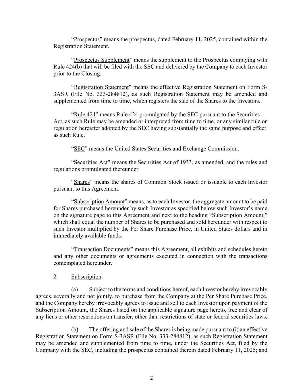 2 “Prospectus” means the prospectus, dated February 11, 2025, contained within the Registration Statement. “Prospectus Supplement” means the supplement to the Prospectus complying with Rule 424(b) that will be filed with the SEC and delivered by the Company to each Investor prior to the Closing. “Registration Statement” means the effective Registration Statement on Form S- 3ASR (File No. 333-284812), as such Registration Statement may be amended and supplemented from time to time, which registers the sale of the Shares to the Investors. “Rule 424” means Rule 424 promulgated by the SEC pursuant to the Securities Act, as such Rule may be amended or interpreted from time to time, or any similar rule or regulation hereafter adopted by the SEC having substantially the same purpose and effect as such Rule. “SEC” means the United States Securities and Exchange Commission. “Securities Act” means the Securities Act of 1933, as amended, and the rules and regulations promulgated thereunder. “Shares” means the shares of Common Stock issued or issuable to each Investor pursuant to this Agreement. “Subscription Amount” means, as to each Investor, the aggregate amount to be paid for Shares purchased hereunder by such Investor as specified below such Investor’s name on the signature page to this Agreement and next to the heading “Subscription Amount,” which shall equal the number of Shares to be purchased and sold hereunder with respect to such Investor multiplied by the Per Share Purchase Price, in United States dollars and in immediately available funds. “Transaction Documents” means this Agreement, all exhibits and schedules hereto and any other documents or agreements executed in connection with the transactions contemplated hereunder. 2. Subscription. (a) Subject to the terms and conditions hereof, each Investor hereby irrevocably agrees, severally and not jointly, to purchase from the Company at the Per Share Purchase Price, and the Company hereby irrevocably agrees to issue and sell to each Investor upon payment of the Subscription Amount, the Shares listed on the applicable signature page hereto, free and clear of any liens or other restrictions on transfer, other than restrictions of state or federal securities laws. (b) The offering and sale of the Shares is being made pursuant to (i) an effective Registration Statement on Form S-3ASR (File No. 333-284812), as such Registration Statement may be amended and supplemented from time to time, under the Securities Act, filed by the Company with the SEC, including the prospectus contained therein dated February 11, 2025; and