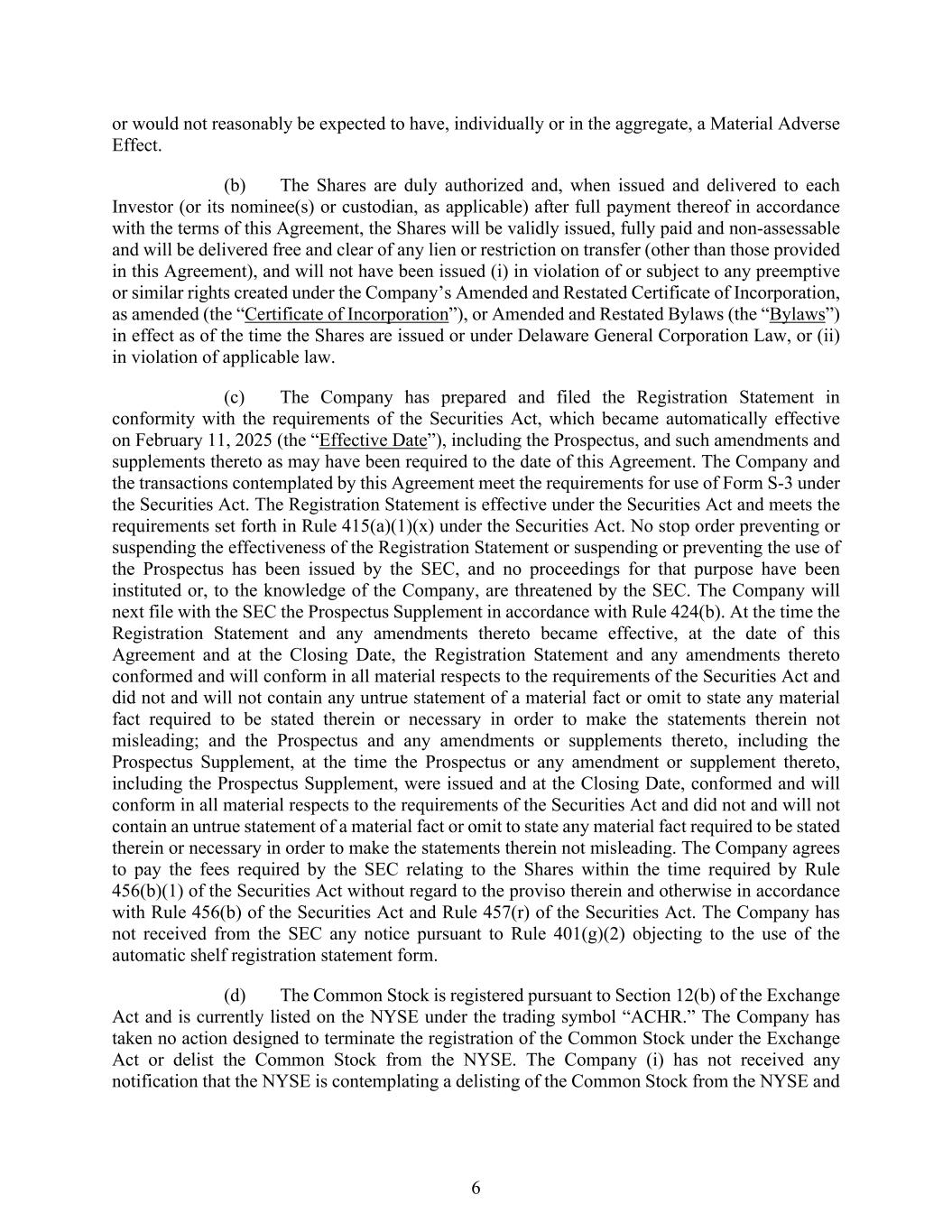 6 or would not reasonably be expected to have, individually or in the aggregate, a Material Adverse Effect. (b) The Shares are duly authorized and, when issued and delivered to each Investor (or its nominee(s) or custodian, as applicable) after full payment thereof in accordance with the terms of this Agreement, the Shares will be validly issued, fully paid and non-assessable and will be delivered free and clear of any lien or restriction on transfer (other than those provided in this Agreement), and will not have been issued (i) in violation of or subject to any preemptive or similar rights created under the Company’s Amended and Restated Certificate of Incorporation, as amended (the “Certificate of Incorporation”), or Amended and Restated Bylaws (the “Bylaws”) in effect as of the time the Shares are issued or under Delaware General Corporation Law, or (ii) in violation of applicable law. (c) The Company has prepared and filed the Registration Statement in conformity with the requirements of the Securities Act, which became automatically effective on February 11, 2025 (the “Effective Date”), including the Prospectus, and such amendments and supplements thereto as may have been required to the date of this Agreement. The Company and the transactions contemplated by this Agreement meet the requirements for use of Form S-3 under the Securities Act. The Registration Statement is effective under the Securities Act and meets the requirements set forth in Rule 415(a)(1)(x) under the Securities Act. No stop order preventing or suspending the effectiveness of the Registration Statement or suspending or preventing the use of the Prospectus has been issued by the SEC, and no proceedings for that purpose have been instituted or, to the knowledge of the Company, are threatened by the SEC. The Company will next file with the SEC the Prospectus Supplement in accordance with Rule 424(b). At the time the Registration Statement and any amendments thereto became effective, at the date of this Agreement and at the Closing Date, the Registration Statement and any amendments thereto conformed and will conform in all material respects to the requirements of the Securities Act and did not and will not contain any untrue statement of a material fact or omit to state any material fact required to be stated therein or necessary in order to make the statements therein not misleading; and the Prospectus and any amendments or supplements thereto, including the Prospectus Supplement, at the time the Prospectus or any amendment or supplement thereto, including the Prospectus Supplement, were issued and at the Closing Date, conformed and will conform in all material respects to the requirements of the Securities Act and did not and will not contain an untrue statement of a material fact or omit to state any material fact required to be stated therein or necessary in order to make the statements therein not misleading. The Company agrees to pay the fees required by the SEC relating to the Shares within the time required by Rule 456(b)(1) of the Securities Act without regard to the proviso therein and otherwise in accordance with Rule 456(b) of the Securities Act and Rule 457(r) of the Securities Act. The Company has not received from the SEC any notice pursuant to Rule 401(g)(2) objecting to the use of the automatic shelf registration statement form. (d) The Common Stock is registered pursuant to Section 12(b) of the Exchange Act and is currently listed on the NYSE under the trading symbol “ACHR.” The Company has taken no action designed to terminate the registration of the Common Stock under the Exchange Act or delist the Common Stock from the NYSE. The Company (i) has not received any notification that the NYSE is contemplating a delisting of the Common Stock from the NYSE and