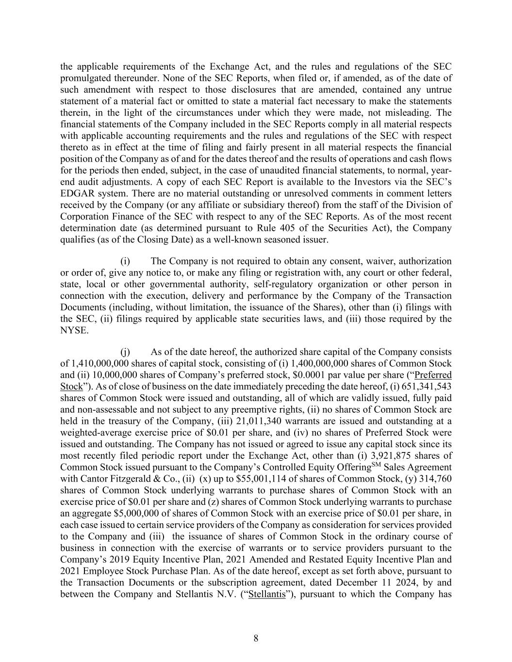 8 the applicable requirements of the Exchange Act, and the rules and regulations of the SEC promulgated thereunder. None of the SEC Reports, when filed or, if amended, as of the date of such amendment with respect to those disclosures that are amended, contained any untrue statement of a material fact or omitted to state a material fact necessary to make the statements therein, in the light of the circumstances under which they were made, not misleading. The financial statements of the Company included in the SEC Reports comply in all material respects with applicable accounting requirements and the rules and regulations of the SEC with respect thereto as in effect at the time of filing and fairly present in all material respects the financial position of the Company as of and for the dates thereof and the results of operations and cash flows for the periods then ended, subject, in the case of unaudited financial statements, to normal, year- end audit adjustments. A copy of each SEC Report is available to the Investors via the SEC’s EDGAR system. There are no material outstanding or unresolved comments in comment letters received by the Company (or any affiliate or subsidiary thereof) from the staff of the Division of Corporation Finance of the SEC with respect to any of the SEC Reports. As of the most recent determination date (as determined pursuant to Rule 405 of the Securities Act), the Company qualifies (as of the Closing Date) as a well-known seasoned issuer. (i) The Company is not required to obtain any consent, waiver, authorization or order of, give any notice to, or make any filing or registration with, any court or other federal, state, local or other governmental authority, self-regulatory organization or other person in connection with the execution, delivery and performance by the Company of the Transaction Documents (including, without limitation, the issuance of the Shares), other than (i) filings with the SEC, (ii) filings required by applicable state securities laws, and (iii) those required by the NYSE. (j) As of the date hereof, the authorized share capital of the Company consists of 1,410,000,000 shares of capital stock, consisting of (i) 1,400,000,000 shares of Common Stock and (ii) 10,000,000 shares of Company’s preferred stock, $0.0001 par value per share (“Preferred Stock”). As of close of business on the date immediately preceding the date hereof, (i) 651,341,543 shares of Common Stock were issued and outstanding, all of which are validly issued, fully paid and non-assessable and not subject to any preemptive rights, (ii) no shares of Common Stock are held in the treasury of the Company, (iii) 21,011,340 warrants are issued and outstanding at a weighted-average exercise price of $0.01 per share, and (iv) no shares of Preferred Stock were issued and outstanding. The Company has not issued or agreed to issue any capital stock since its most recently filed periodic report under the Exchange Act, other than (i) 3,921,875 shares of Common Stock issued pursuant to the Company’s Controlled Equity OfferingSM Sales Agreement with Cantor Fitzgerald & Co., (ii) (x) up to $55,001,114 of shares of Common Stock, (y) 314,760 shares of Common Stock underlying warrants to purchase shares of Common Stock with an exercise price of $0.01 per share and (z) shares of Common Stock underlying warrants to purchase an aggregate $5,000,000 of shares of Common Stock with an exercise price of $0.01 per share, in each case issued to certain service providers of the Company as consideration for services provided to the Company and (iii) the issuance of shares of Common Stock in the ordinary course of business in connection with the exercise of warrants or to service providers pursuant to the Company’s 2019 Equity Incentive Plan, 2021 Amended and Restated Equity Incentive Plan and 2021 Employee Stock Purchase Plan. As of the date hereof, except as set forth above, pursuant to the Transaction Documents or the subscription agreement, dated December 11 2024, by and between the Company and Stellantis N.V. (“Stellantis”), pursuant to which the Company has