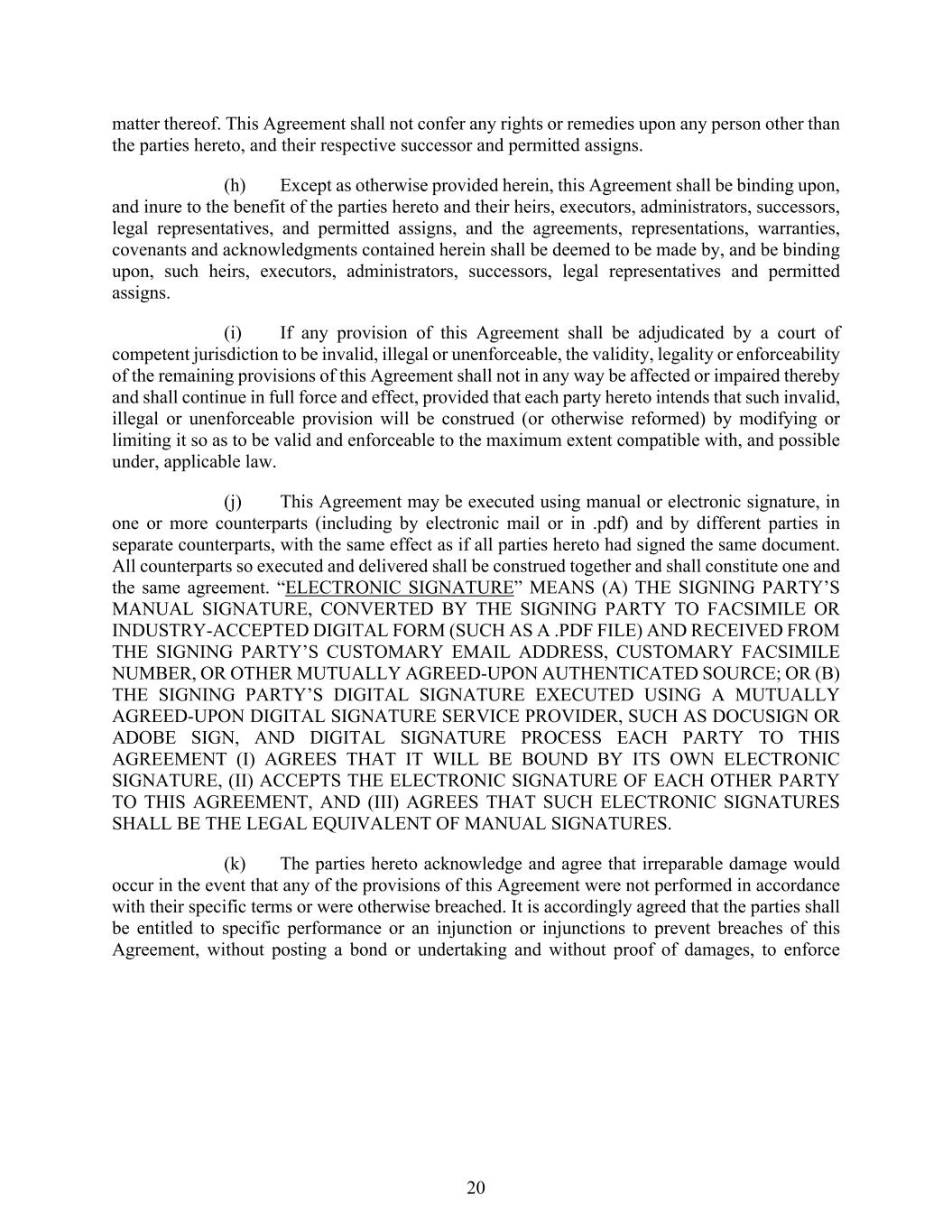 20 matter thereof. This Agreement shall not confer any rights or remedies upon any person other than the parties hereto, and their respective successor and permitted assigns. (h) Except as otherwise provided herein, this Agreement shall be binding upon, and inure to the benefit of the parties hereto and their heirs, executors, administrators, successors, legal representatives, and permitted assigns, and the agreements, representations, warranties, covenants and acknowledgments contained herein shall be deemed to be made by, and be binding upon, such heirs, executors, administrators, successors, legal representatives and permitted assigns. (i) If any provision of this Agreement shall be adjudicated by a court of competent jurisdiction to be invalid, illegal or unenforceable, the validity, legality or enforceability of the remaining provisions of this Agreement shall not in any way be affected or impaired thereby and shall continue in full force and effect, provided that each party hereto intends that such invalid, illegal or unenforceable provision will be construed (or otherwise reformed) by modifying or limiting it so as to be valid and enforceable to the maximum extent compatible with, and possible under, applicable law. (j) This Agreement may be executed using manual or electronic signature, in one or more counterparts (including by electronic mail or in .pdf) and by different parties in separate counterparts, with the same effect as if all parties hereto had signed the same document. All counterparts so executed and delivered shall be construed together and shall constitute one and the same agreement. “ELECTRONIC SIGNATURE” MEANS (A) THE SIGNING PARTY’S MANUAL SIGNATURE, CONVERTED BY THE SIGNING PARTY TO FACSIMILE OR INDUSTRY-ACCEPTED DIGITAL FORM (SUCH AS A .PDF FILE) AND RECEIVED FROM THE SIGNING PARTY’S CUSTOMARY EMAIL ADDRESS, CUSTOMARY FACSIMILE NUMBER, OR OTHER MUTUALLY AGREED-UPON AUTHENTICATED SOURCE; OR (B) THE SIGNING PARTY’S DIGITAL SIGNATURE EXECUTED USING A MUTUALLY AGREED-UPON DIGITAL SIGNATURE SERVICE PROVIDER, SUCH AS DOCUSIGN OR ADOBE SIGN, AND DIGITAL SIGNATURE PROCESS EACH PARTY TO THIS AGREEMENT (I) AGREES THAT IT WILL BE BOUND BY ITS OWN ELECTRONIC SIGNATURE, (II) ACCEPTS THE ELECTRONIC SIGNATURE OF EACH OTHER PARTY TO THIS AGREEMENT, AND (III) AGREES THAT SUCH ELECTRONIC SIGNATURES SHALL BE THE LEGAL EQUIVALENT OF MANUAL SIGNATURES. (k) The parties hereto acknowledge and agree that irreparable damage would occur in the event that any of the provisions of this Agreement were not performed in accordance with their specific terms or were otherwise breached. It is accordingly agreed that the parties shall be entitled to specific performance or an injunction or injunctions to prevent breaches of this Agreement, without posting a bond or undertaking and without proof of damages, to enforce