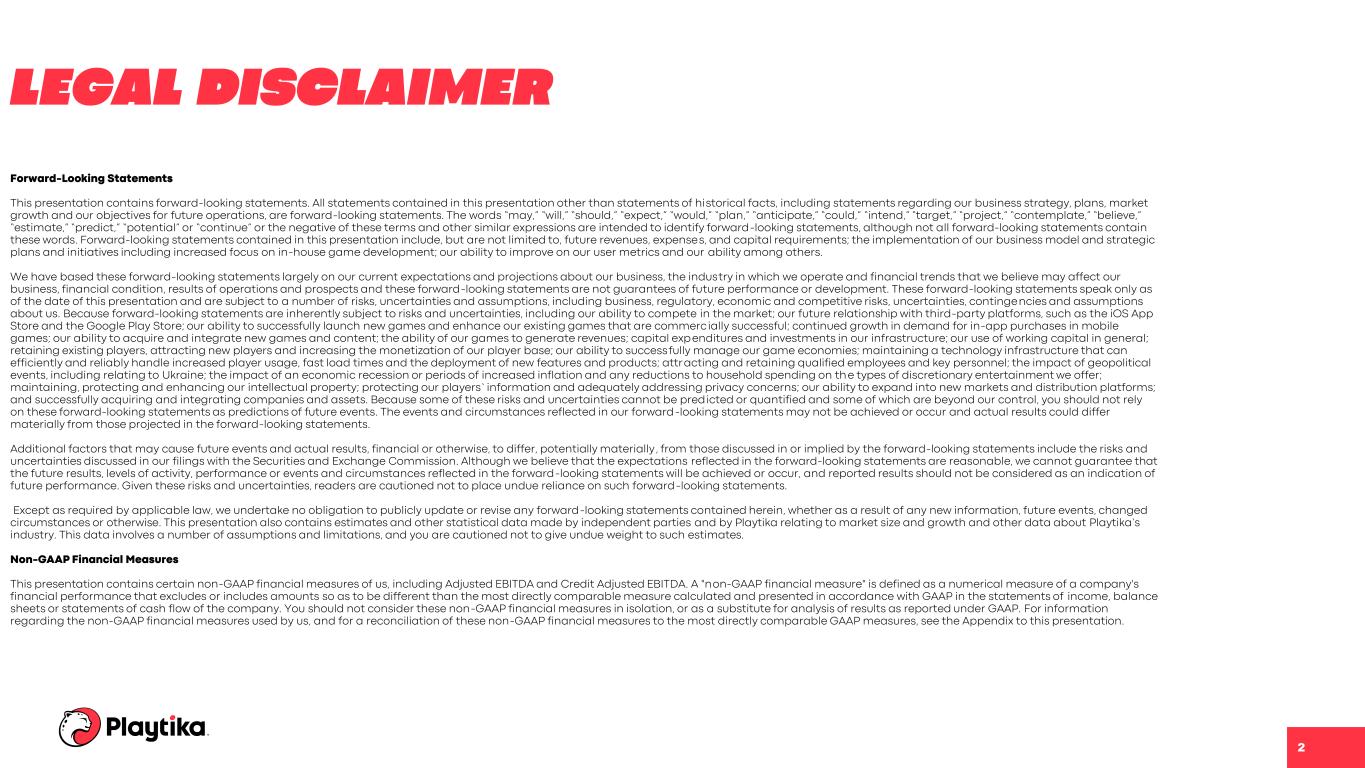 プレイティカの経営陣は、本日太平洋時間午前5時30分(東部時間午前8時30分)にカンファレンスコールを開催し、当社の業績について説明します。カンファレンス・コールは、investors.playtika.comからアクセス可能なウェブキャストを介して行うことができます。また、当日の模様は1時間後にウェブキャストで配信され、1年間保存されます。