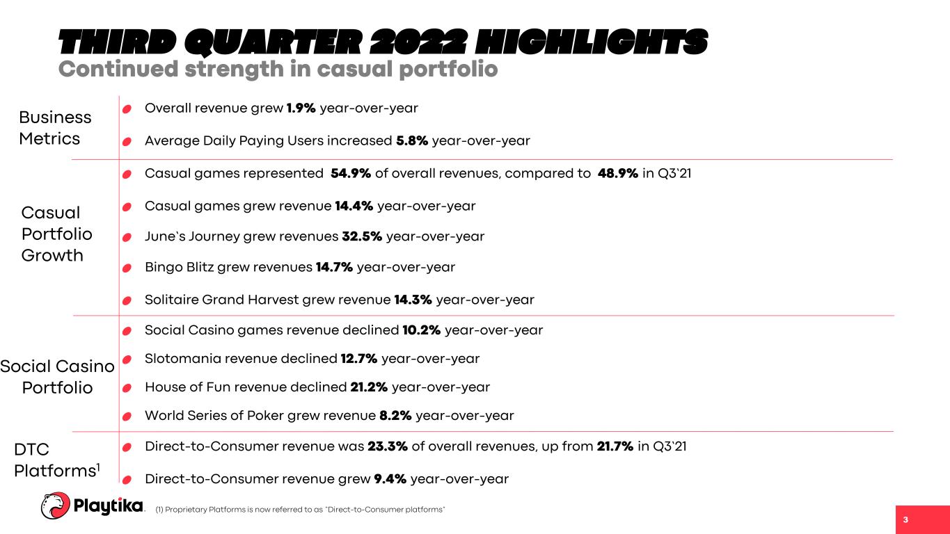 「プレイティカのカジュアルゲームは例外的に好調でした。ビンゴブリッツ』、『ソリティア グランドハーベスト』、『ジューンズジャーニー』は前年比で2桁の成長を達成し、その継続的な成功を非常に喜ばしく思っています。私たちは、エキサイティングな新機能を開発し、テクノロジーとデジタル化に焦点を当てた戦略的イニシアチブを推進し、モバイルゲームにおける当社のリーダーとしての地位を確立することで、将来に向けて有利な立場にあると確信しています」と述べています。