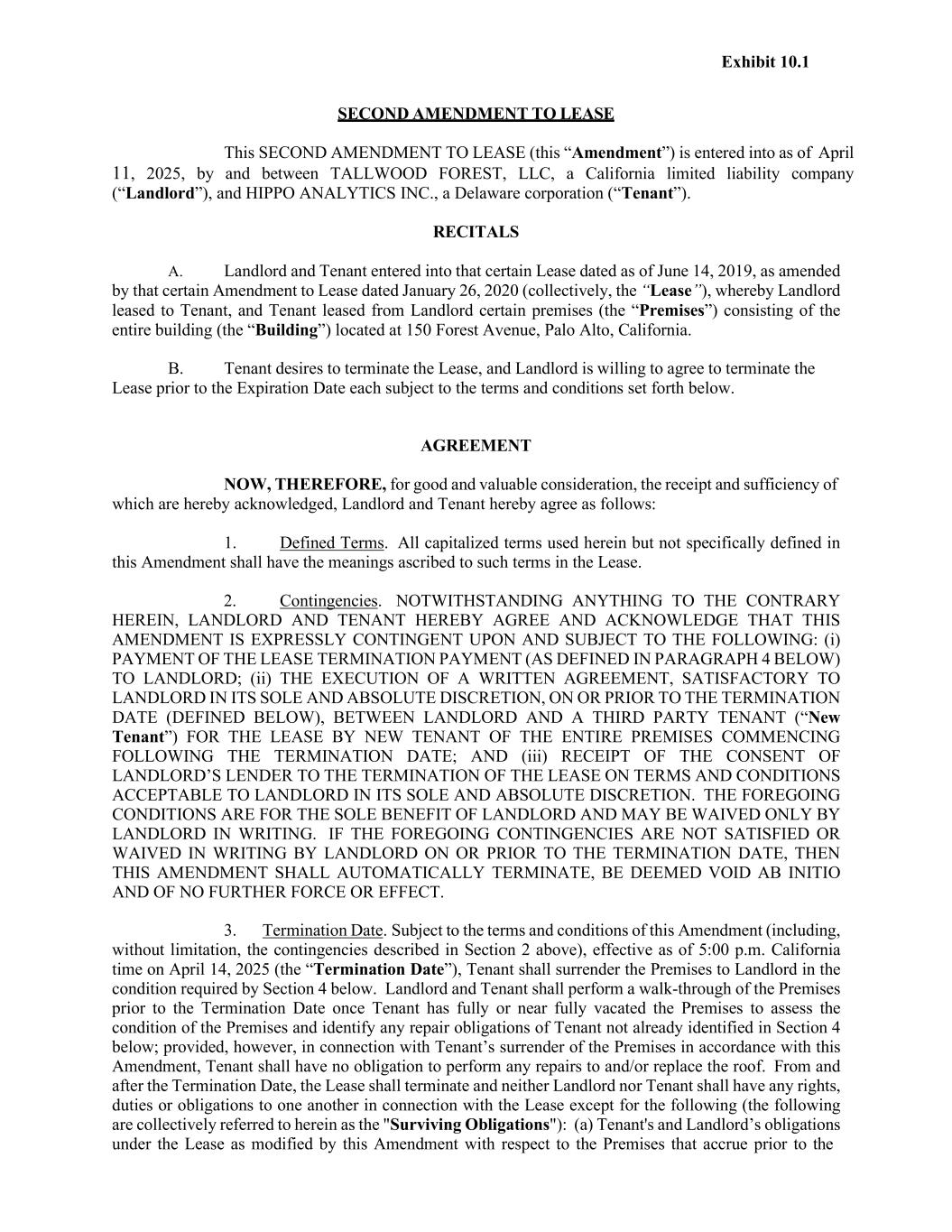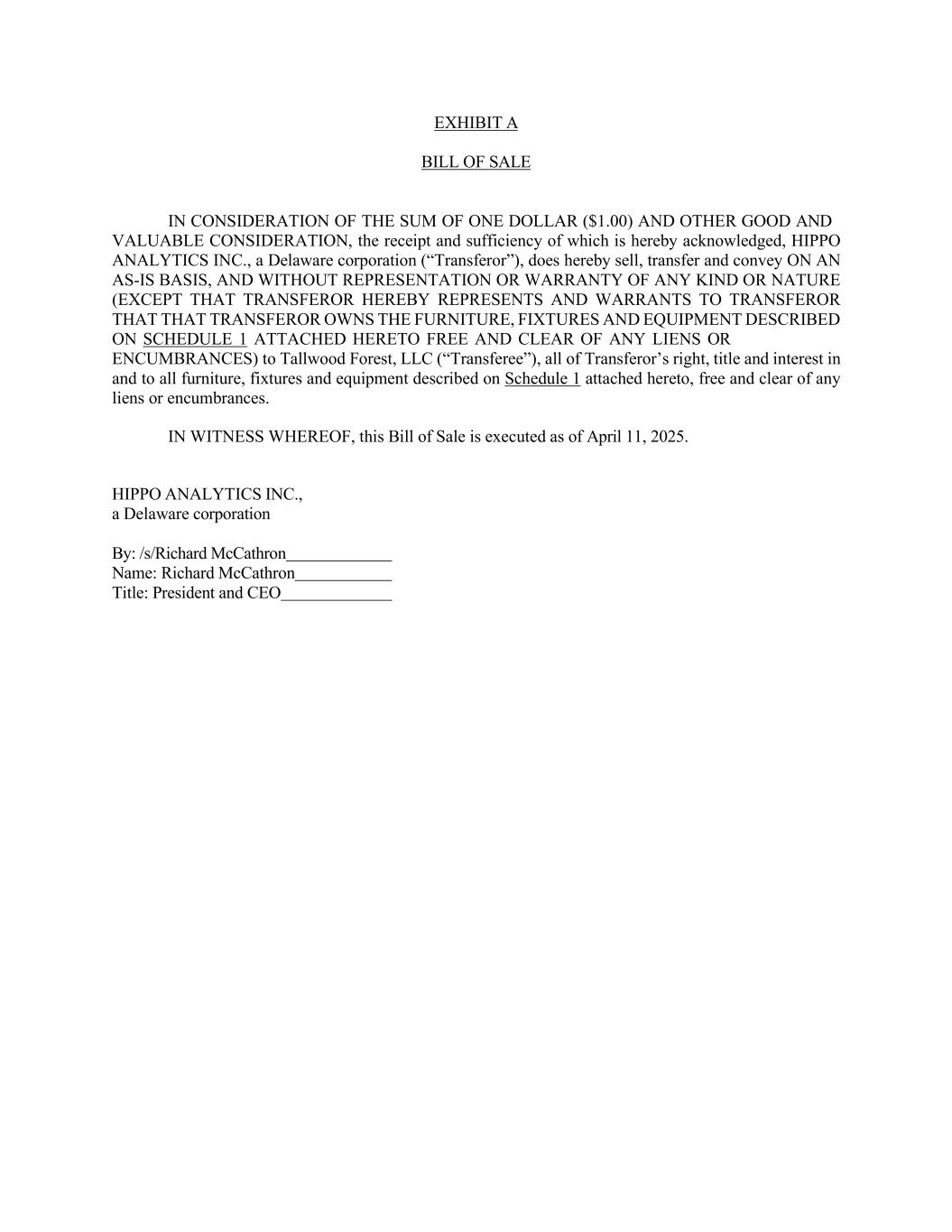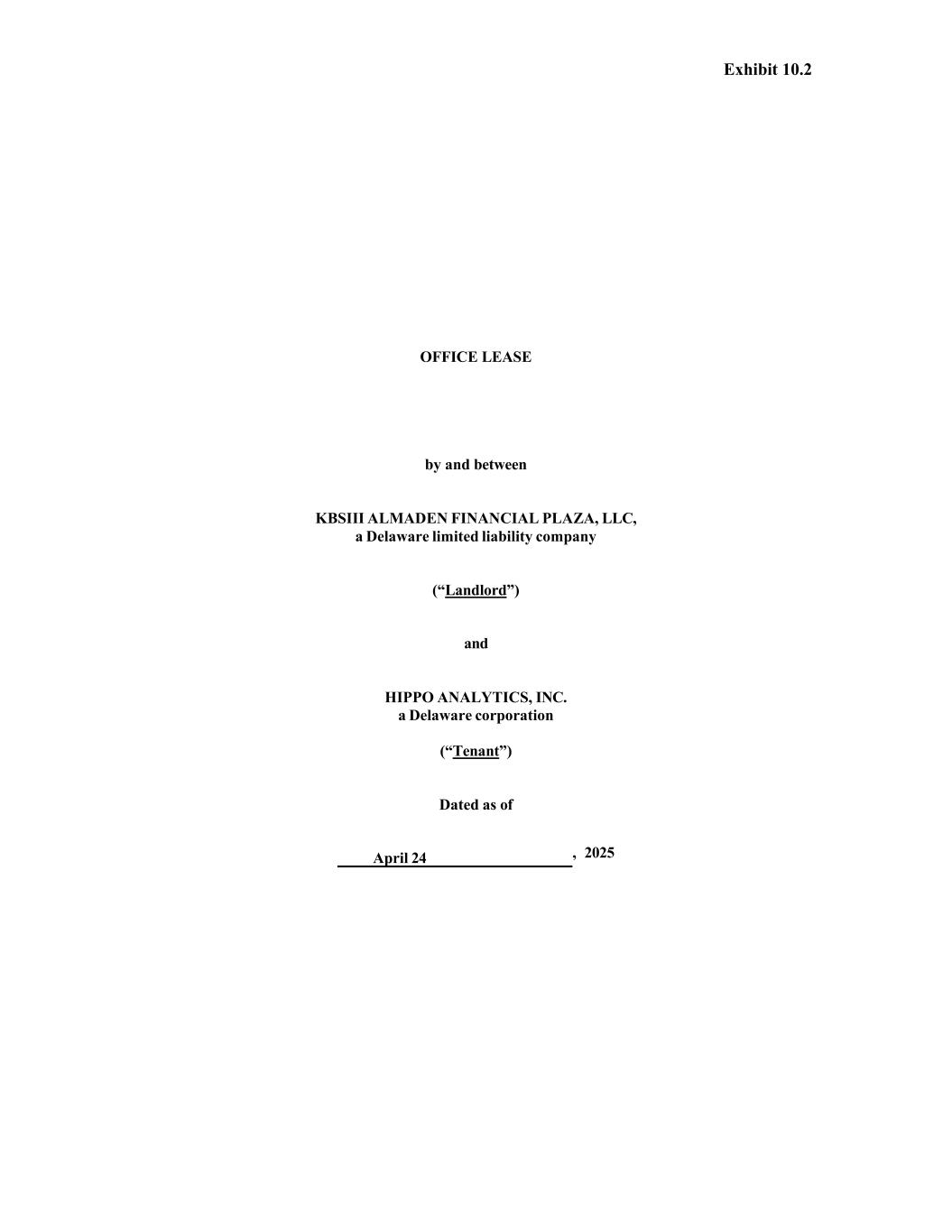 780148292.5 SIGNATURE PAGE TO OFFICE LEASE BY AND BETWEEN KBSIII ALMADEN FINANCIAL PLAZA, LLC, AS LANDLORD, AND HIPPO ANALYTICS INC., AS TENANT IN WITNESS WHEREOF, intended to be legally bound hereby, the parties hereto, by their duly authorized representatives, have executed and sealed this Lease with the intention that this Lease constitutes an instrument under seal, and that the parties have executed this Lease to be effective as of the Date of this Lease. “LANDLORD” KBSIII ALMADEN FINANCIAL PLAZA, LLC, a Delaware limited liability company By: KBS Capital Advisors, LLC, a Delaware limited liability company, as its authorized agent “TENANT” HIPPO ANALYTICS INC., a Delaware corporation By: Tim Helgeson, Senior Vice President By: Name: Title: Richard McCathron (Apr 23, 2025 16:57 CDT) Richard McCathron President & CEO