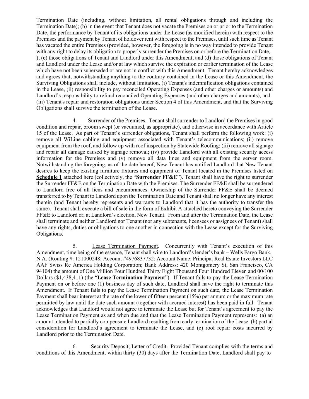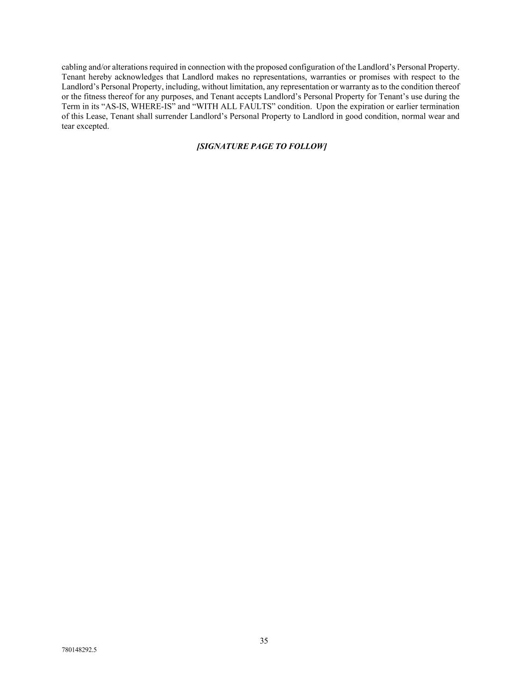 35 780148292.5 cabling and/or alterations required in connection with the proposed configuration of the Landlord’s Personal Property. Tenant hereby acknowledges that Landlord makes no representations, warranties or promises with respect to the Landlord’s Personal Property, including, without limitation, any representation or warranty as to the condition thereof or the fitness thereof for any purposes, and Tenant accepts Landlord’s Personal Property for Tenant’s use during the Term in its “AS-IS, WHERE-IS” and “WITH ALL FAULTS” condition. Upon the expiration or earlier termination of this Lease, Tenant shall surrender Landlord’s Personal Property to Landlord in good condition, normal wear and tear excepted. [SIGNATURE PAGE TO FOLLOW]