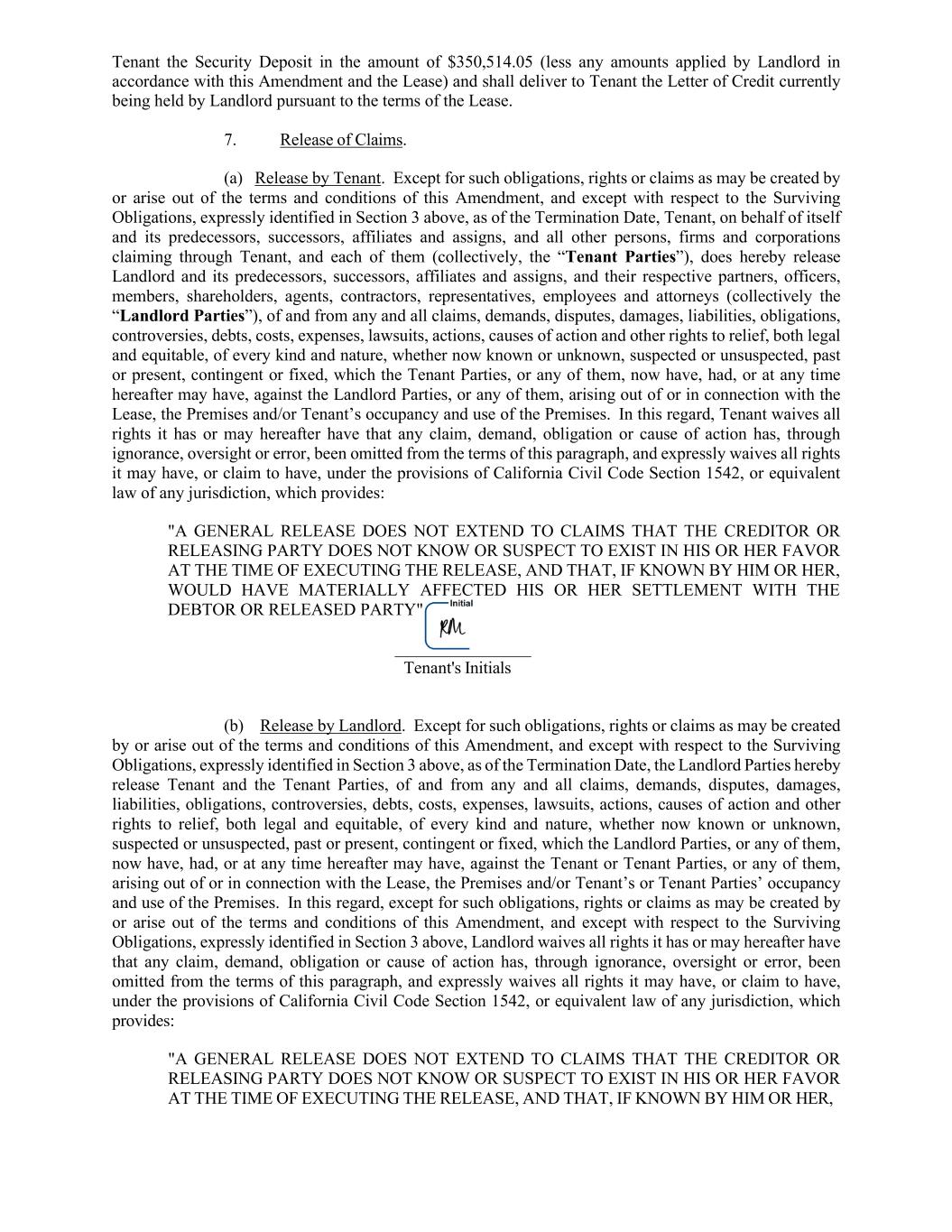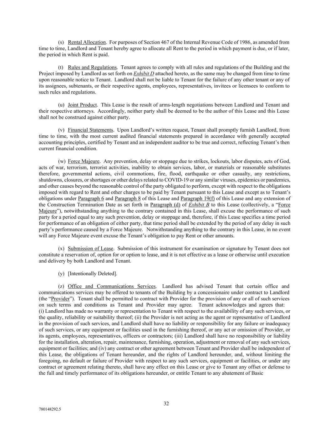 32 780148292.5 (s) Rental Allocation. For purposes of Section 467 of the Internal Revenue Code of 1986, as amended from time to time, Landlord and Tenant hereby agree to allocate all Rent to the period in which payment is due, or if later, the period in which Rent is paid. (t) Rules and Regulations. Tenant agrees to comply with all rules and regulations of the Building and the Project imposed by Landlord as set forth on Exhibit D attached hereto, as the same may be changed from time to time upon reasonable notice to Tenant. Landlord shall not be liable to Tenant for the failure of any other tenant or any of its assignees, subtenants, or their respective agents, employees, representatives, invitees or licensees to conform to such rules and regulations. (u) Joint Product. This Lease is the result of arms-length negotiations between Landlord and Tenant and their respective attorneys. Accordingly, neither party shall be deemed to be the author of this Lease and this Lease shall not be construed against either party. (v) Financial Statements. Upon Landlord’s written request, Tenant shall promptly furnish Landlord, from time to time, with the most current audited financial statements prepared in accordance with generally accepted accounting principles, certified by Tenant and an independent auditor to be true and correct, reflecting Tenant’s then current financial condition. (w) Force Majeure. Any prevention, delay or stoppage due to strikes, lockouts, labor disputes, acts of God, acts of war, terrorism, terrorist activities, inability to obtain services, labor, or materials or reasonable substitutes therefore, governmental actions, civil commotions, fire, flood, earthquake or other casualty, any restrictions, shutdowns, closures, or shortages or other delays related to COVID-19 or any similar viruses, epidemics or pandemics, and other causes beyond the reasonable control of the party obligated to perform, except with respect to the obligations imposed with regard to Rent and other charges to be paid by Tenant pursuant to this Lease and except as to Tenant’s obligations under Paragraph 6 and Paragraph 8 of this Lease and Paragraph 19(f) of this Lease and any extension of the Construction Termination Date as set forth in Paragraph (d) of Exhibit B to this Lease (collectively, a “Force Majeure”), notwithstanding anything to the contrary contained in this Lease, shall excuse the performance of such party for a period equal to any such prevention, delay or stoppage and, therefore, if this Lease specifies a time period for performance of an obligation of either party, that time period shall be extended by the period of any delay in such party’s performance caused by a Force Majeure. Notwithstanding anything to the contrary in this Lease, in no event will any Force Majeure event excuse the Tenant’s obligation to pay Rent or other amounts. (x) Submission of Lease. Submission of this instrument for examination or signature by Tenant does not constitute a reservation of, option for or option to lease, and it is not effective as a lease or otherwise until execution and delivery by both Landlord and Tenant. (y) [Intentionally Deleted]. (z) Office and Communications Services. Landlord has advised Tenant that certain office and communications services may be offered to tenants of the Building by a concessionaire under contract to Landlord (the “Provider”). Tenant shall be permitted to contract with Provider for the provision of any or all of such services on such terms and conditions as Tenant and Provider may agree. Tenant acknowledges and agrees that: (i) Landlord has made no warranty or representation to Tenant with respect to the availability of any such services, or the quality, reliability or suitability thereof; (ii) the Provider is not acting as the agent or representative of Landlord in the provision of such services, and Landlord shall have no liability or responsibility for any failure or inadequacy of such services, or any equipment or facilities used in the furnishing thereof, or any act or omission of Provider, or its agents, employees, representatives, officers or contractors; (iii) Landlord shall have no responsibility or liability for the installation, alteration, repair, maintenance, furnishing, operation, adjustment or removal of any such services, equipment or facilities; and (iv) any contract or other agreement between Tenant and Provider shall be independent of this Lease, the obligations of Tenant hereunder, and the rights of Landlord hereunder, and, without limiting the foregoing, no default or failure of Provider with respect to any such services, equipment or facilities, or under any contract or agreement relating thereto, shall have any effect on this Lease or give to Tenant any offset or defense to the full and timely performance of its obligations hereunder, or entitle Tenant to any abatement of Basic