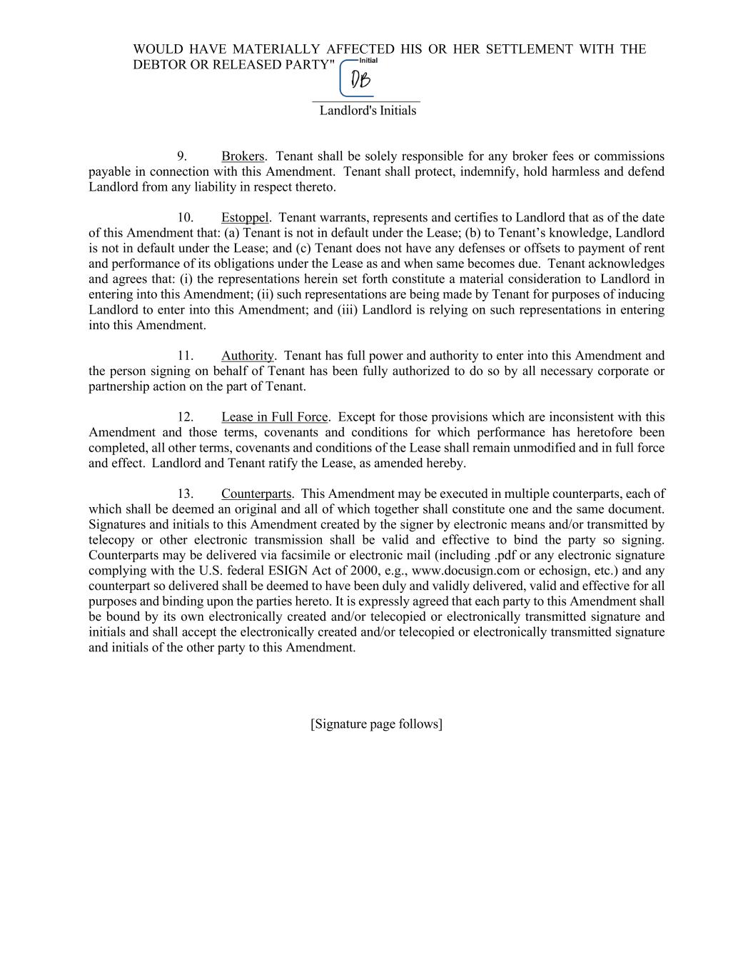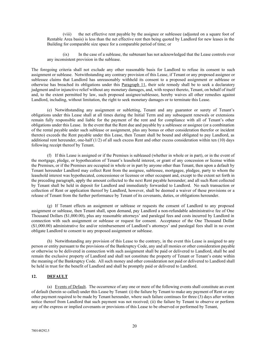 20 780148292.5 (viii) the net effective rent payable by the assignee or sublessee (adjusted on a square foot of Rentable Area basis) is less than the net effective rent then being quoted by Landlord for new leases in the Building for comparable size space for a comparable period of time; or (ix) In the case of a sublease, the subtenant has not acknowledged that the Lease controls over any inconsistent provision in the sublease. The foregoing criteria shall not exclude any other reasonable basis for Landlord to refuse its consent to such assignment or sublease. Notwithstanding any contrary provision of this Lease, if Tenant or any proposed assignee or sublessee claims that Landlord has unreasonably withheld its consent to a proposed assignment or sublease or otherwise has breached its obligations under this Paragraph 11, their sole remedy shall be to seek a declaratory judgment and/or injunctive relief without any monetary damages, and, with respect thereto, Tenant, on behalf of itself and, to the extent permitted by law, such proposed assignee/sublessee, hereby waives all other remedies against Landlord, including, without limitation, the right to seek monetary damages or to terminate this Lease. (e) Notwithstanding any assignment or subletting, Tenant and any guarantor or surety of Tenant’s obligations under this Lease shall at all times during the Initial Term and any subsequent renewals or extensions remain fully responsible and liable for the payment of the rent and for compliance with all of Tenant’s other obligations under this Lease. In the event that the Rent due and payable by a sublessee or assignee (or a combination of the rental payable under such sublease or assignment, plus any bonus or other consideration therefor or incident thereto) exceeds the Rent payable under this Lease, then Tenant shall be bound and obligated to pay Landlord, as additional rent hereunder, one-half (1/2) of all such excess Rent and other excess consideration within ten (10) days following receipt thereof by Tenant. (f) If this Lease is assigned or if the Premises is subleased (whether in whole or in part), or in the event of the mortgage, pledge, or hypothecation of Tenant’s leasehold interest, or grant of any concession or license within the Premises, or if the Premises are occupied in whole or in part by anyone other than Tenant, then upon a default by Tenant hereunder Landlord may collect Rent from the assignee, sublessee, mortgagee, pledgee, party to whom the leasehold interest was hypothecated, concessionee or licensee or other occupant and, except to the extent set forth in the preceding paragraph, apply the amount collected to the next Rent payable hereunder; and all such Rent collected by Tenant shall be held in deposit for Landlord and immediately forwarded to Landlord. No such transaction or collection of Rent or application thereof by Landlord, however, shall be deemed a waiver of these provisions or a release of Tenant from the further performance by Tenant of its covenants, duties, or obligations hereunder. (g) If Tenant effects an assignment or sublease or requests the consent of Landlord to any proposed assignment or sublease, then Tenant shall, upon demand, pay Landlord a non-refundable administrative fee of One Thousand Dollars ($1,000.00), plus any reasonable attorneys’ and paralegal fees and costs incurred by Landlord in connection with such assignment or sublease or request for consent. Acceptance of the One Thousand Dollar ($1,000.00) administrative fee and/or reimbursement of Landlord’s attorneys’ and paralegal fees shall in no event obligate Landlord to consent to any proposed assignment or sublease. (h) Notwithstanding any provision of this Lease to the contrary, in the event this Lease is assigned to any person or entity pursuant to the provisions of the Bankruptcy Code, any and all monies or other consideration payable or otherwise to be delivered in connection with such assignment shall be paid or delivered to Landlord, shall be and remain the exclusive property of Landlord and shall not constitute the property of Tenant or Tenant’s estate within the meaning of the Bankruptcy Code. All such money and other consideration not paid or delivered to Landlord shall be held in trust for the benefit of Landlord and shall be promptly paid or delivered to Landlord. 12. DEFAULT (a) Events of Default. The occurrence of any one or more of the following events shall constitute an event of default (herein so called) under this Lease by Tenant: (i) the failure by Tenant to make any payment of Rent or any other payment required to be made by Tenant hereunder, where such failure continues for three (3) days after written notice thereof from Landlord that such payment was not received; (ii) the failure by Tenant to observe or perform any of the express or implied covenants or provisions of this Lease to be observed or performed by Tenant,
